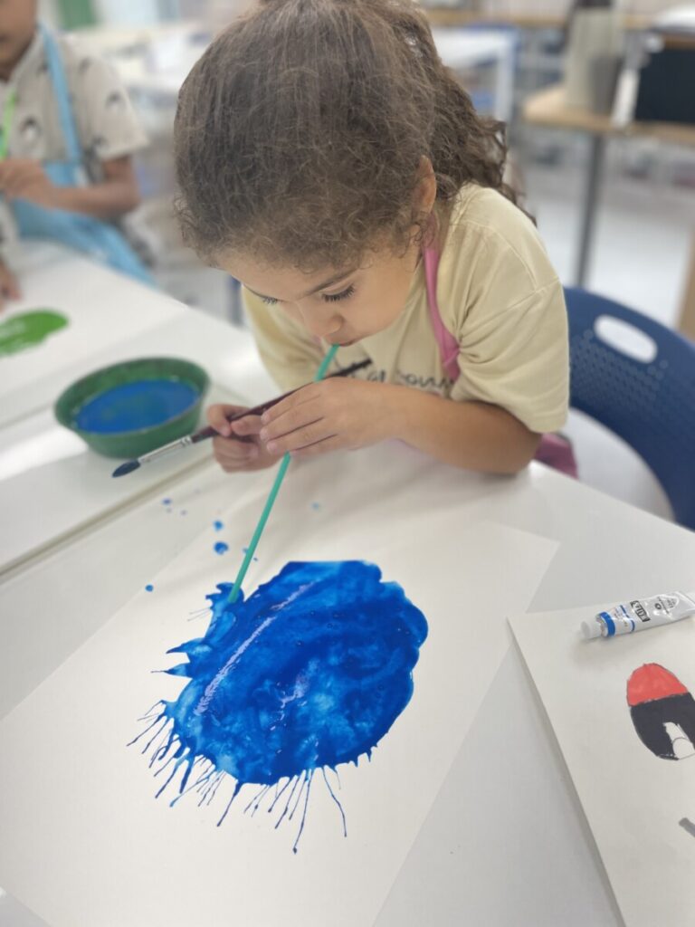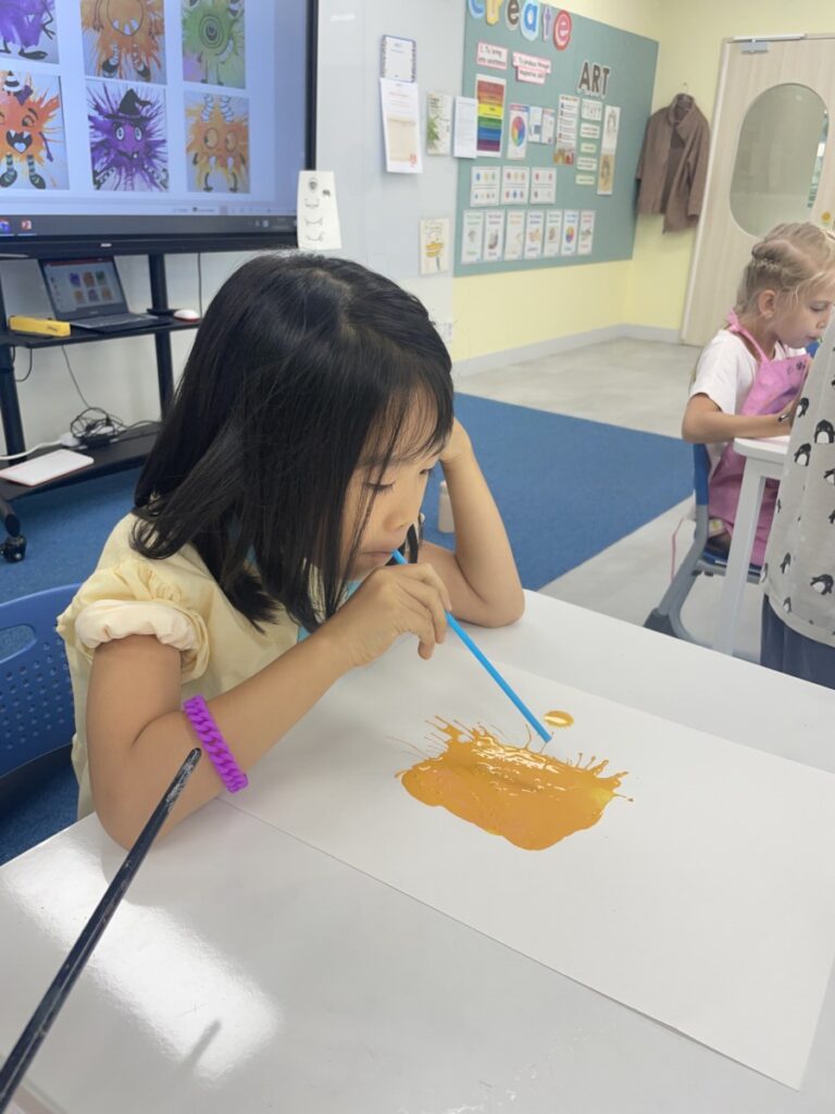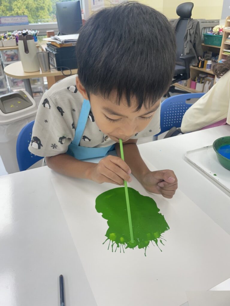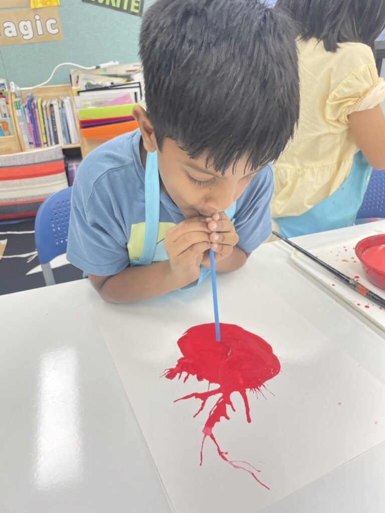 Using straws, the children blew paint across their paper to create fun and surprising shapes.