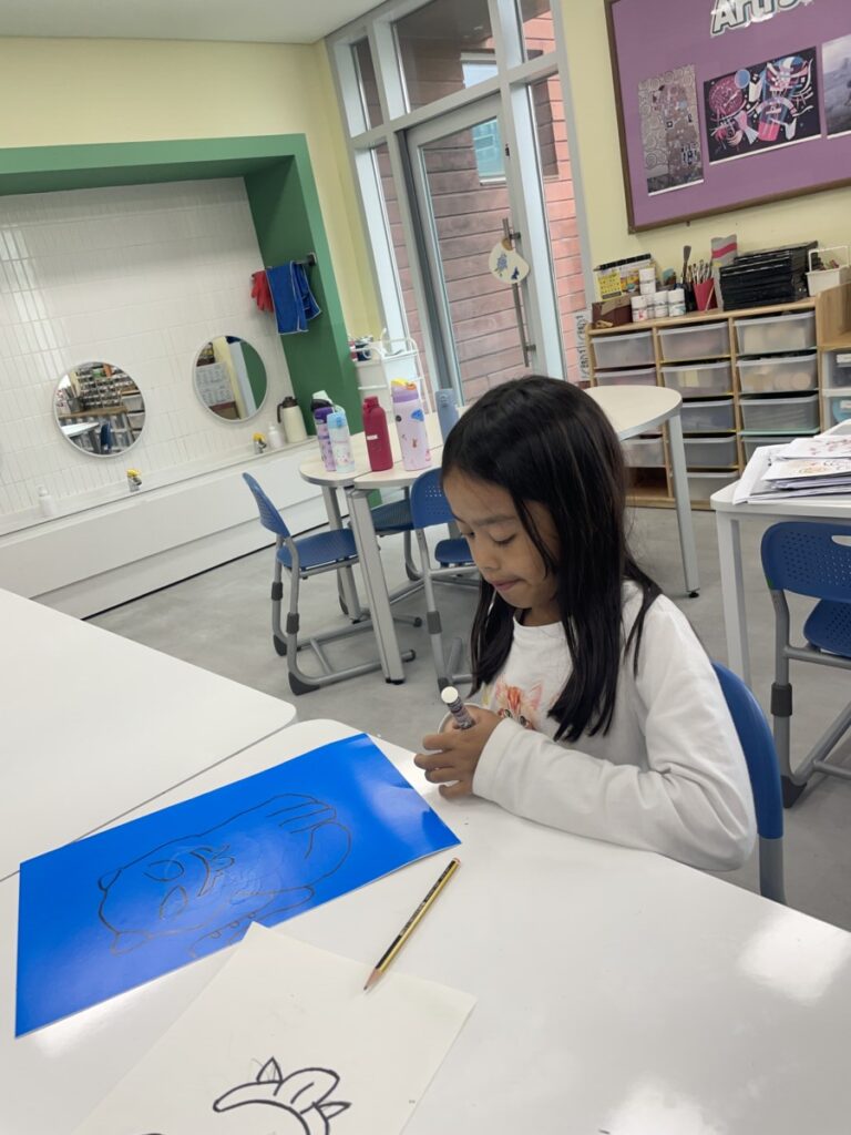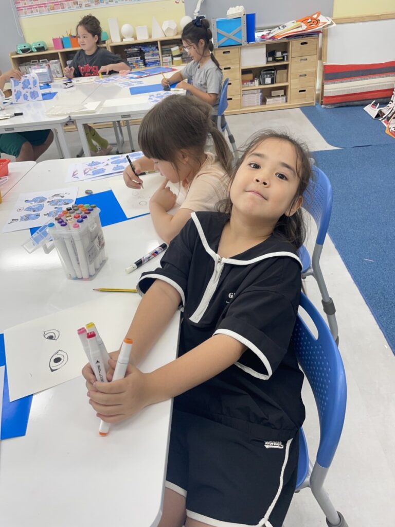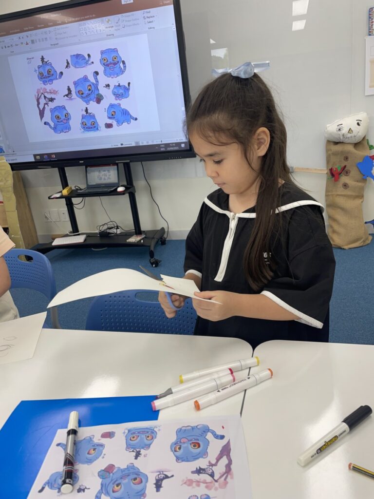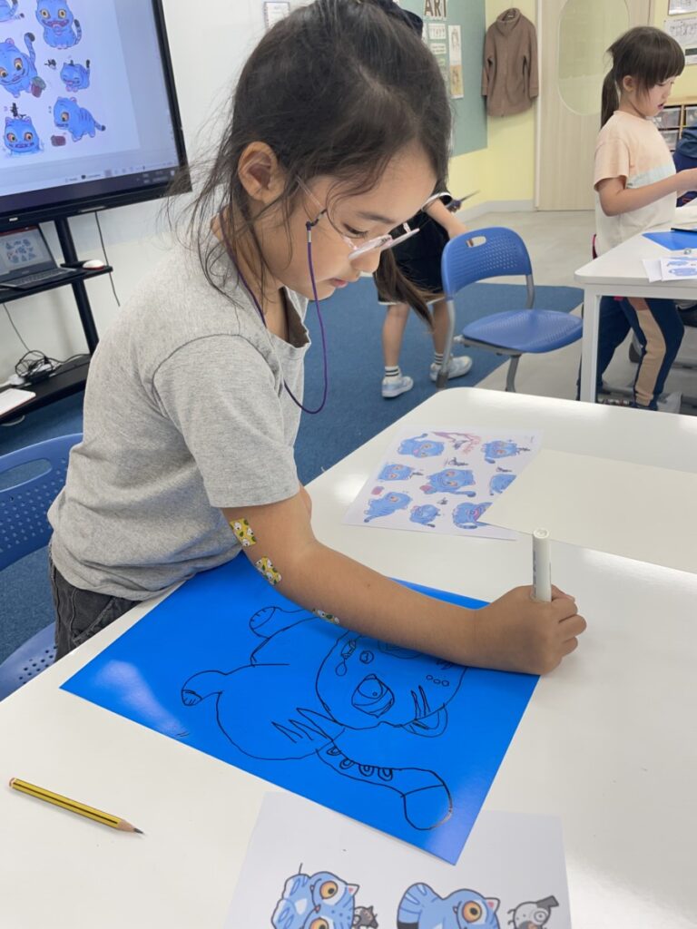Although some students found it challenging at first, they learned how to draw character poses and were able to complete their work with joy and confidence.