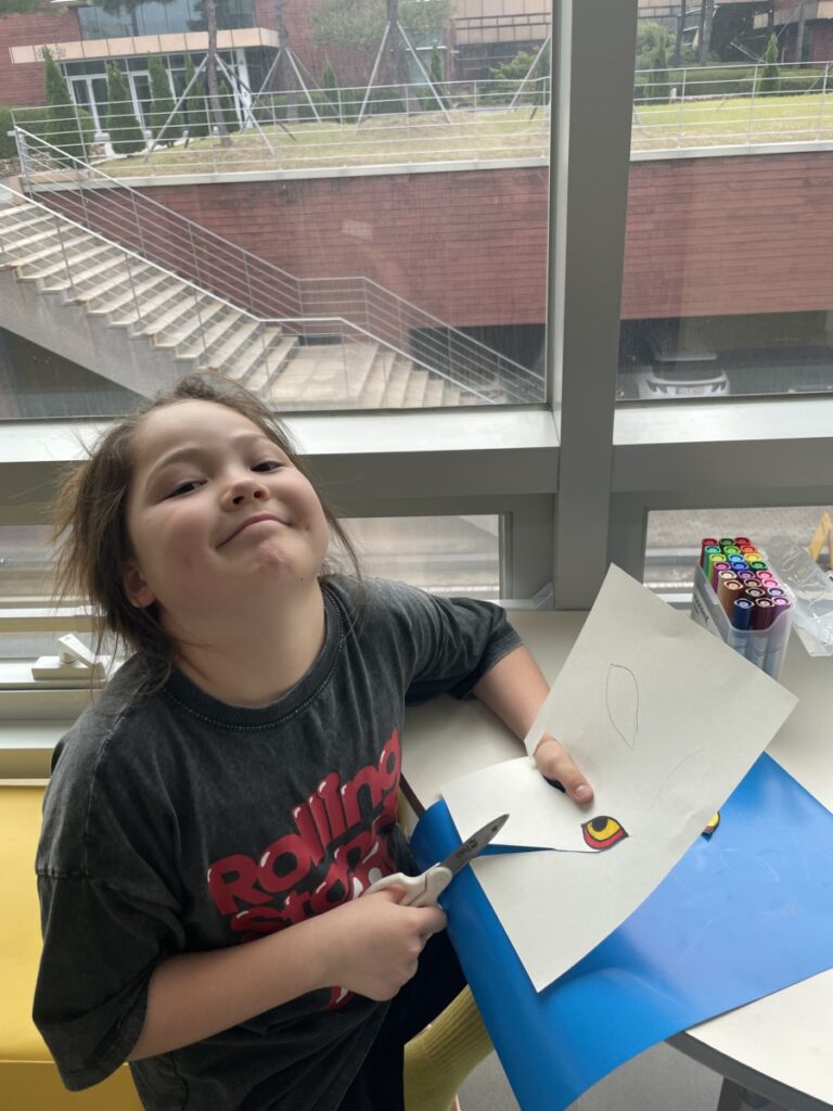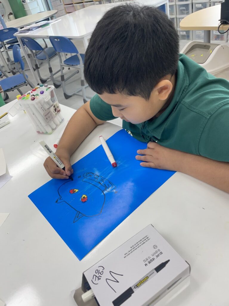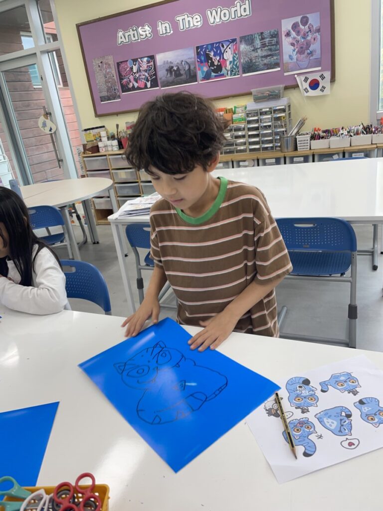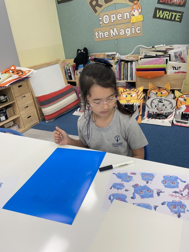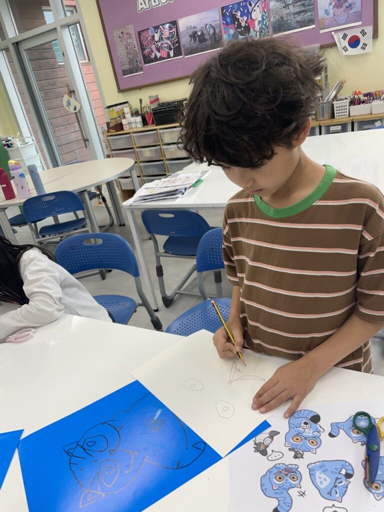 This week we spent time drawing the K-pop Demon Hunters character, Derpy. Instead of the traditional brown-toned tiger seen in Korean folk paintings, students created a blue character and completed it with a variety of poses. They also added a magpie wearing a traditional Korean gat (hat).