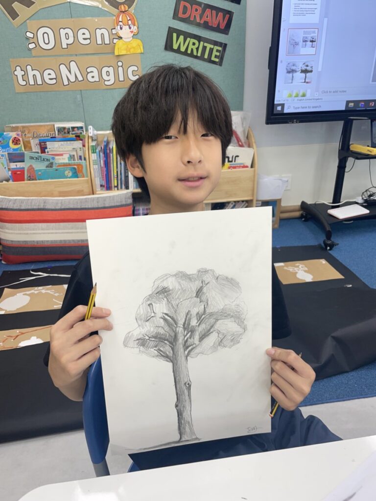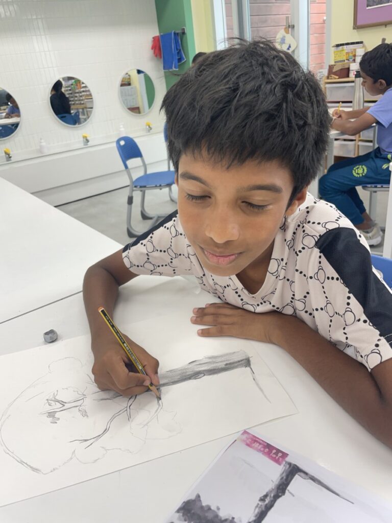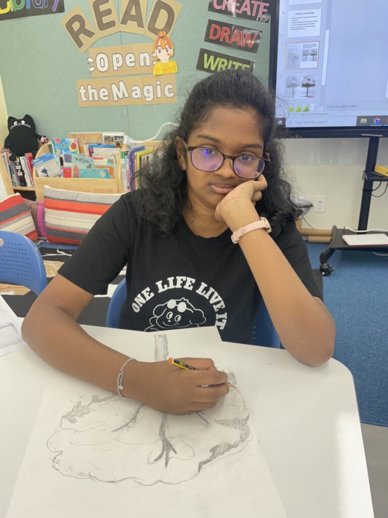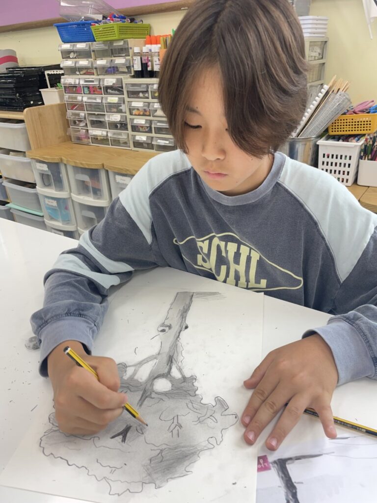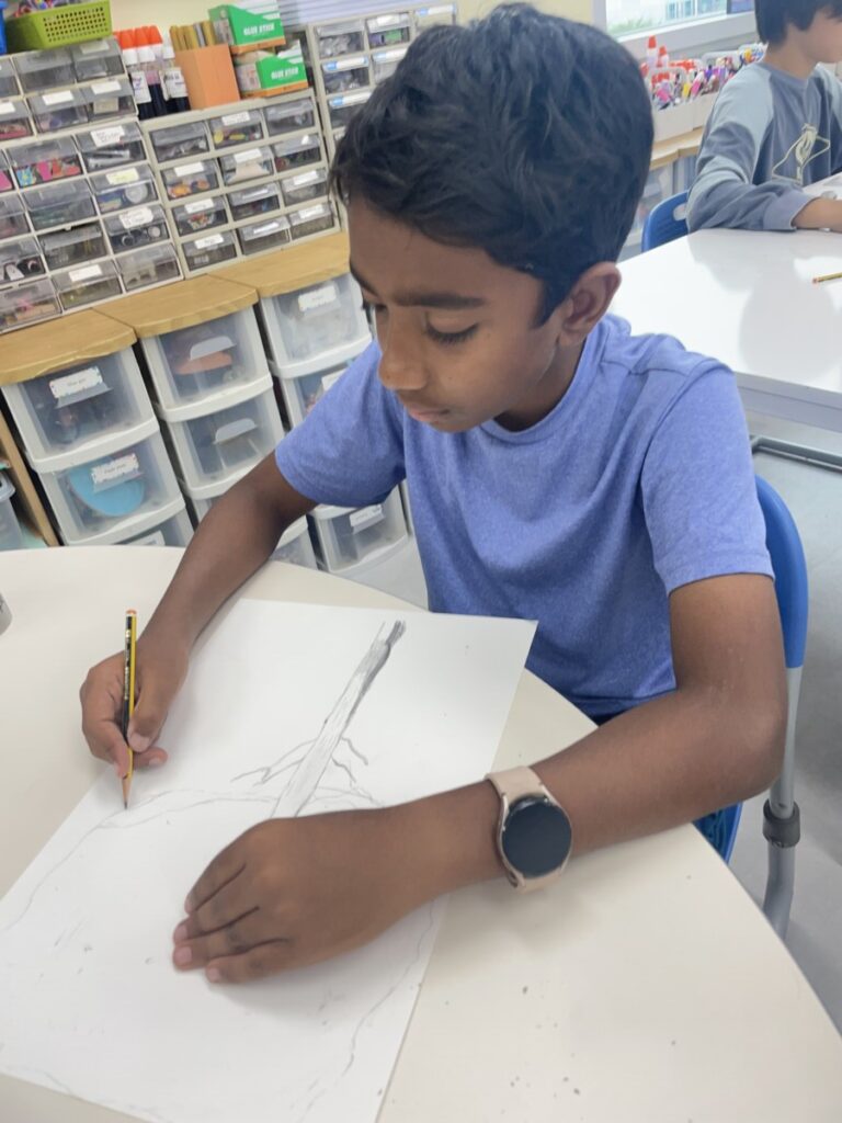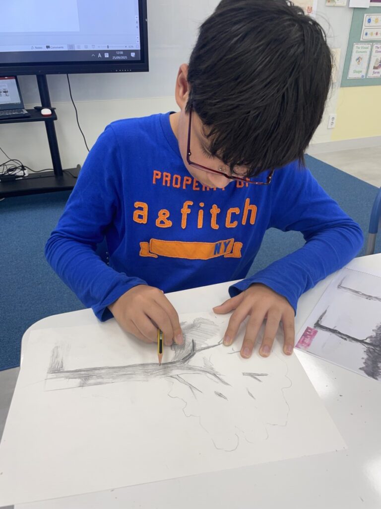 Students worked thoughtfully, adding shading to their sketches and discovering how shapes and lines can build the texture of bark and the volume of leaves. I look forward to seeing their completed artworks in our next lesson.