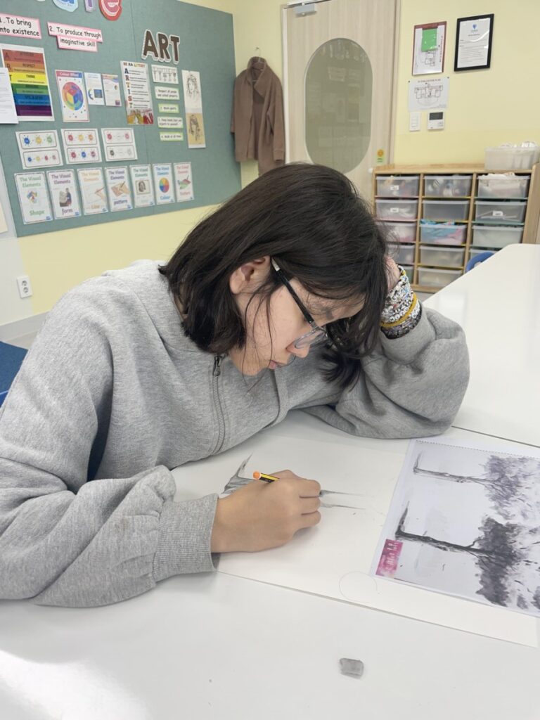 Today, we applied these skills to drawing trees. A tree is not just a trunk with leaves—it comes alive when we observe the details of light and shadow. We looked carefully at how the direction of light changes the tones, creating highlights and darker areas that make the tree look three-dimensional.
