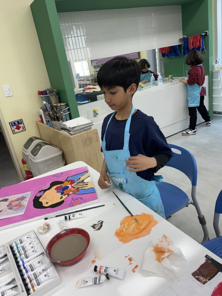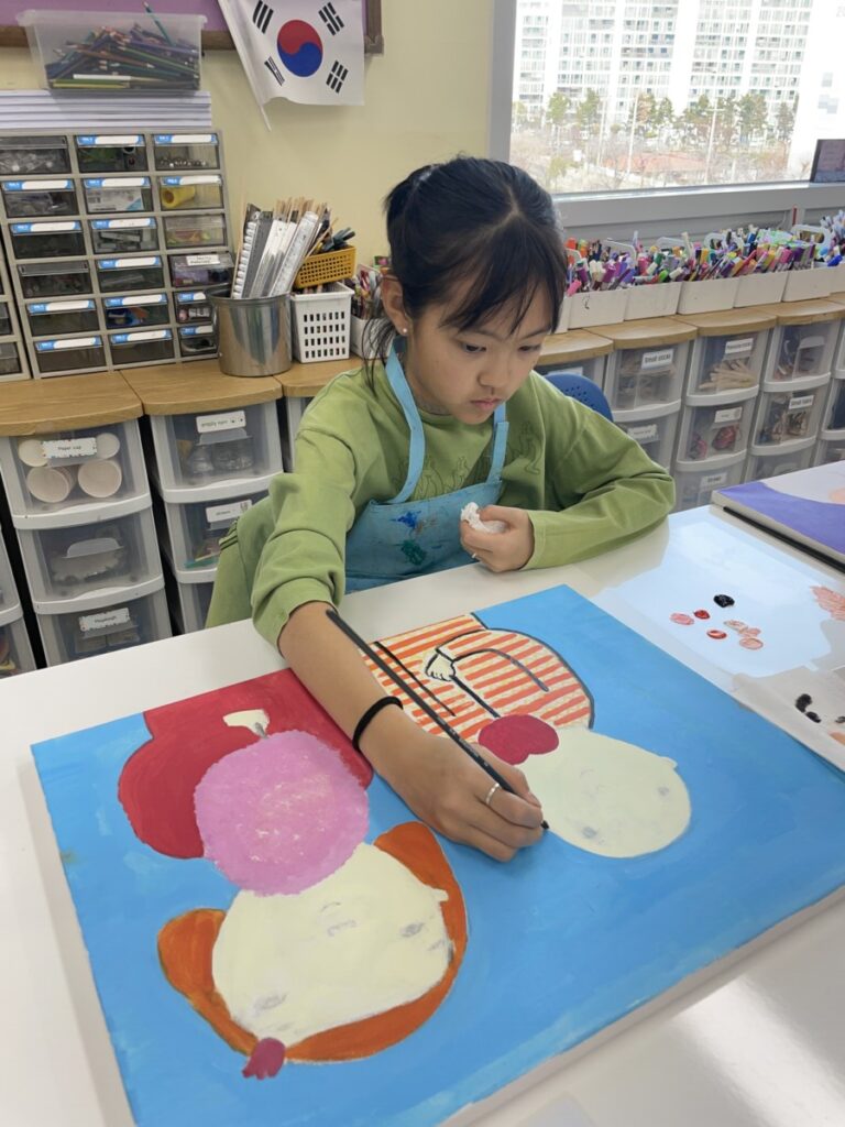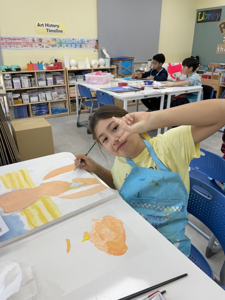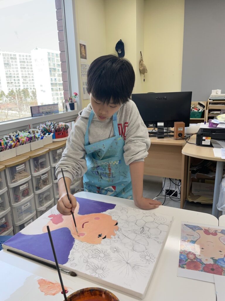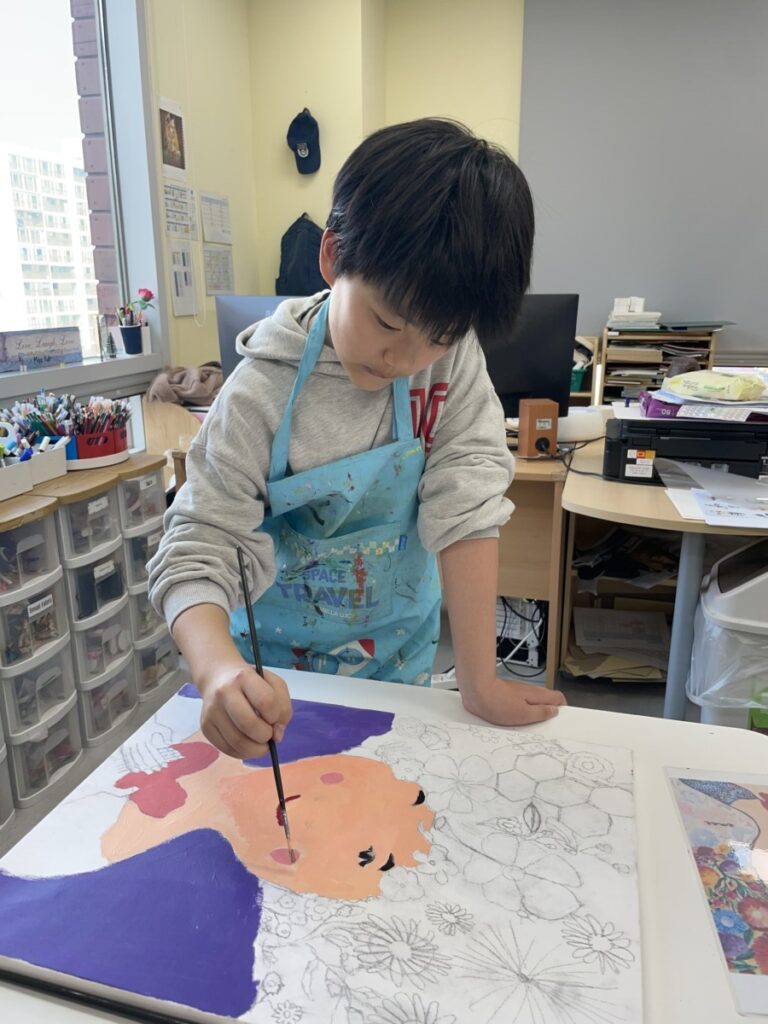 Students focused on developing and completing the large canvas paintings they began last week. They continued using acrylic paint to carefully build colours, refine facial expressions, and add details inspired by the warm and emotional atmosphere often seen in Eva Armisen’s artworks.