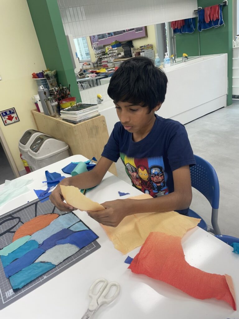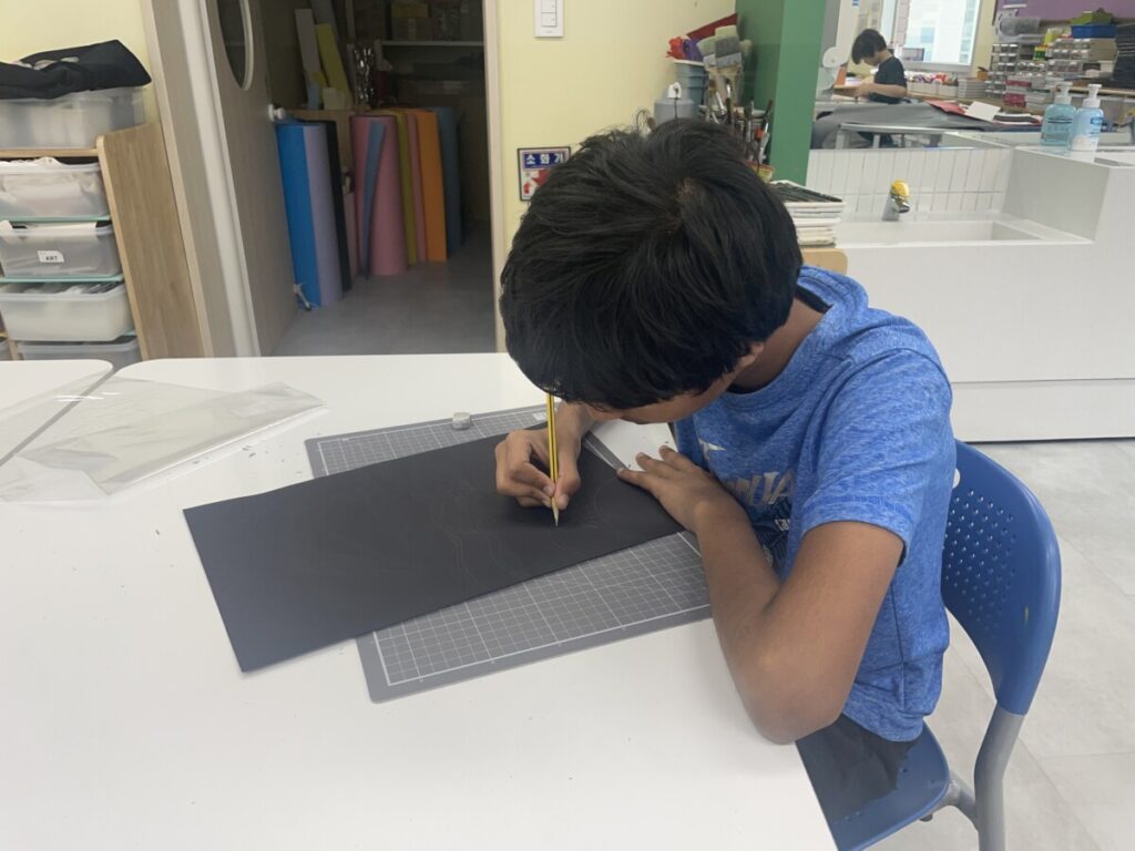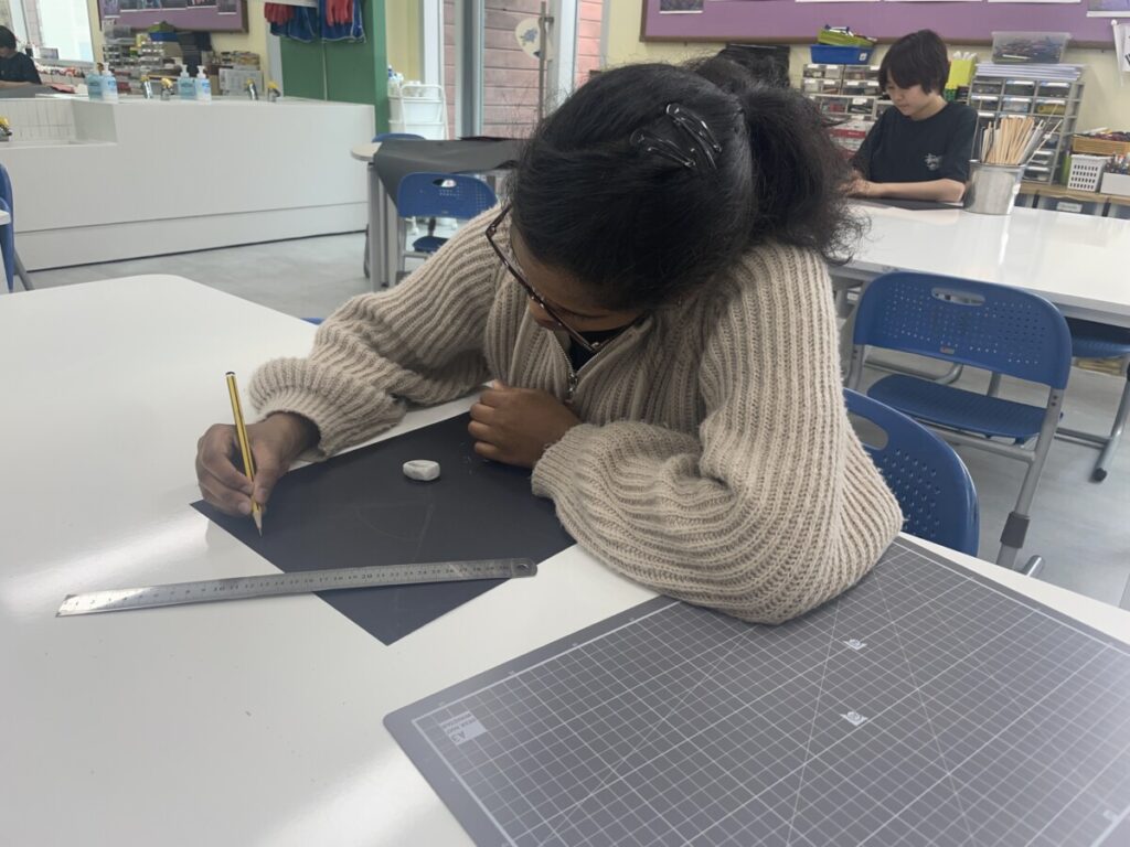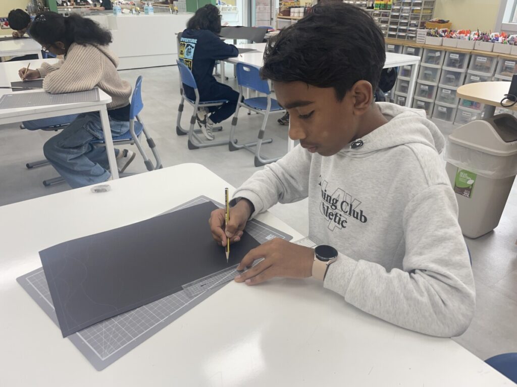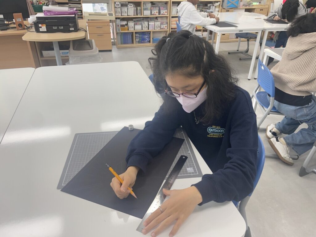 Students focused on creating patterns and compositions, choosing one of two themes: sunrise or mountain.