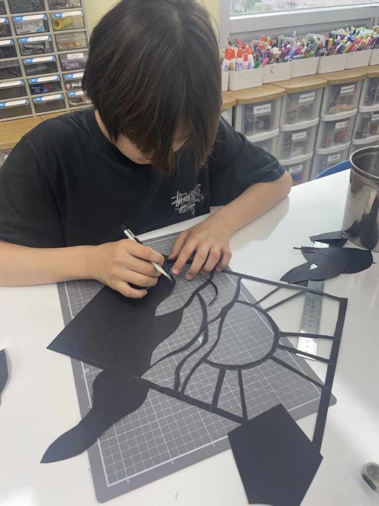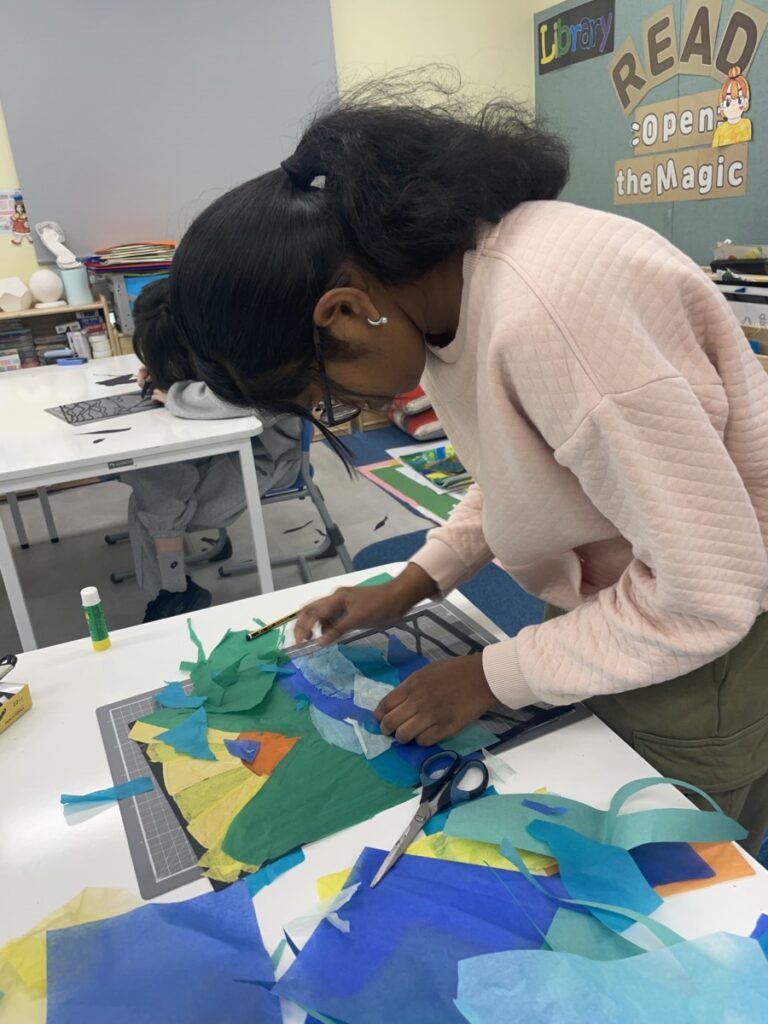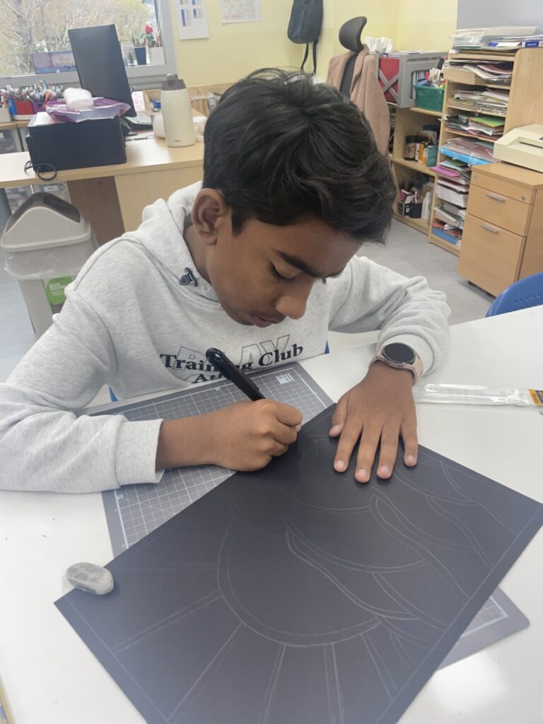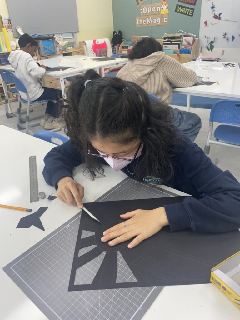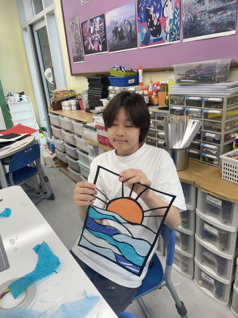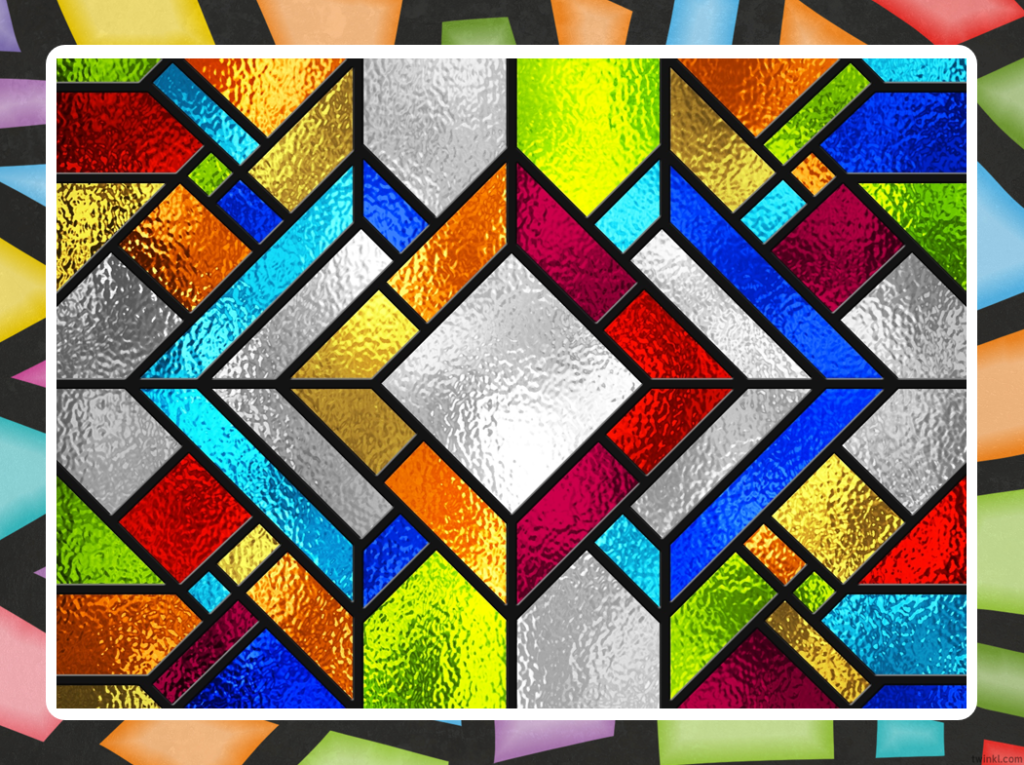 Next week, based on this experience, students will choose their own theme and continue developing their stained glass–inspired project.