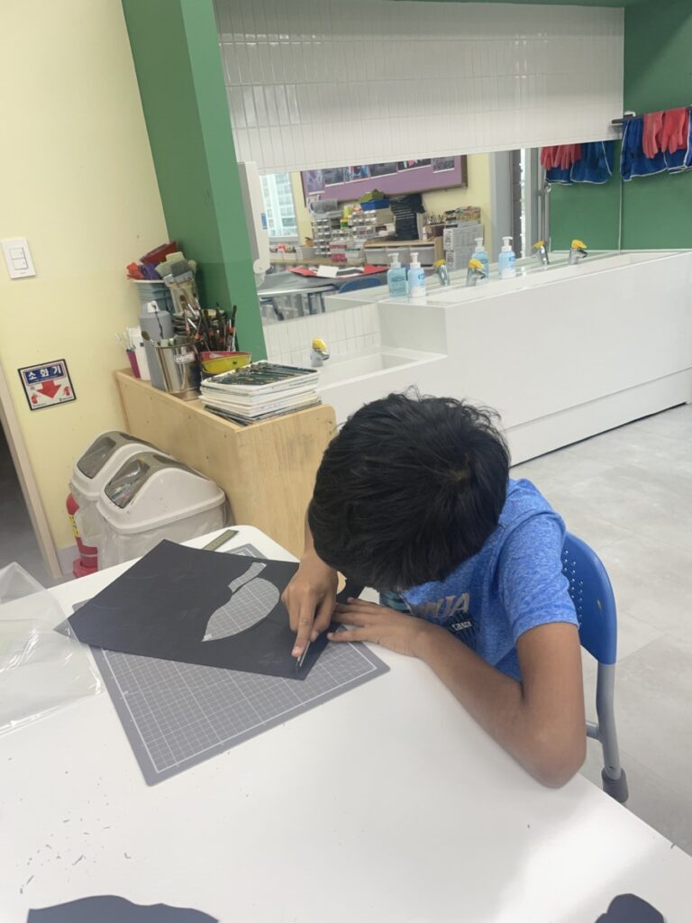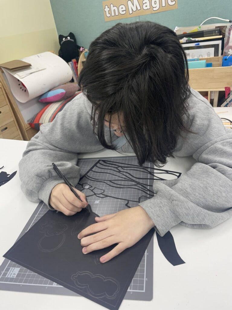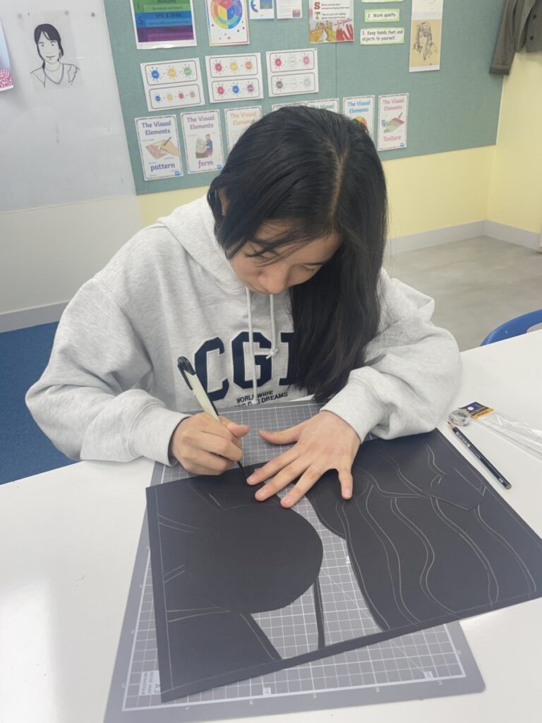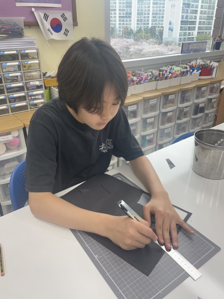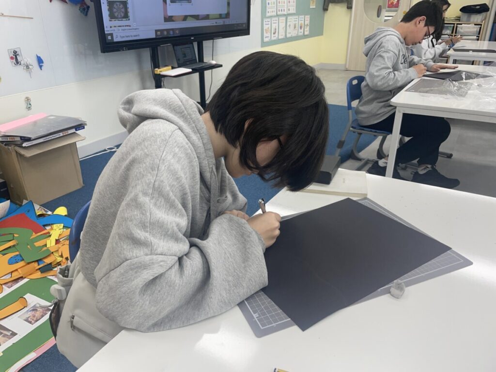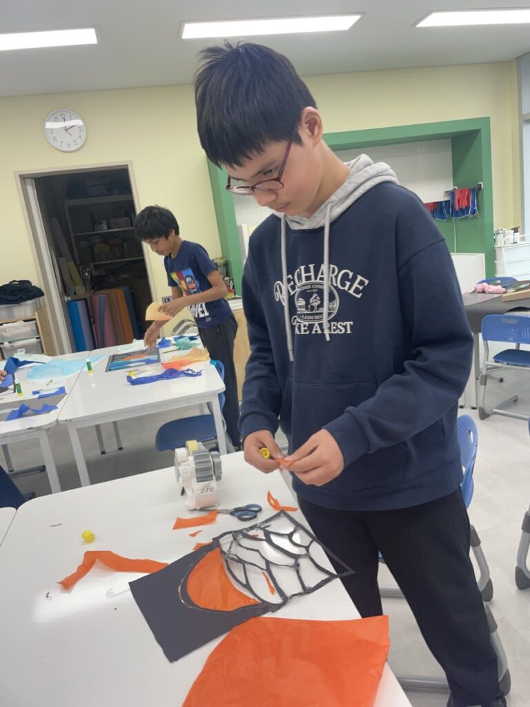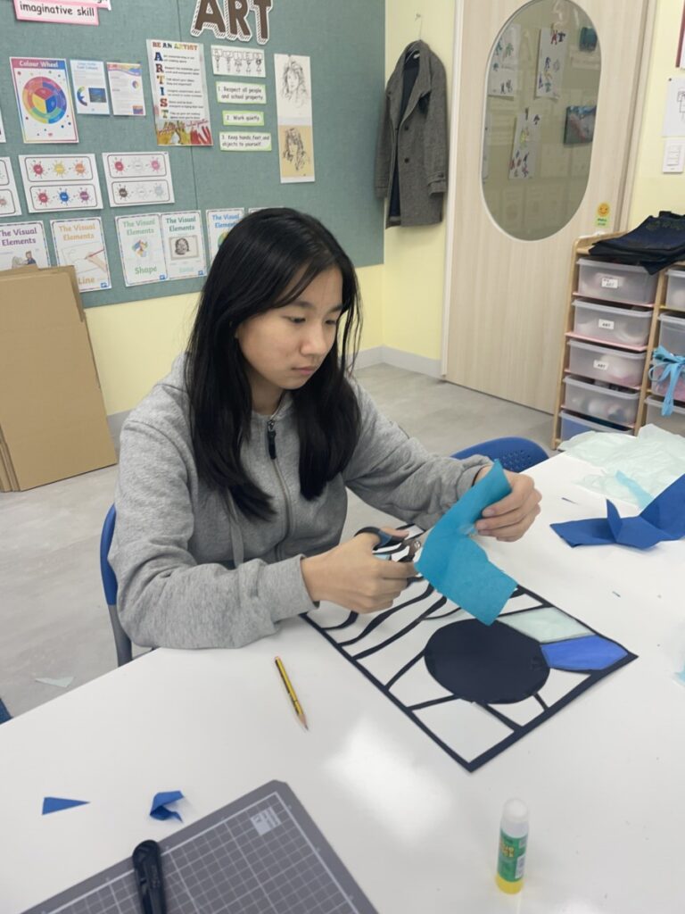 Next week, based on this experience, students will choose their own theme and continue developing their stained glass–inspired project.