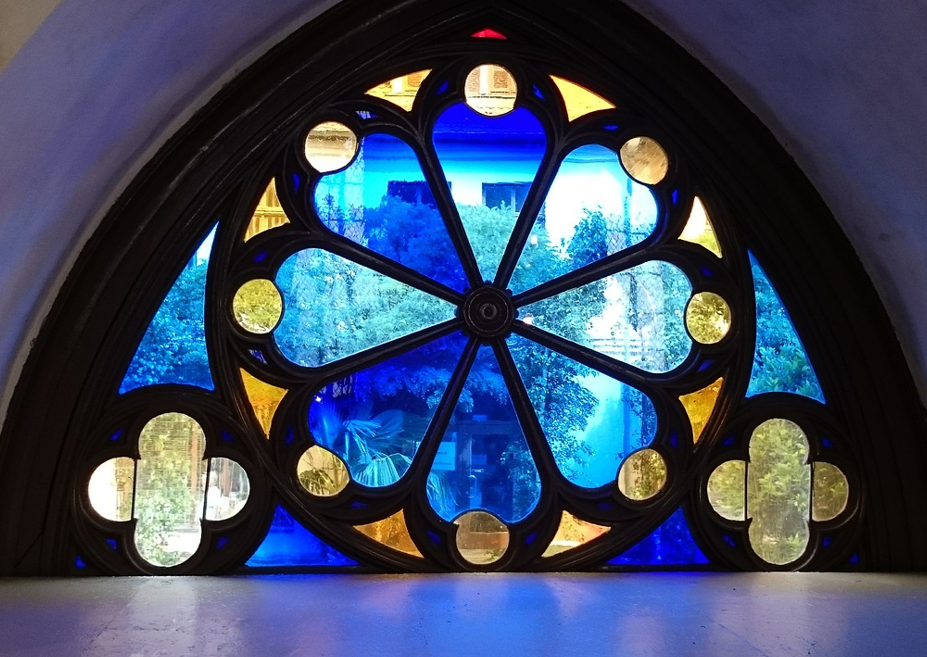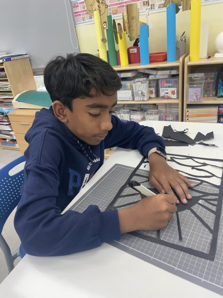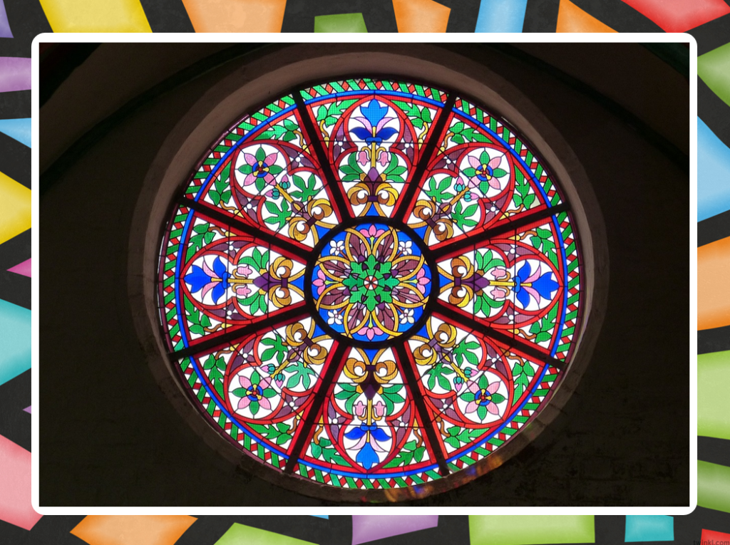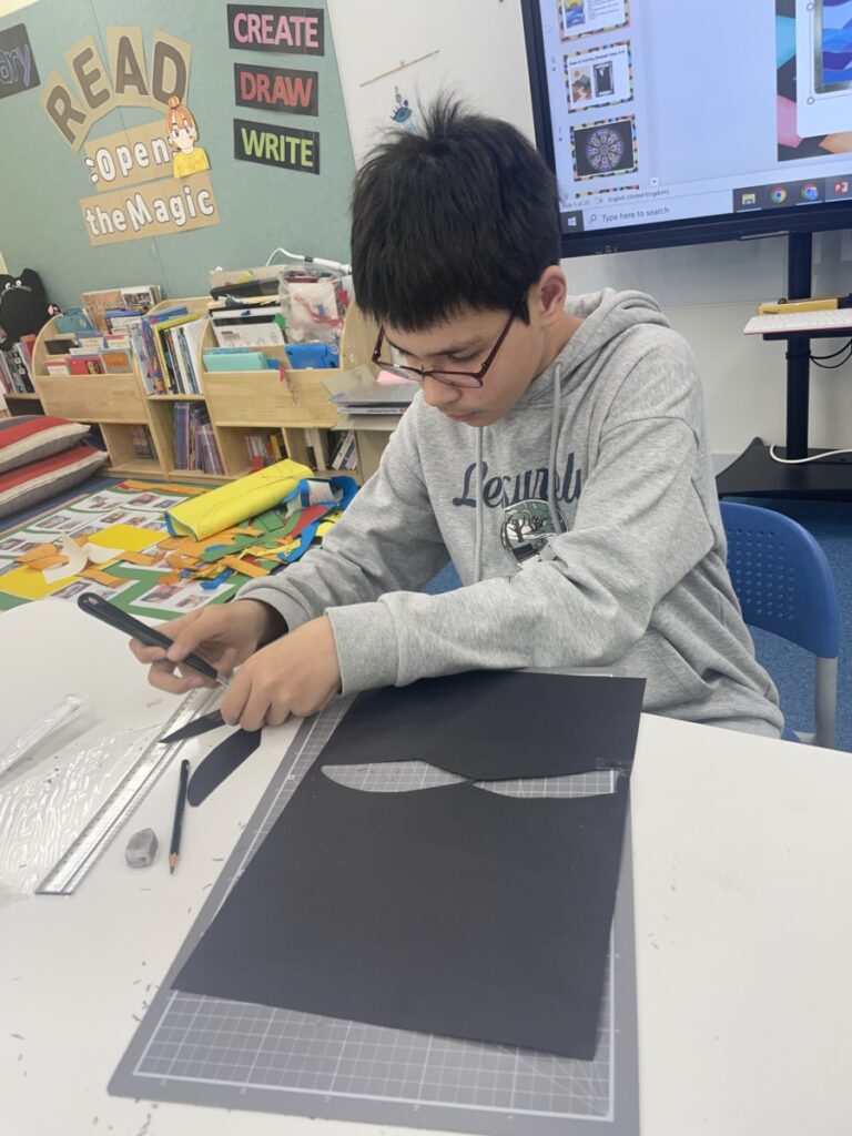 For the activity, instead of using glass, students created stained glass–inspired artwork using black paper and tissue paper. The cut-out sections were filled with various colours of tissue paper to mimic the effect of light passing through stained glass.