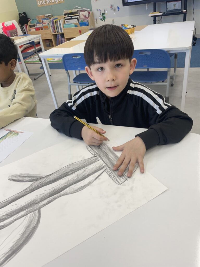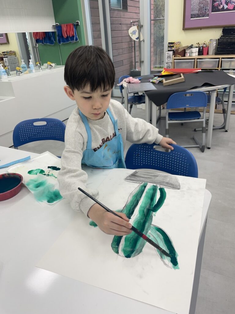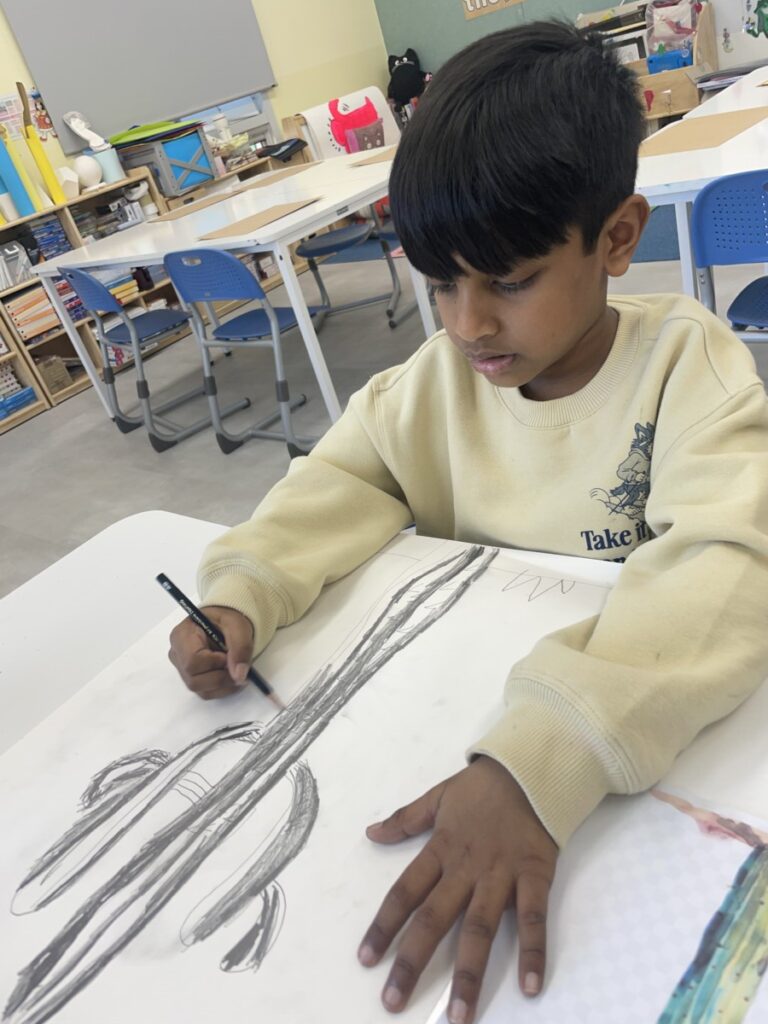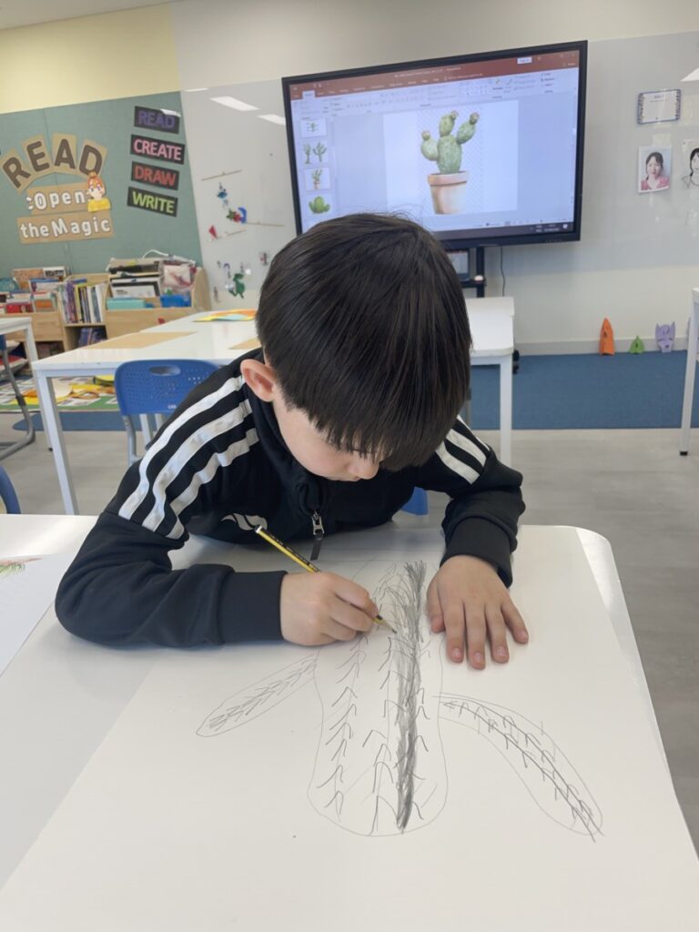This week, our young artists worked on cactus-themed sketching. We explored where cactuses grow, how they develop, and how their body parts are structured through discussion.