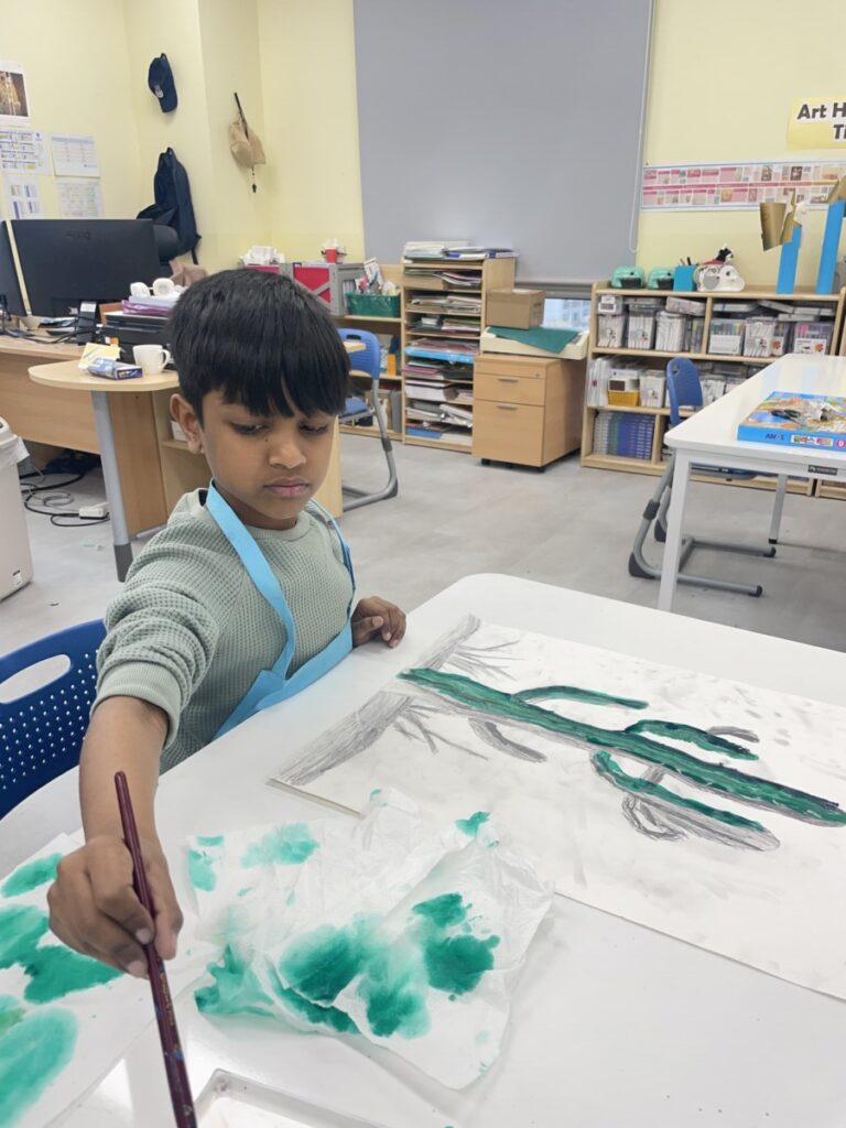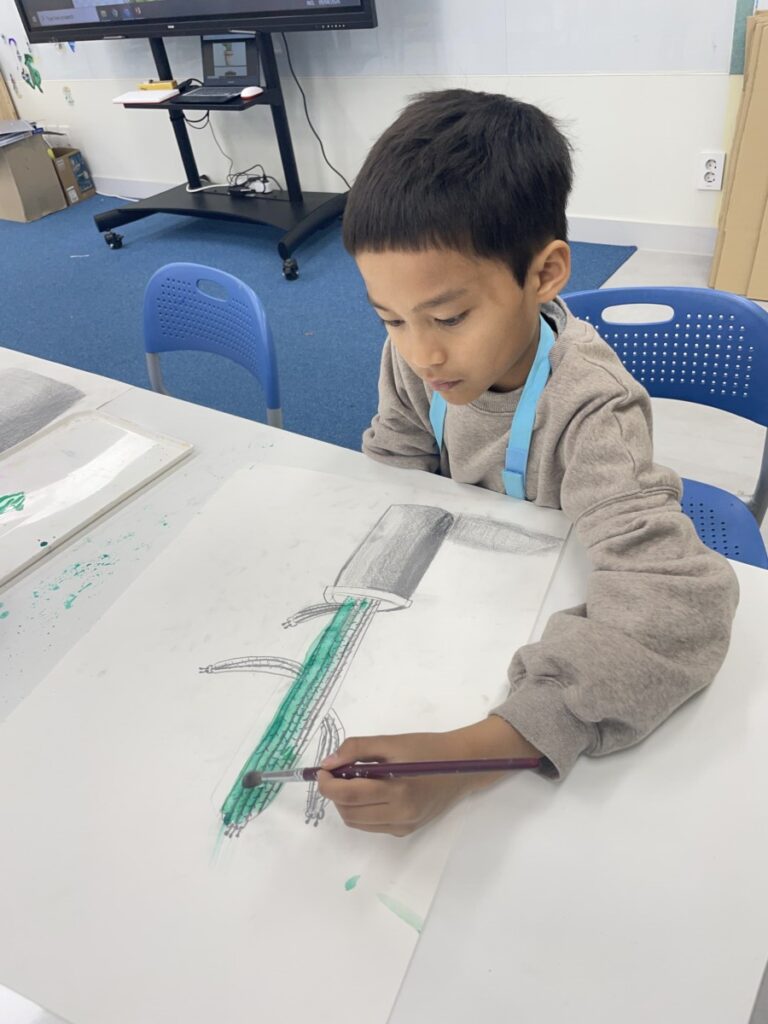 The children observed how light affects colour and practised using pencil tones to create shading and a sense of three-dimensional form. They then used paint to apply colour, adjusting brightness to enhance depth.