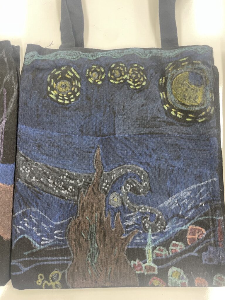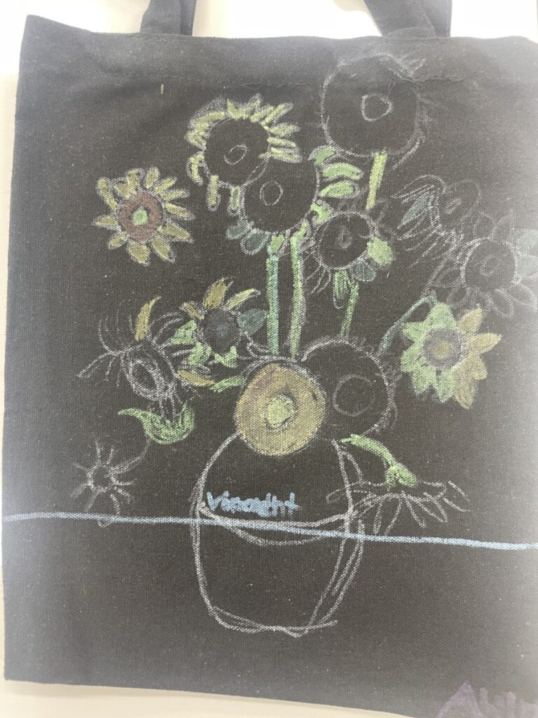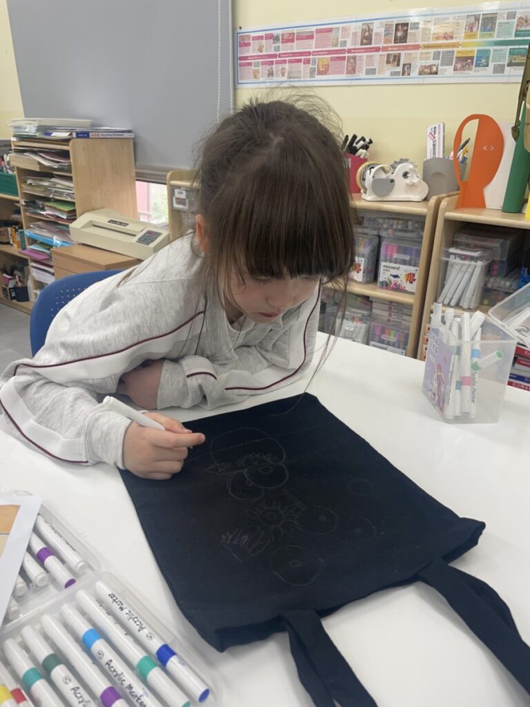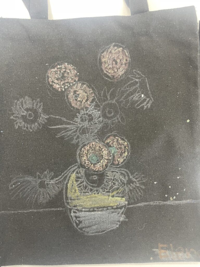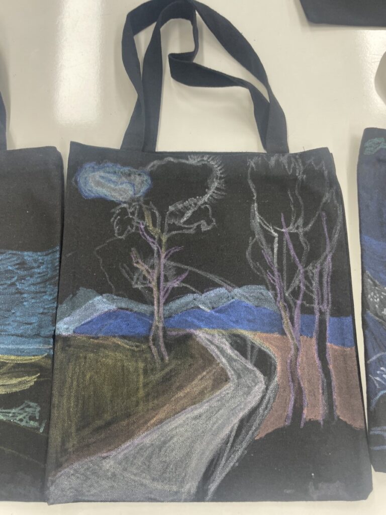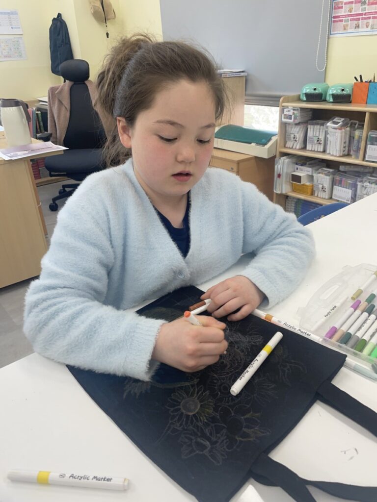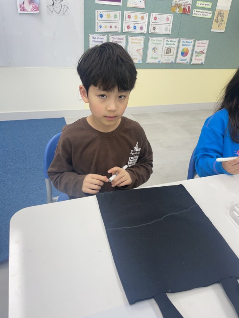 To explore new materials, students worked on black canvas bags using acrylic marker pens.