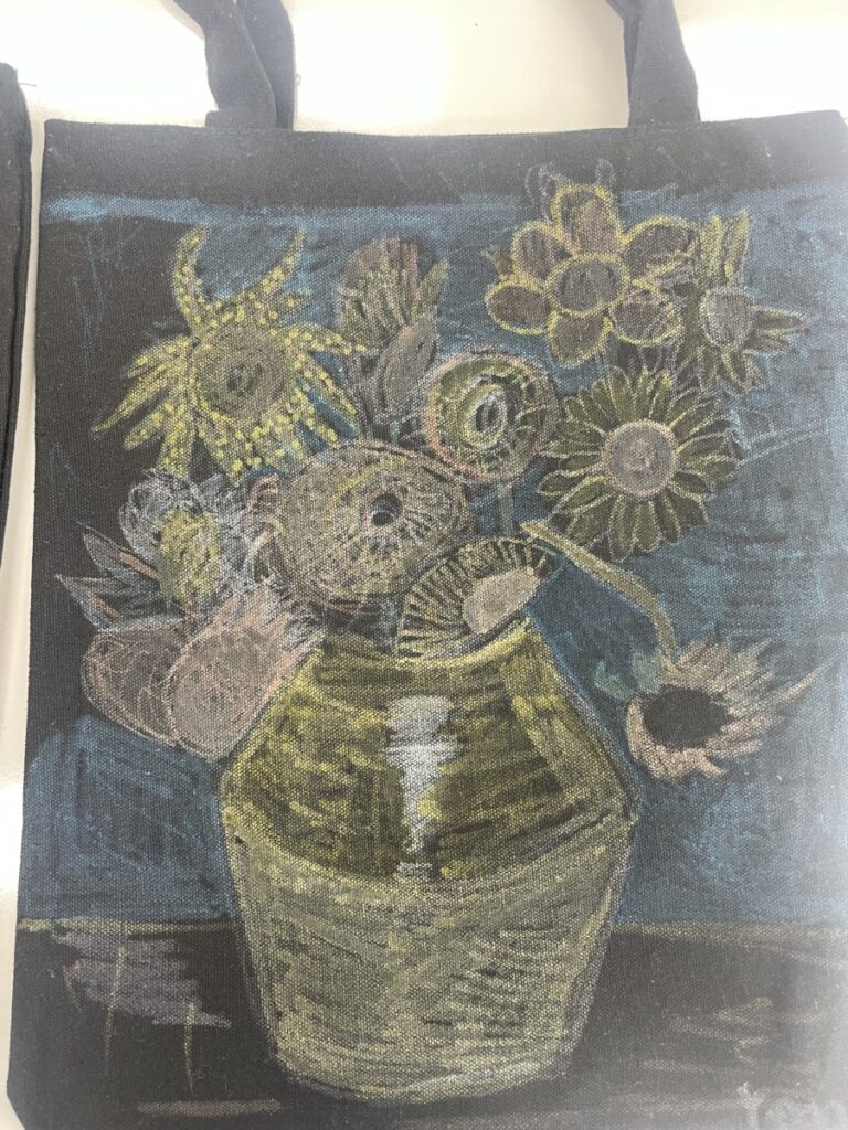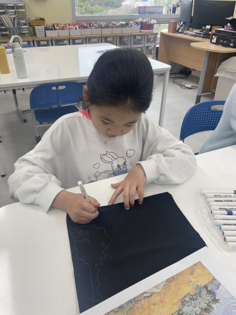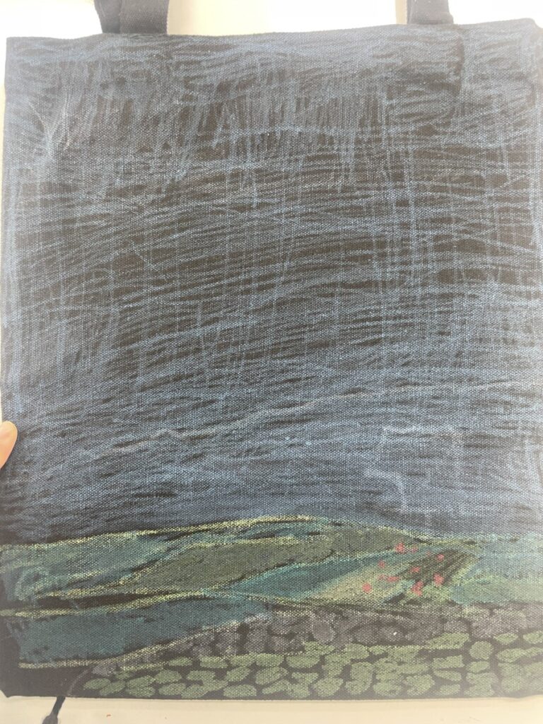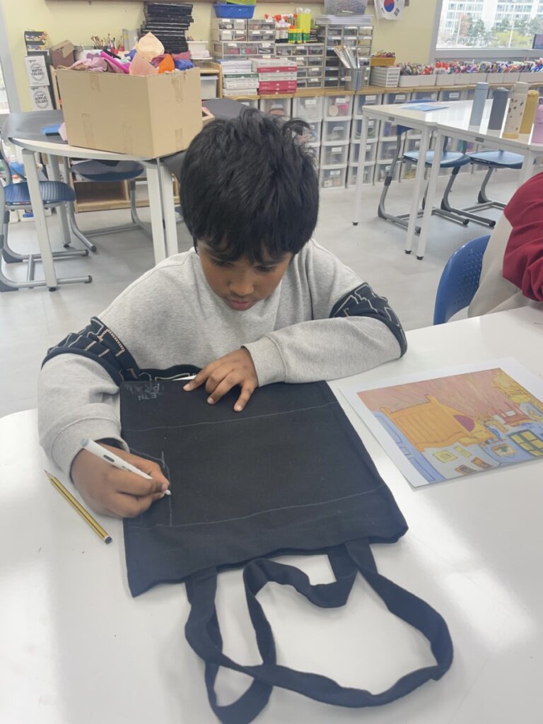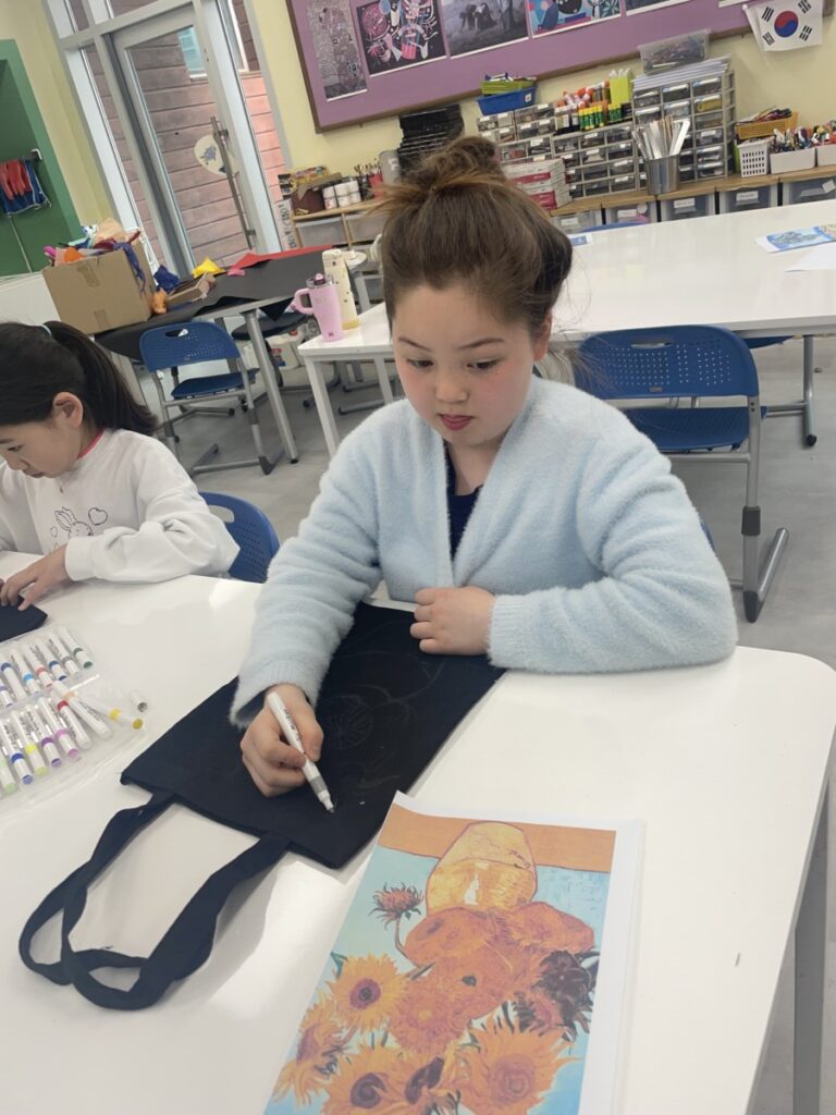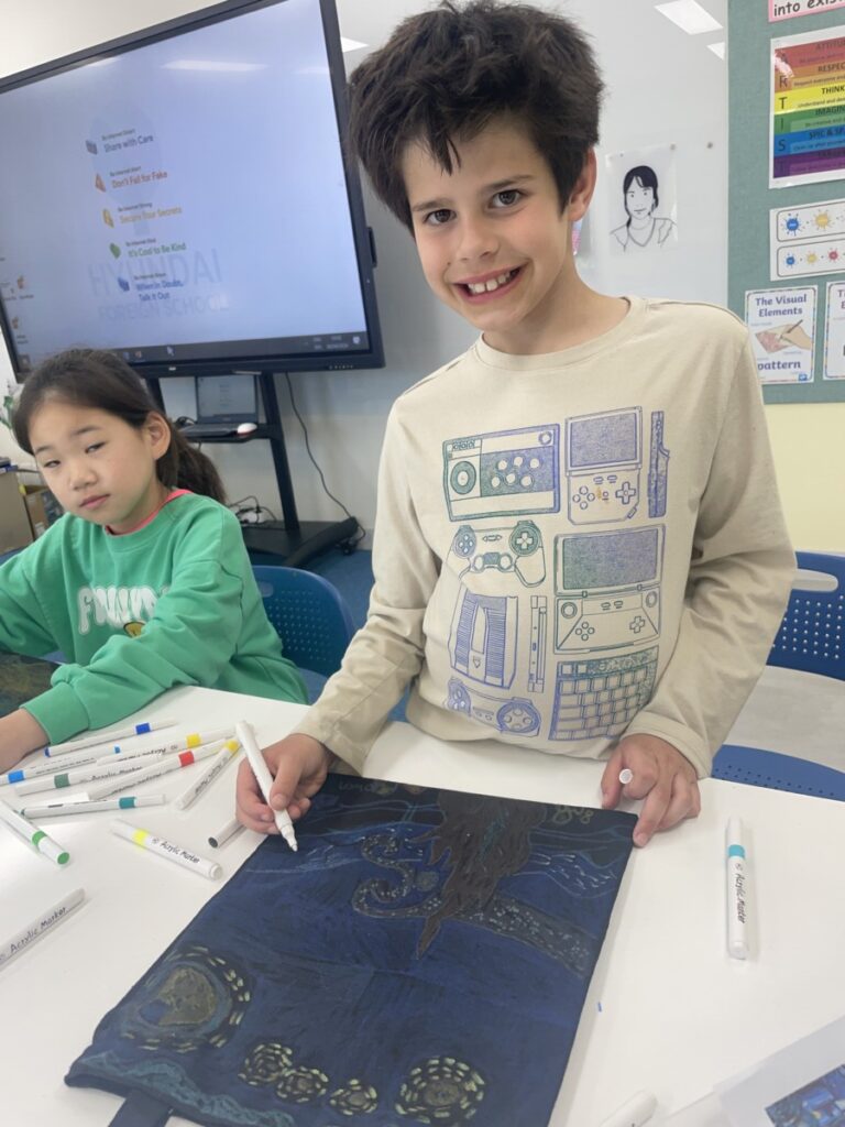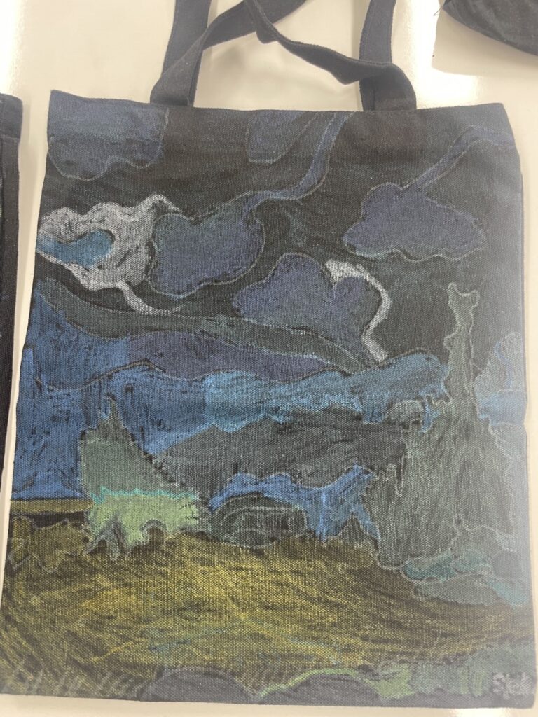 To explore new materials, students worked on black canvas bags using acrylic marker pens.