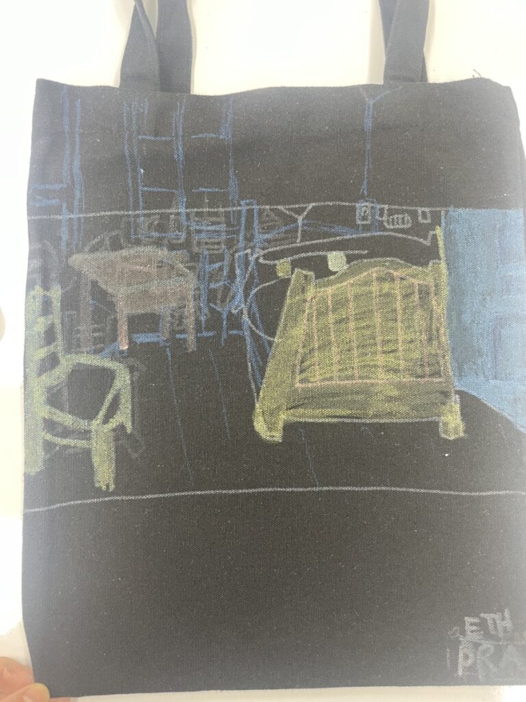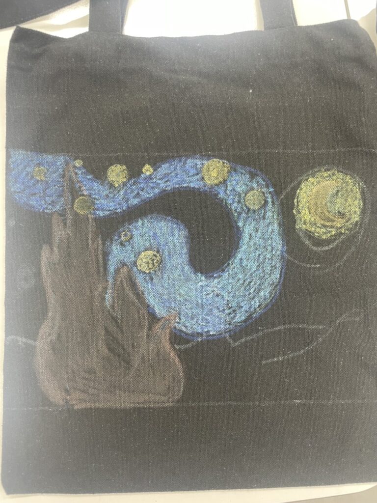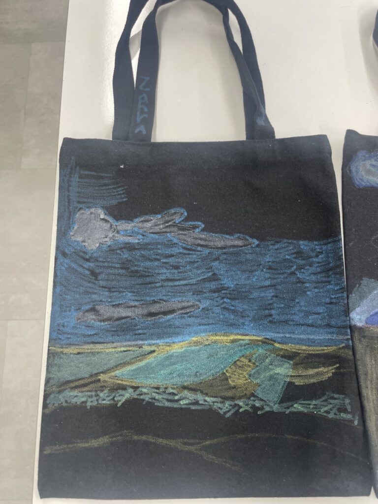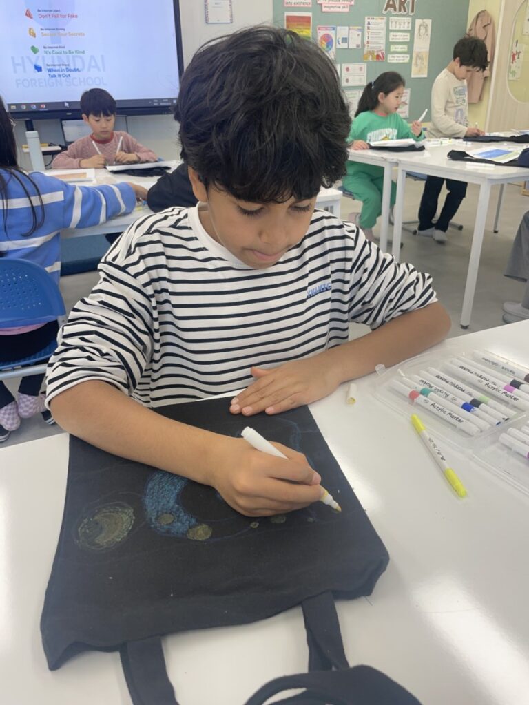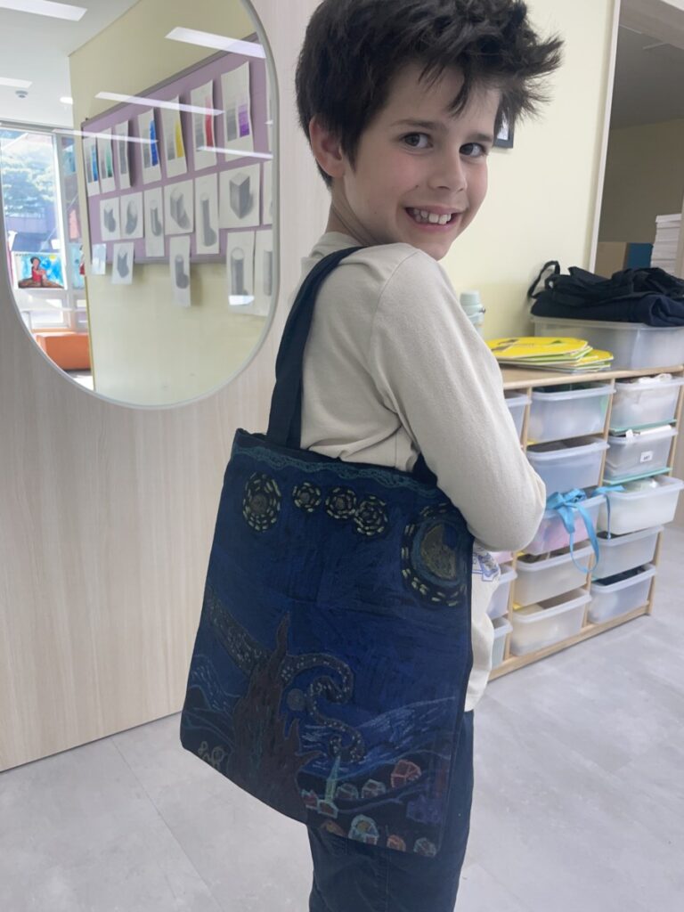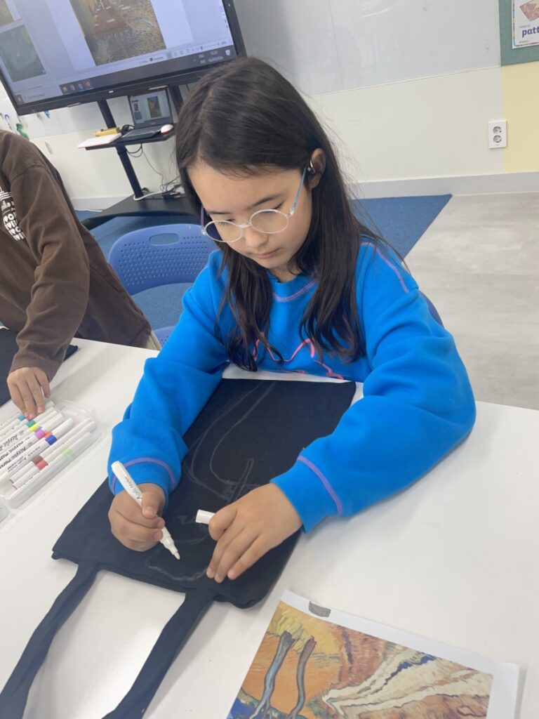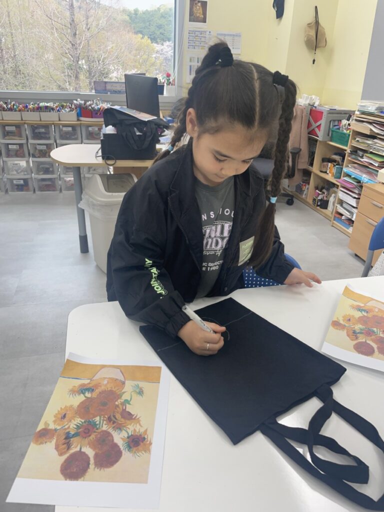 To explore new materials, students worked on black canvas bags using acrylic marker pens.