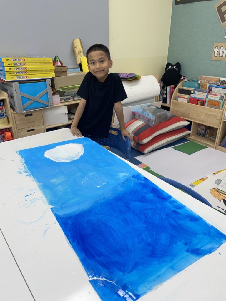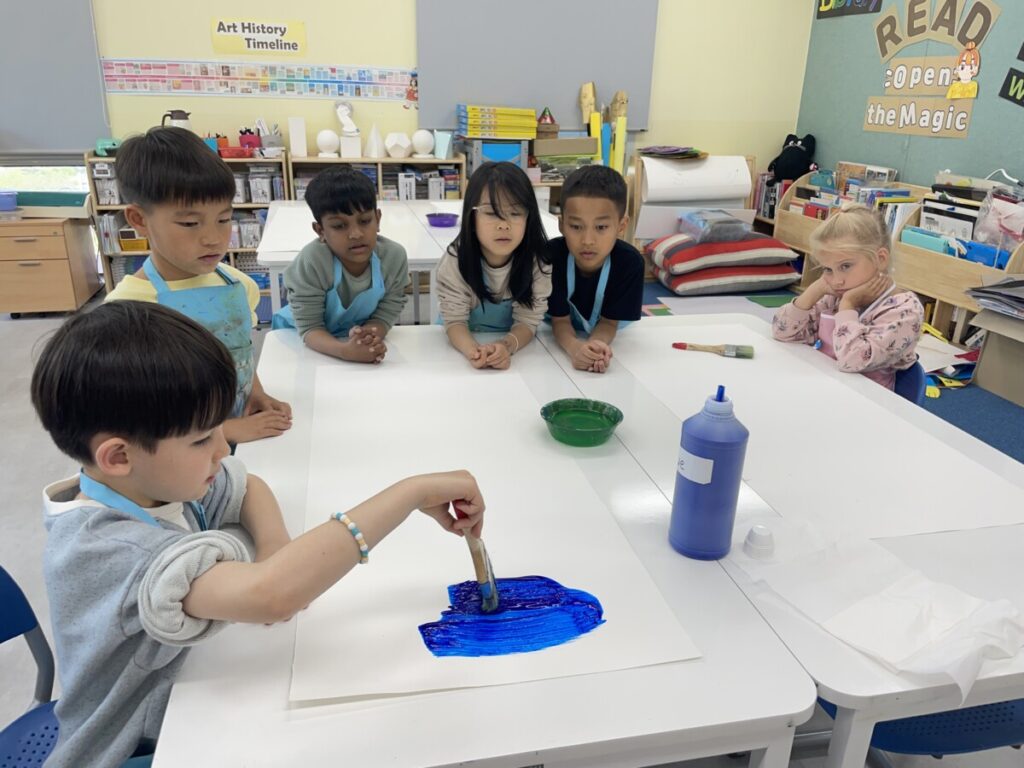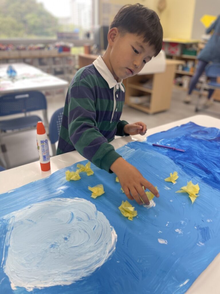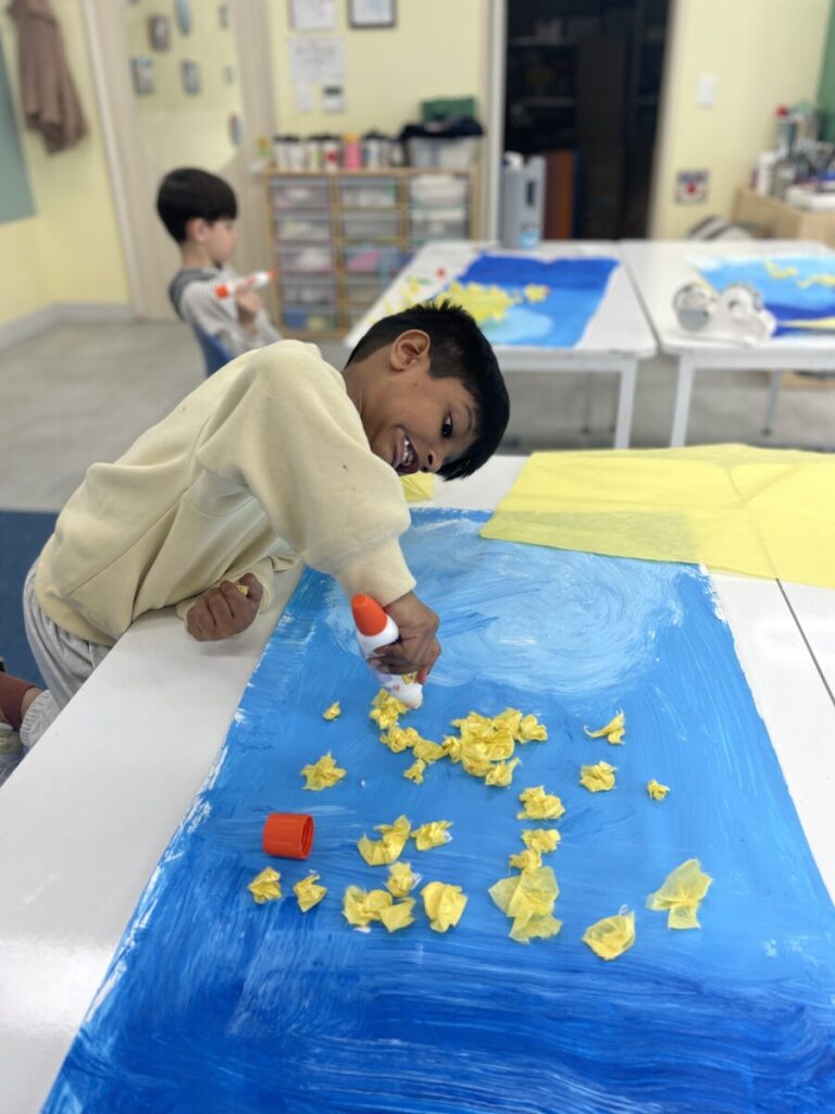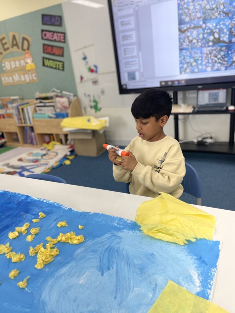 It was a joyful and engaging lesson, combining painting with craft-based exploration. In the next session, students will use ink to create tree branches, and we are all looking forward to seeing how their artworks come together.