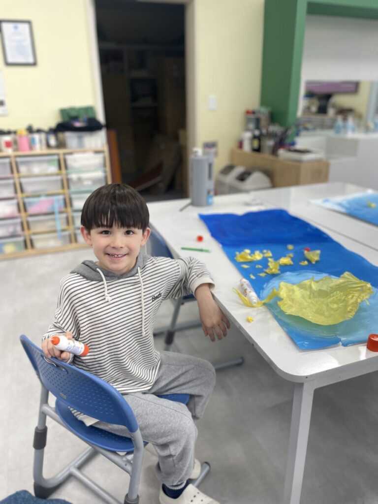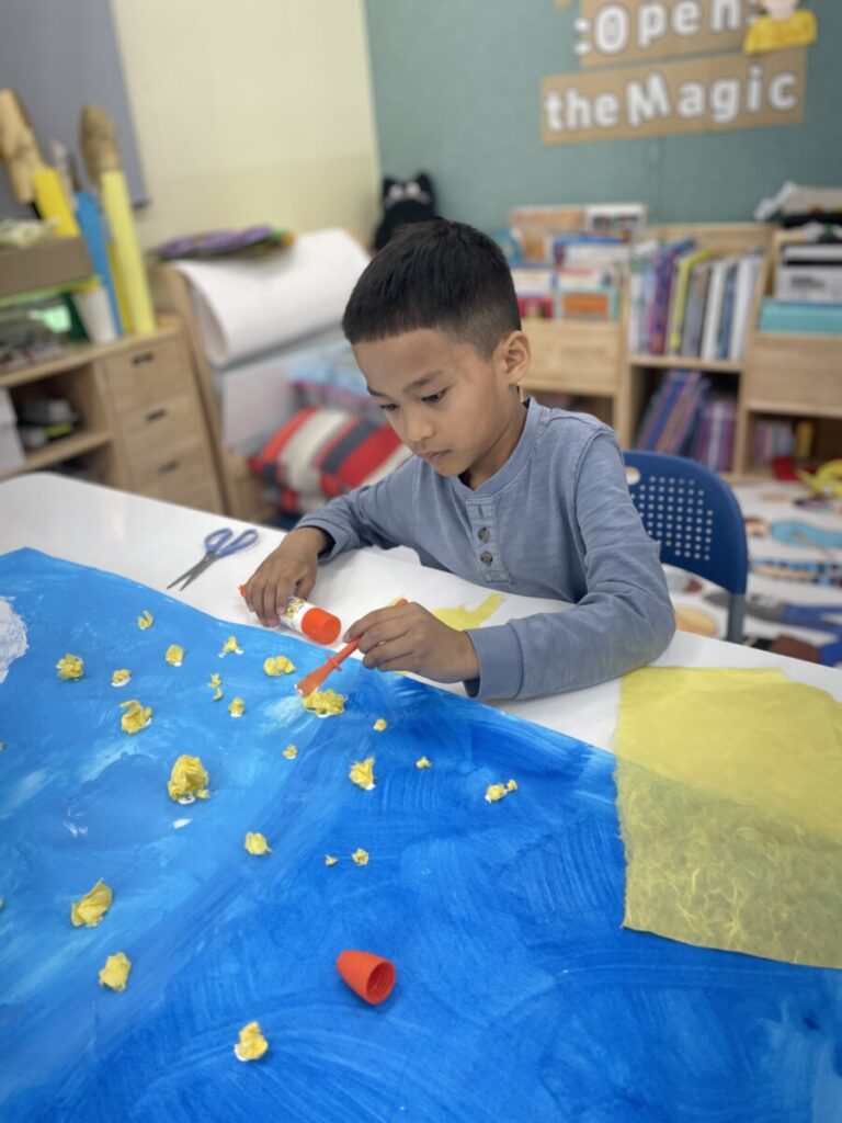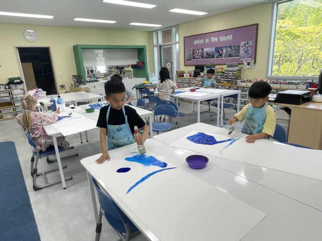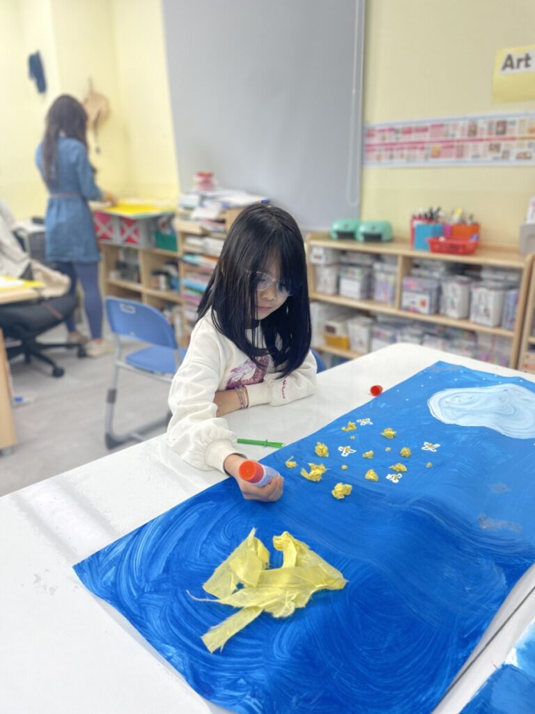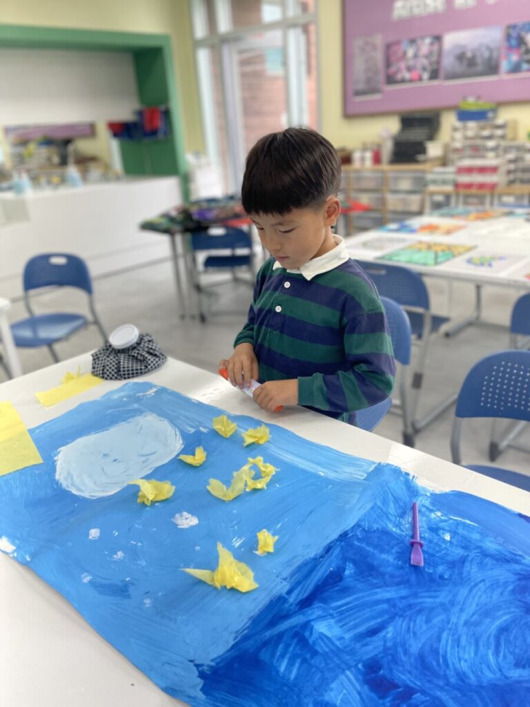They also engaged in a hands-on activity using traditional Korean paper, hanji. By gently shaping the paper with their hands, students created small yellow forsythia flowers and carefully attached them to their backgrounds. This tactile process not only added a beautiful textural element to their work, but also helped develop their fine motor skills.