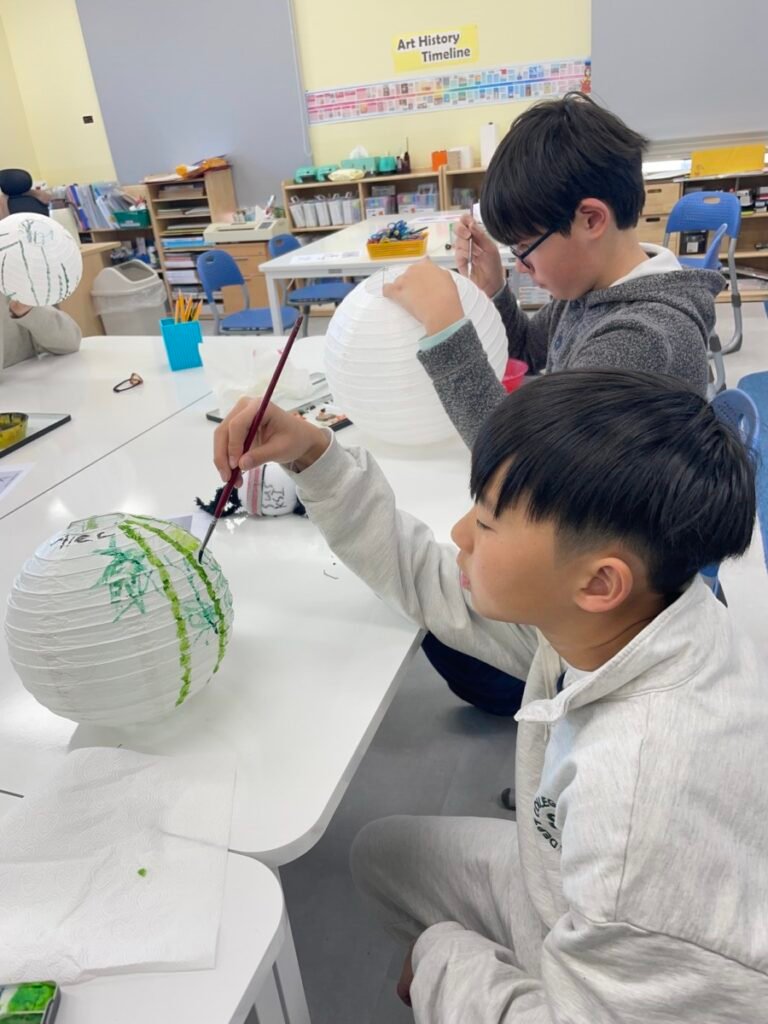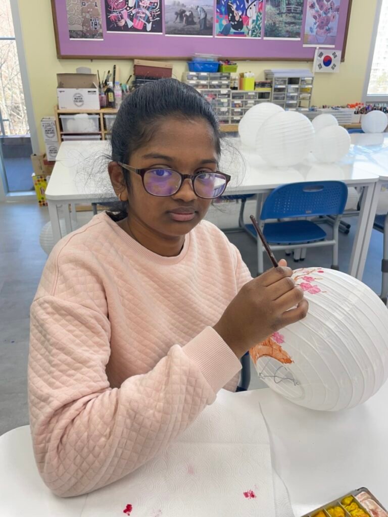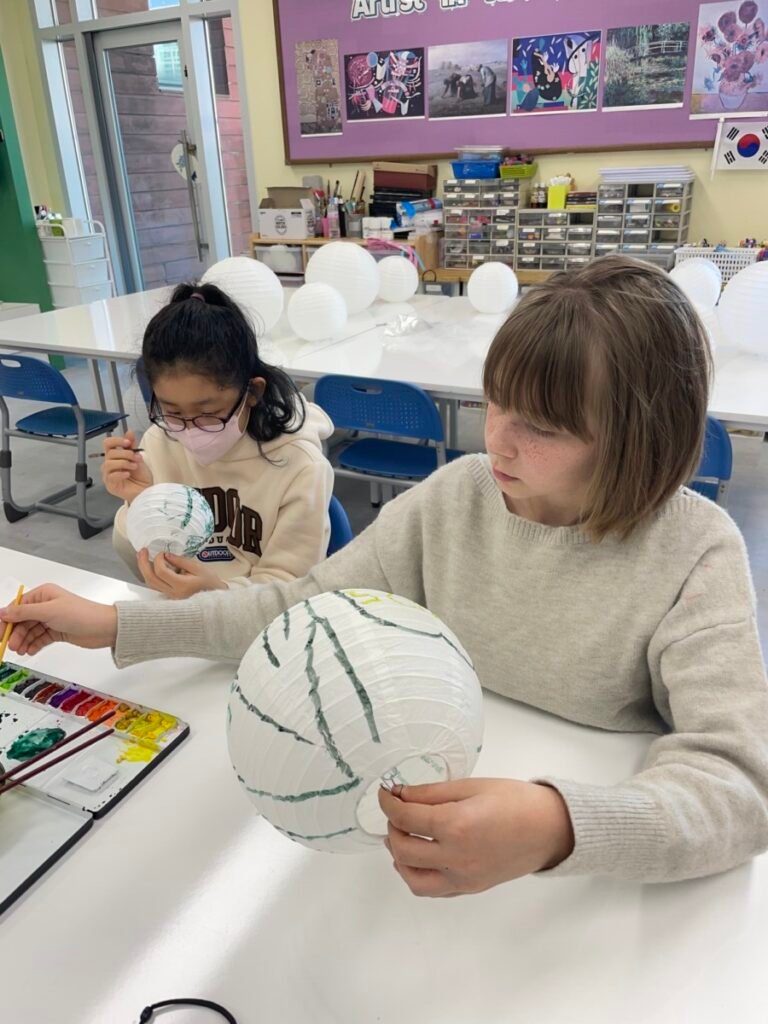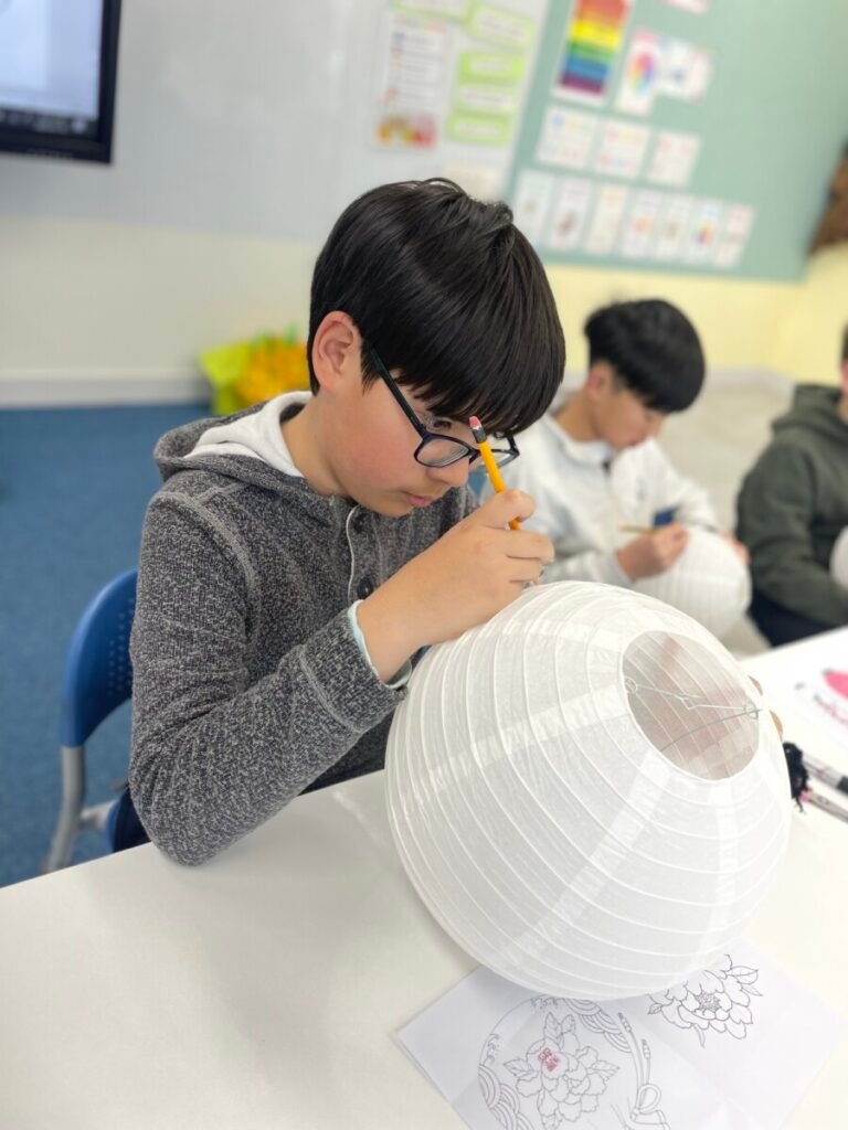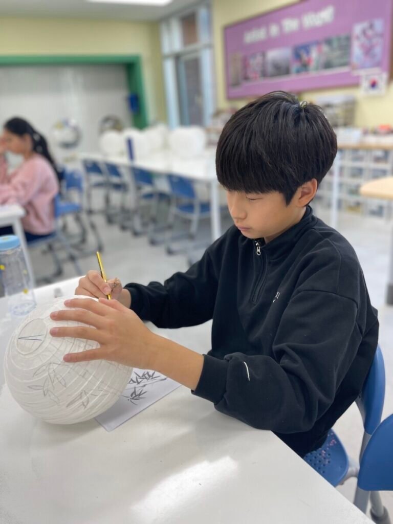 This week, I introduced the students to Korean traditions and the symbolic meanings of bamboo, peony, and plum blossoms. We explored how these elements reflect cultural values and are often featured in traditional art. The lesson focused on teaching art techniques, such as sketching lightly on a 3D lantern surface and using paint to create vibrant designs. Students were encouraged to express their individual creativity while working within the framework of these traditional themes. This lesson provided them with a deeper understanding of Korean Lunar New Year and its rich cultural traditions.