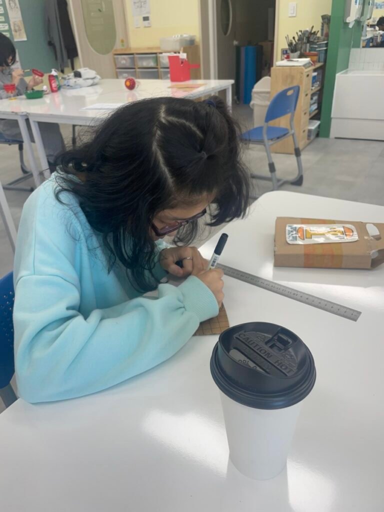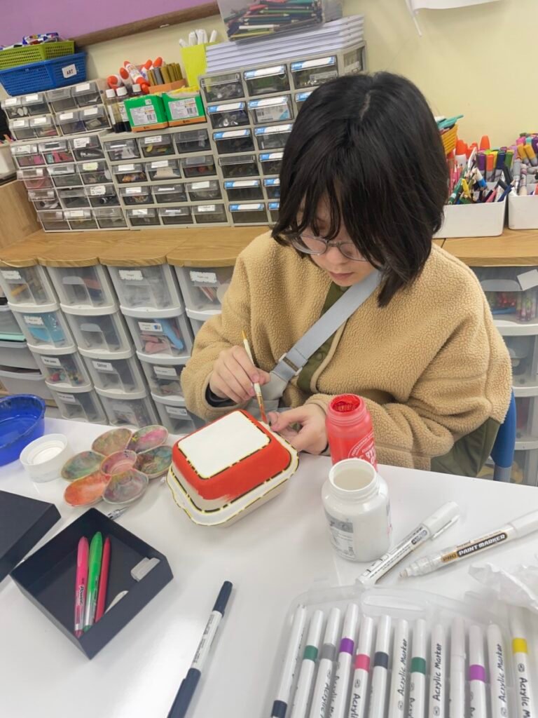After finishing their mobiles, the children spent time drawing pictures they would like to express on the lids of hamburger boxes. This activity encouraged them to think about how their drawings could fit onto a different surface, helping them explore new ways to use their ideas beyond paper.
