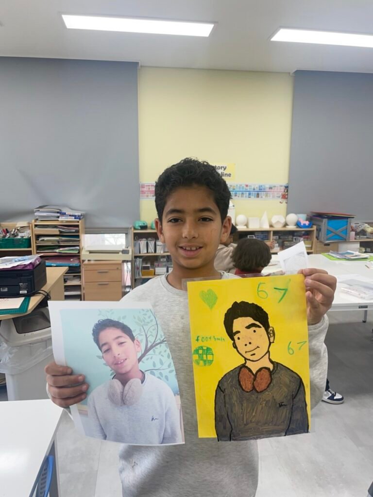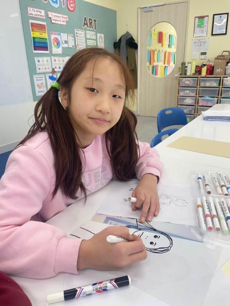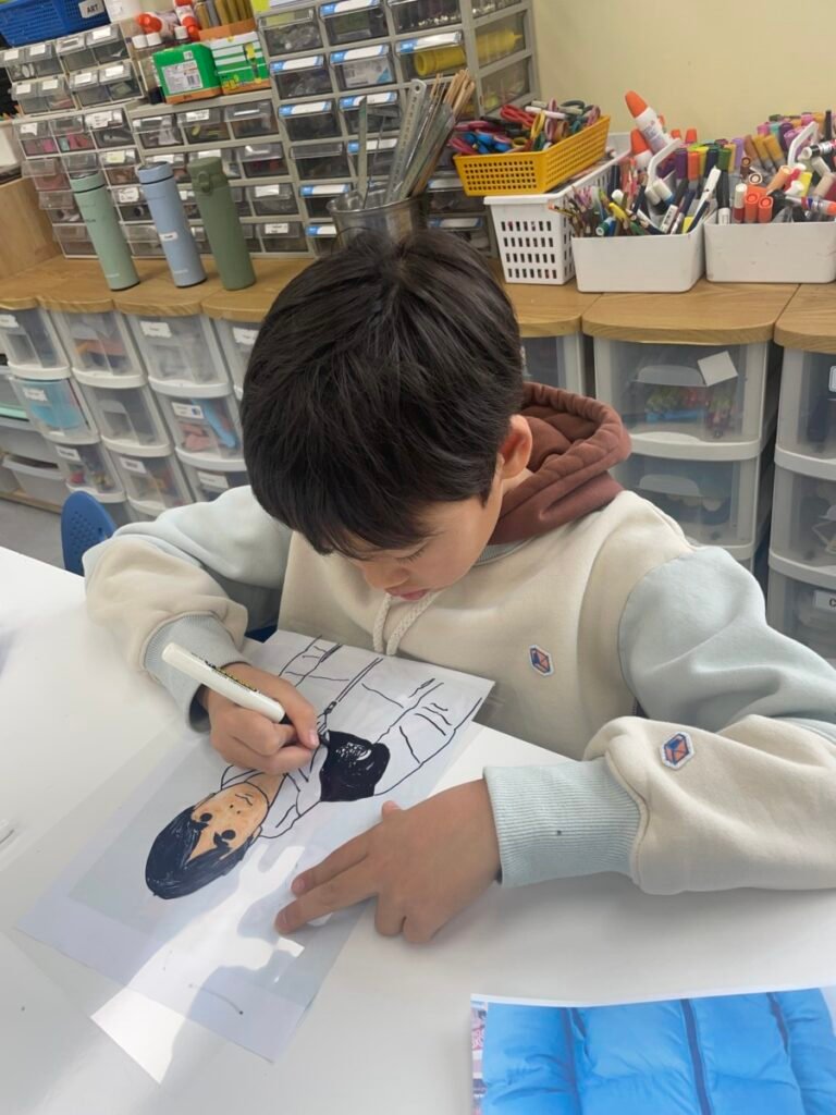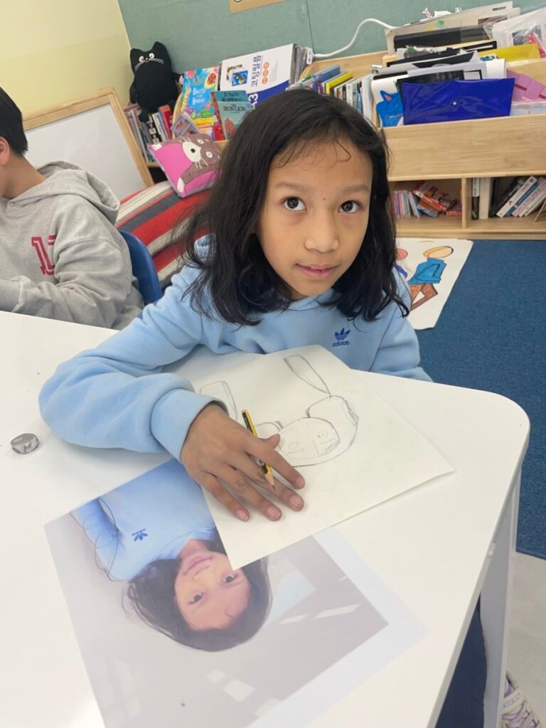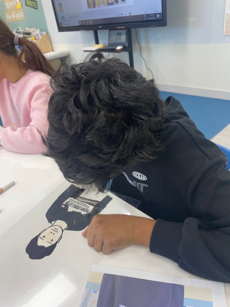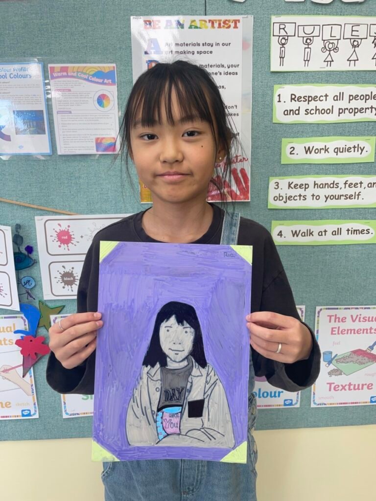 This week, Year 5–6 students explored Julian Opie–style portrait drawing by creating self-portraits inspired by his distinctive approach. Rather than drawing detailed facial features such as eyes, noses, and mouths, students focused on expressing their identity through simplified side-profile portraits that highlighted their hairstyles, clothing, and overall silhouette, in the style of Julian Opie’s work.