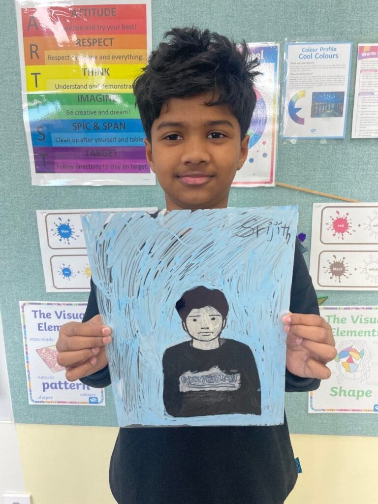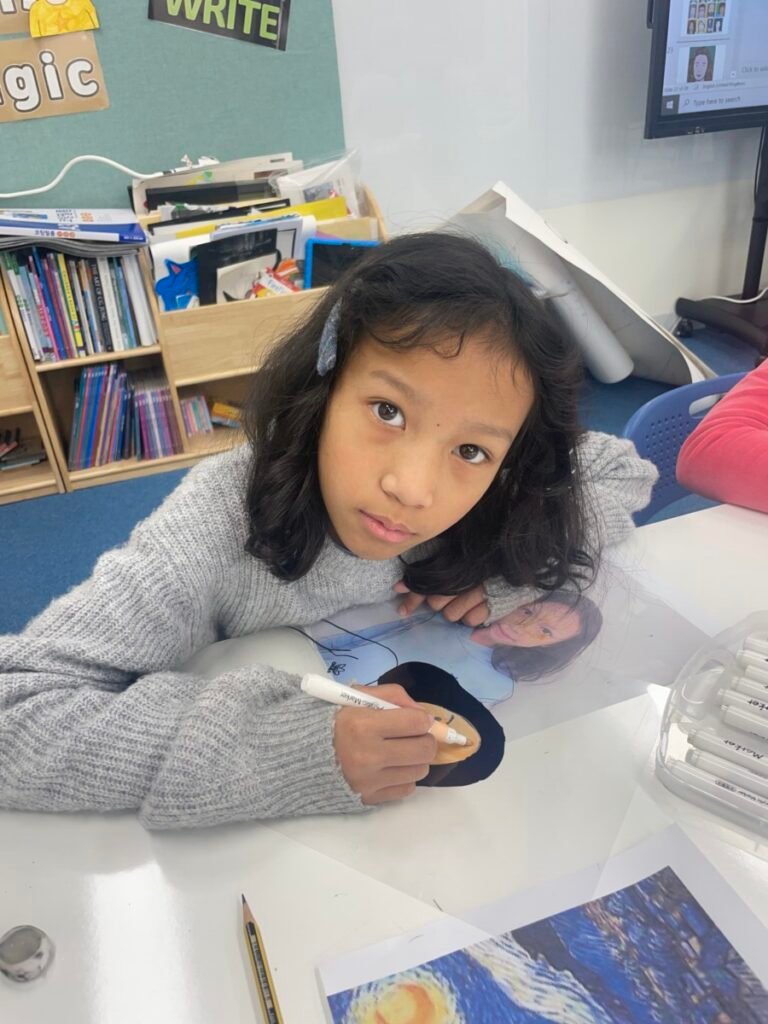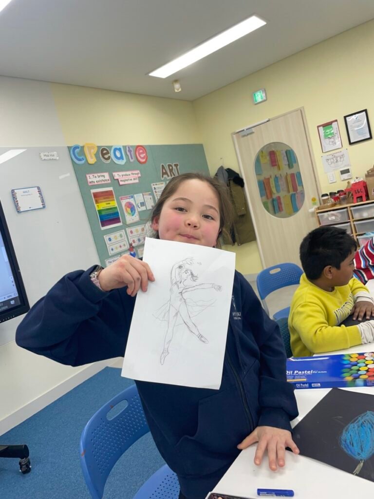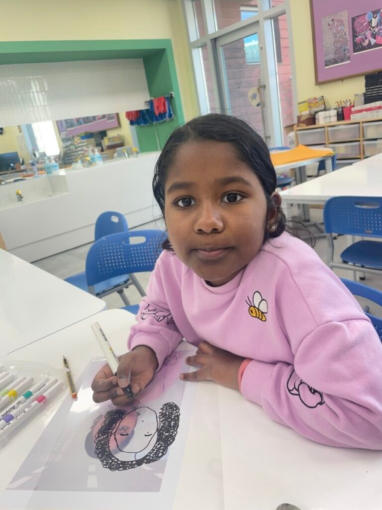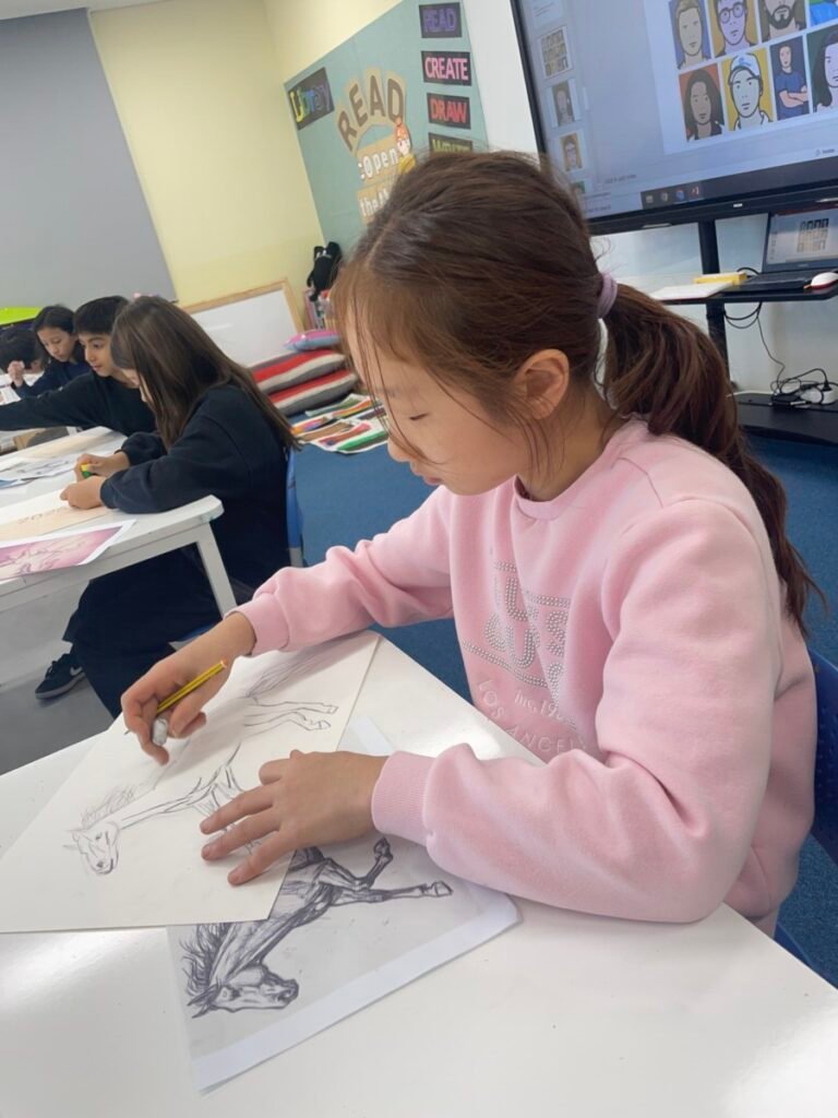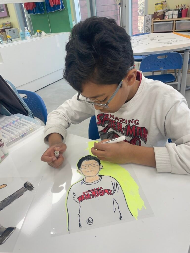 This week, Year 5–6 students explored Julian Opie–style portrait drawing by creating self-portraits inspired by his distinctive approach. Rather than drawing detailed facial features such as eyes, noses, and mouths, students focused on expressing their identity through simplified side-profile portraits that highlighted their hairstyles, clothing, and overall silhouette, in the style of Julian Opie’s work.