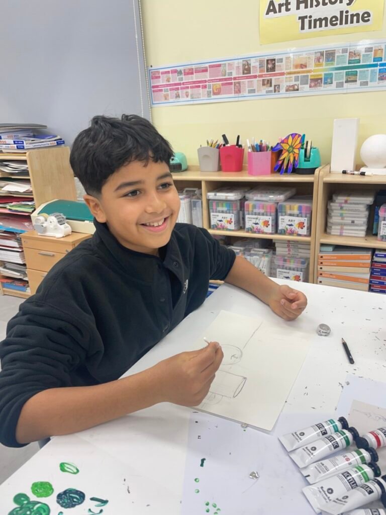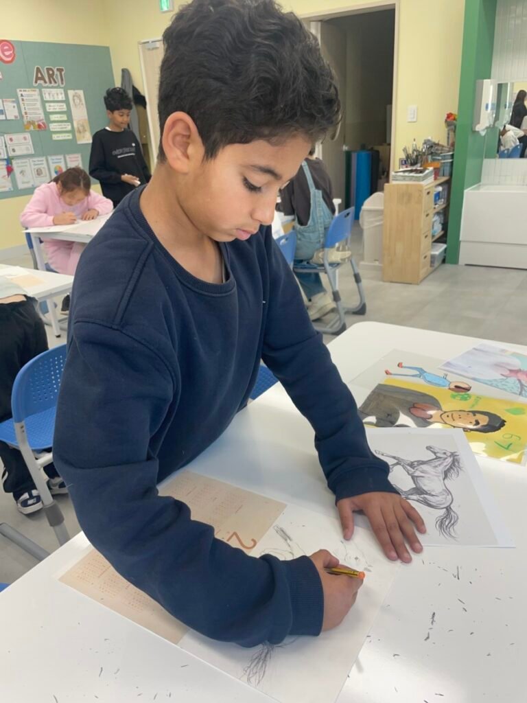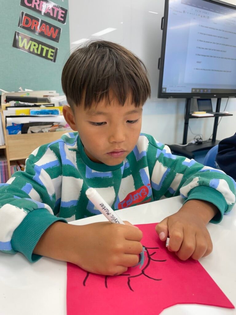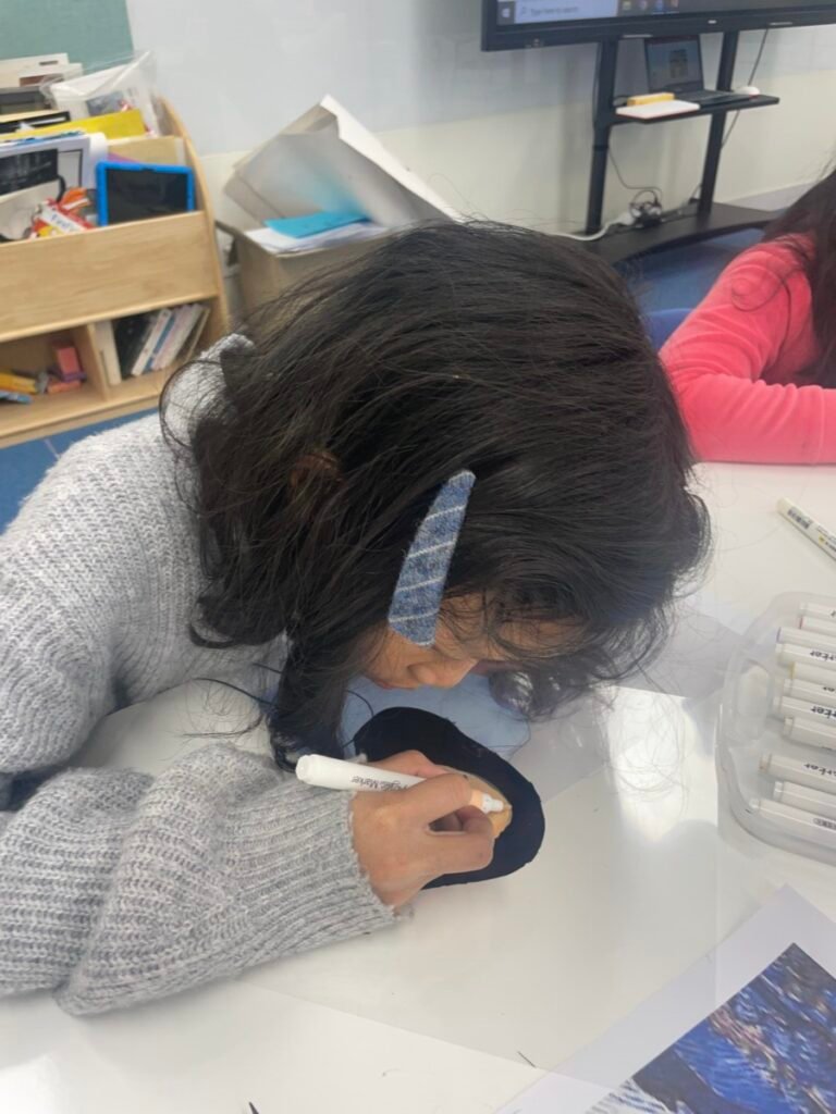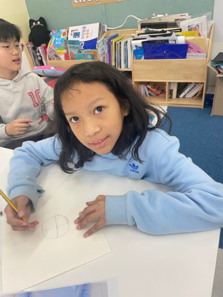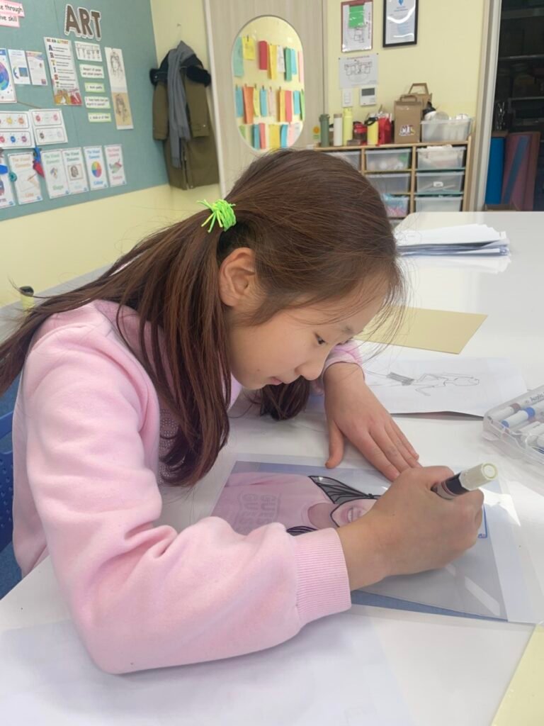 This week, Year 5–6 students explored Julian Opie–style portrait drawing by creating self-portraits inspired by his distinctive approach. Rather than drawing detailed facial features such as eyes, noses, and mouths, students focused on expressing their identity through simplified side-profile portraits that highlighted their hairstyles, clothing, and overall silhouette, in the style of Julian Opie’s work.
