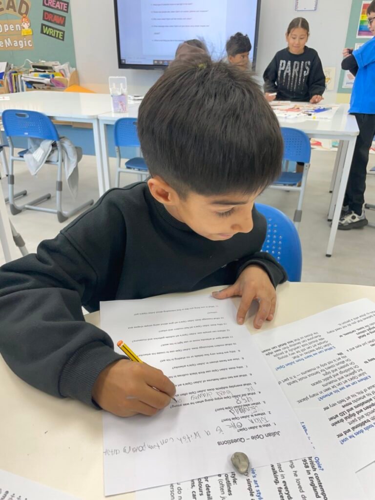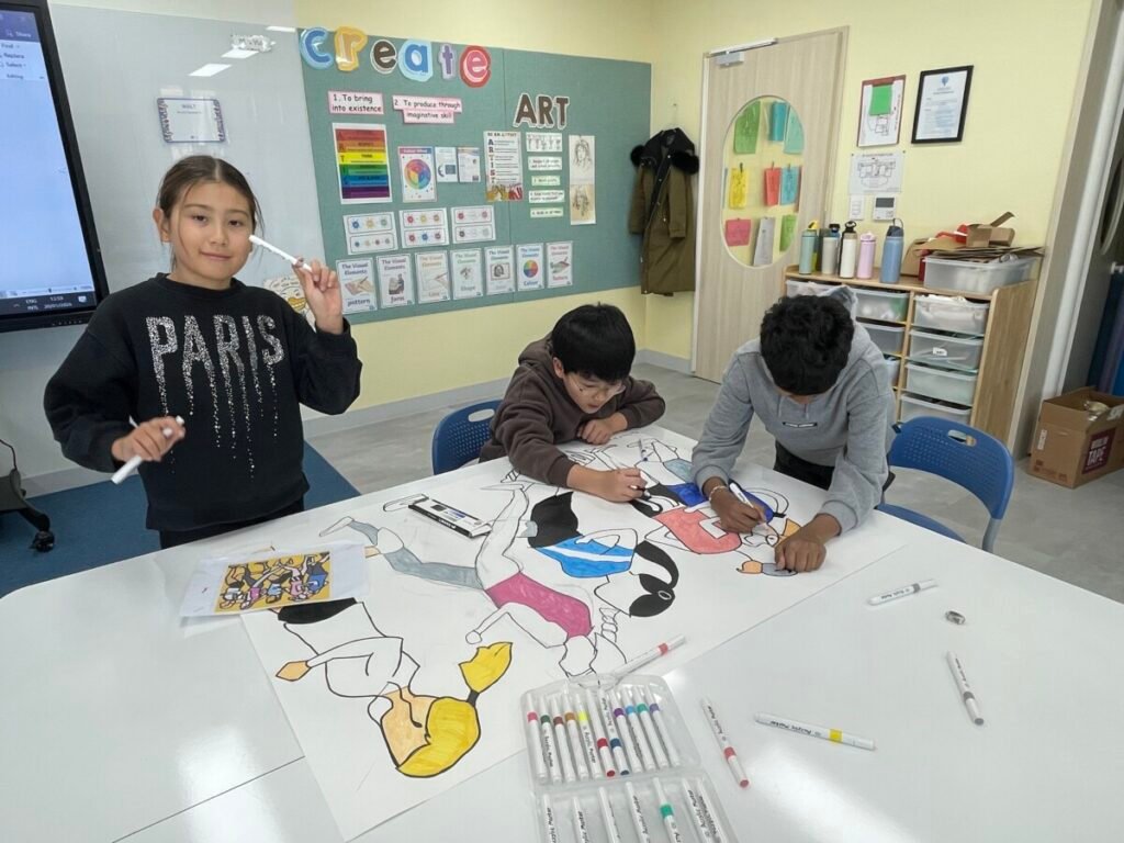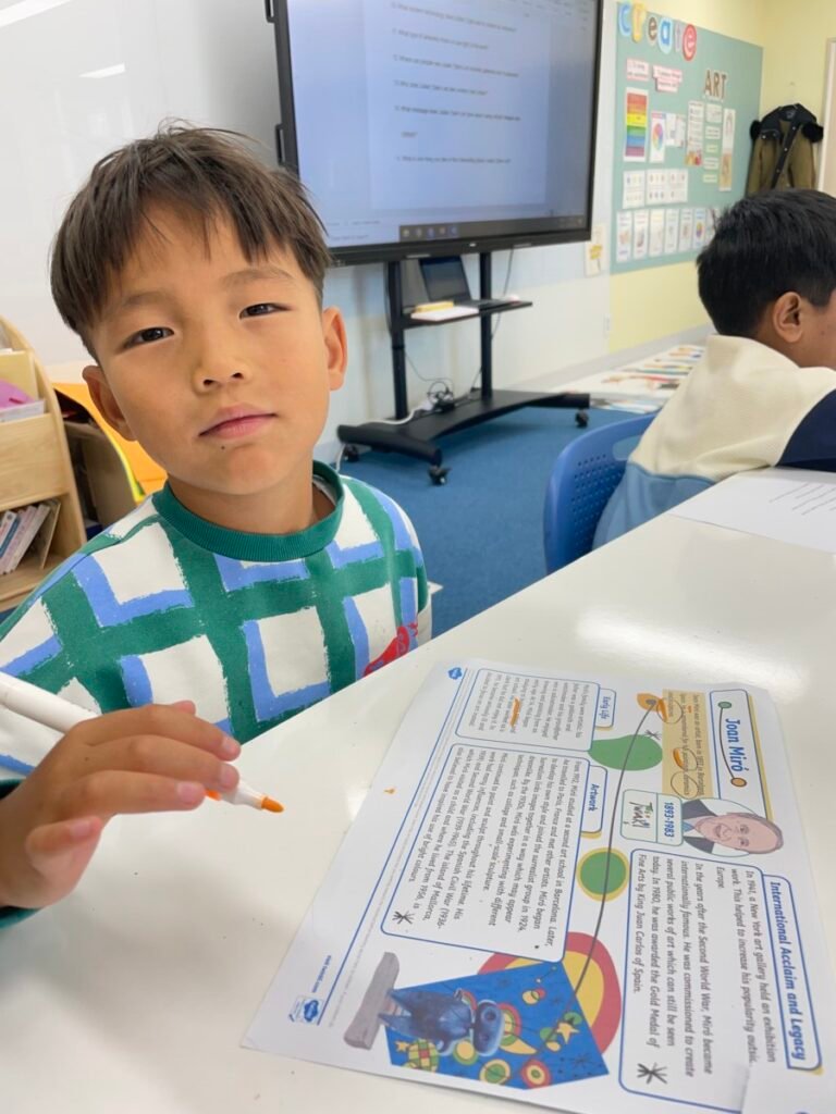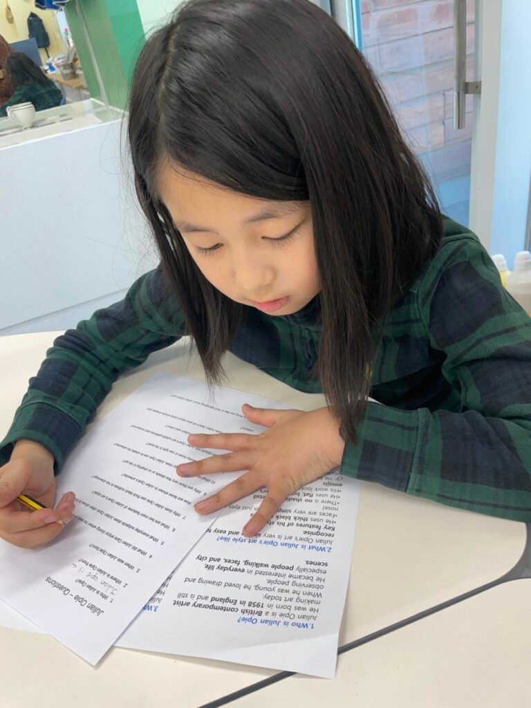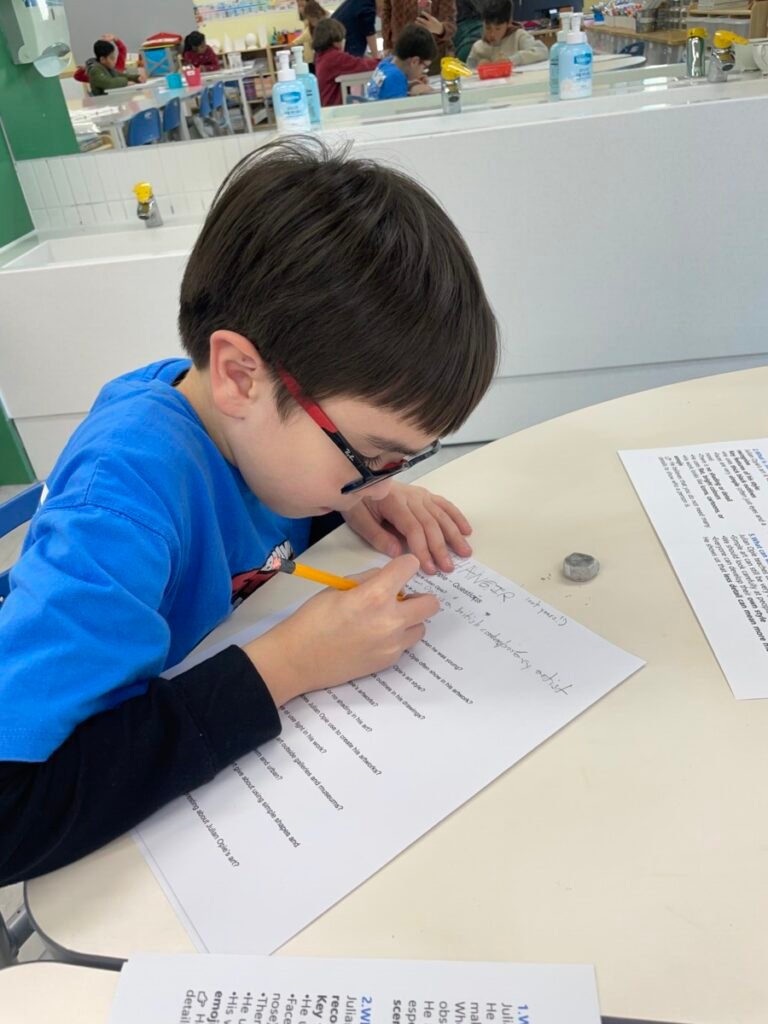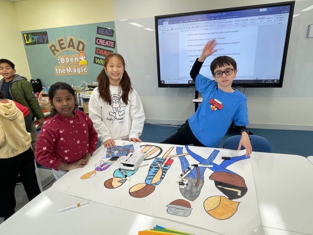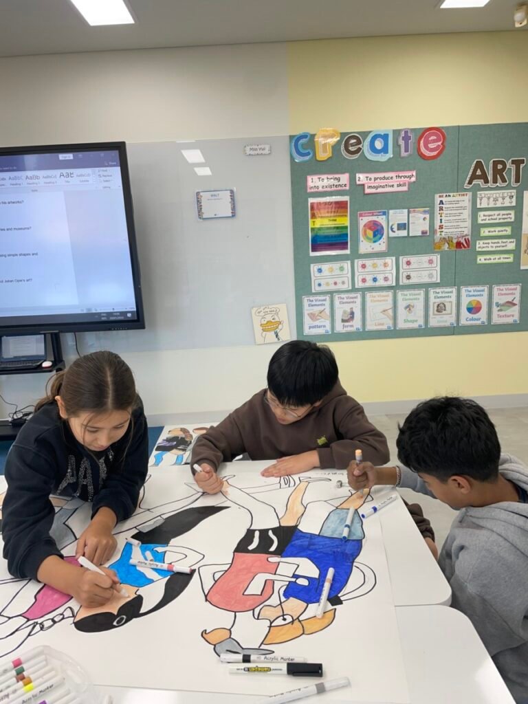 After finishing the collaborative piece, students spent time learning more about Julian Opie by exploring and answering questions about his work and artistic style. This reflection activity helped deepen their understanding of contemporary art and reinforced the ideas of visual communication, observation, and collaboration.