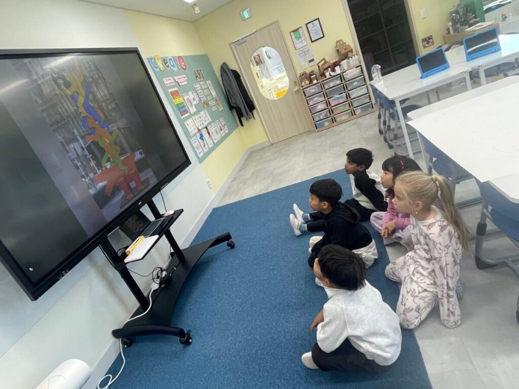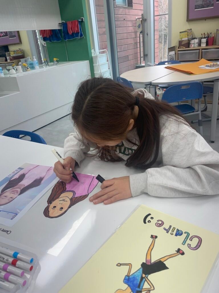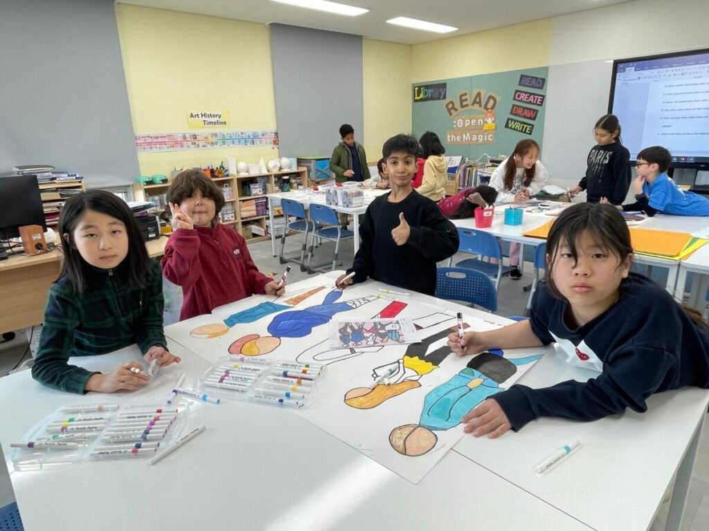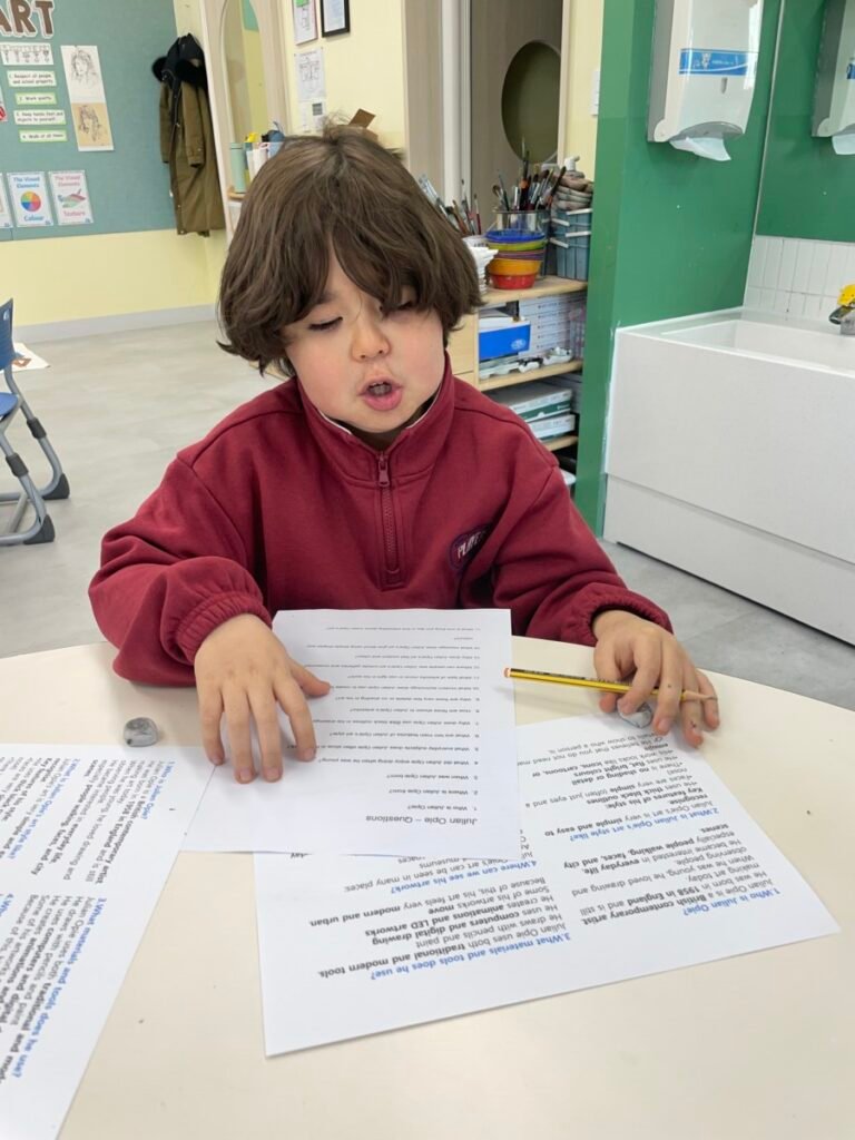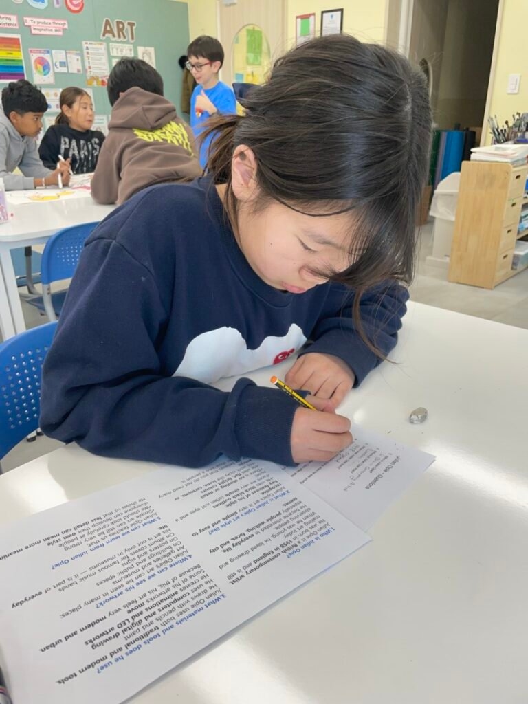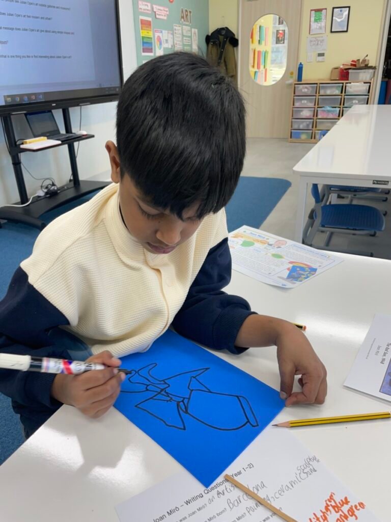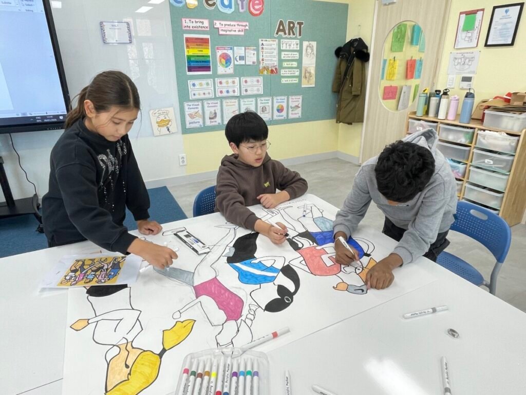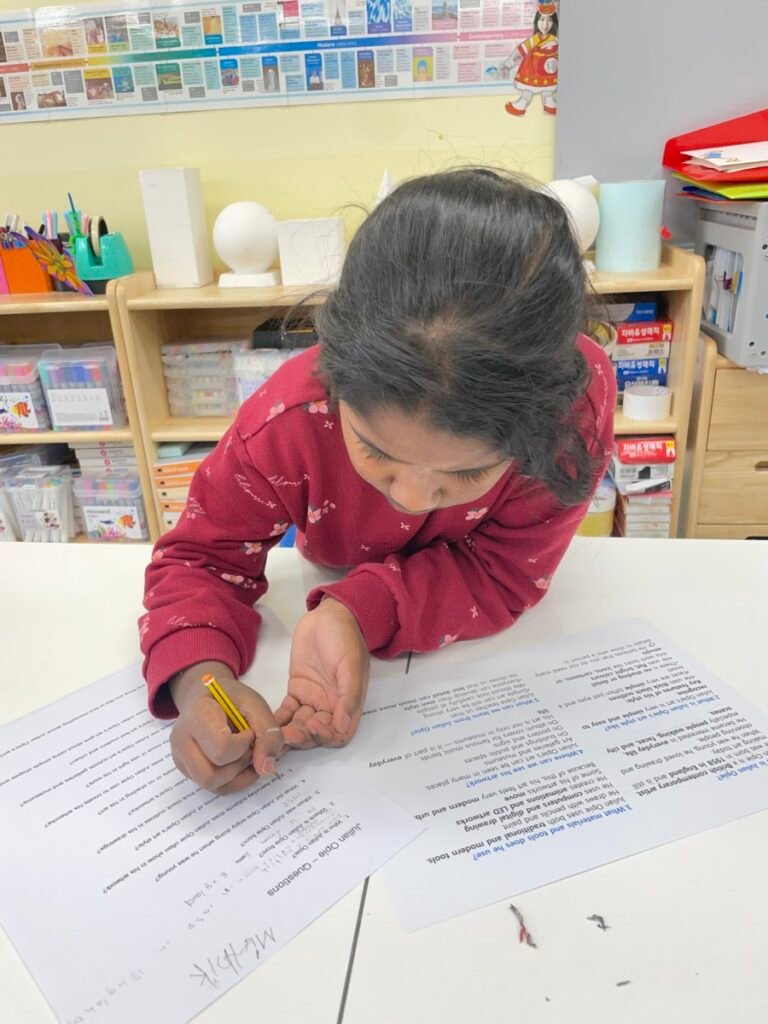 After finishing the collaborative piece, students spent time learning more about Julian Opie by exploring and answering questions about his work and artistic style. This reflection activity helped deepen their understanding of contemporary art and reinforced the ideas of visual communication, observation, and collaboration.