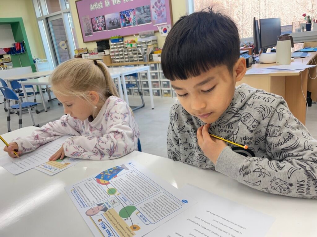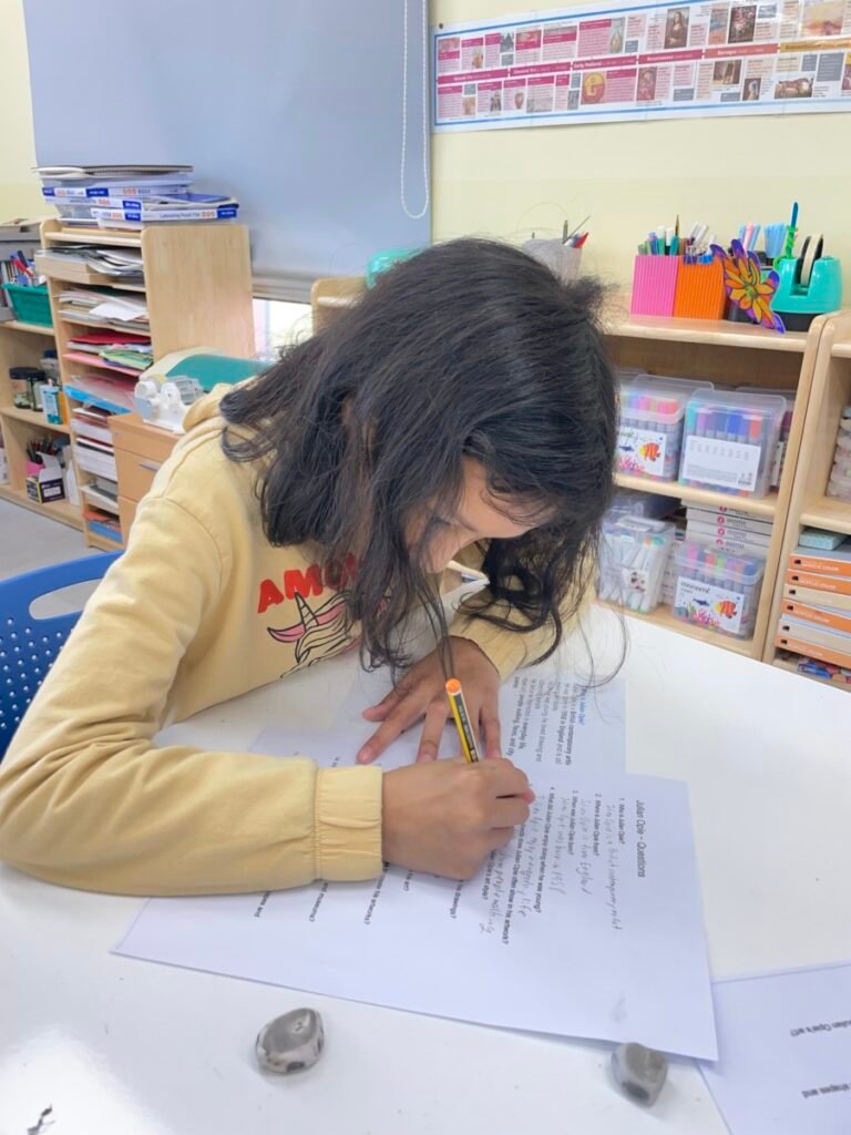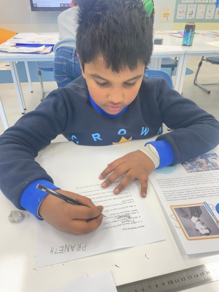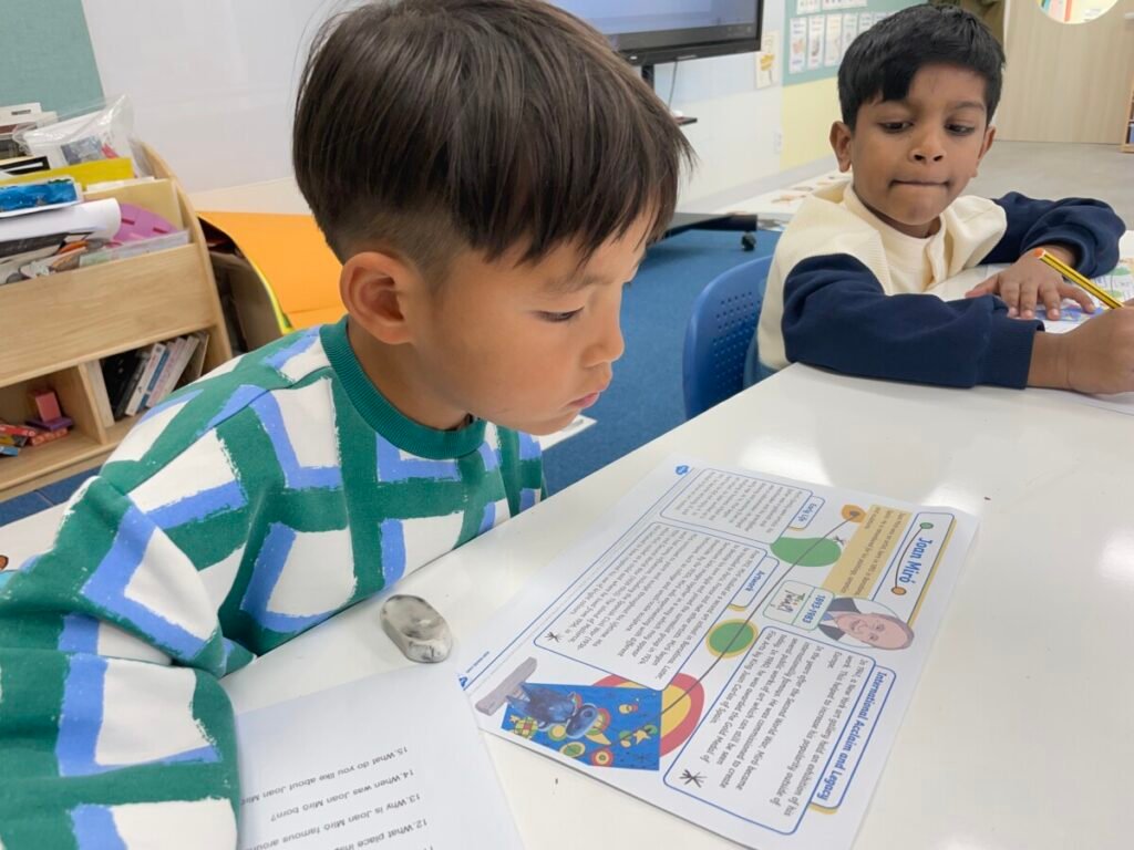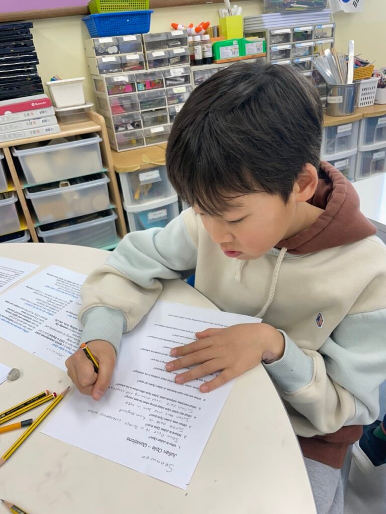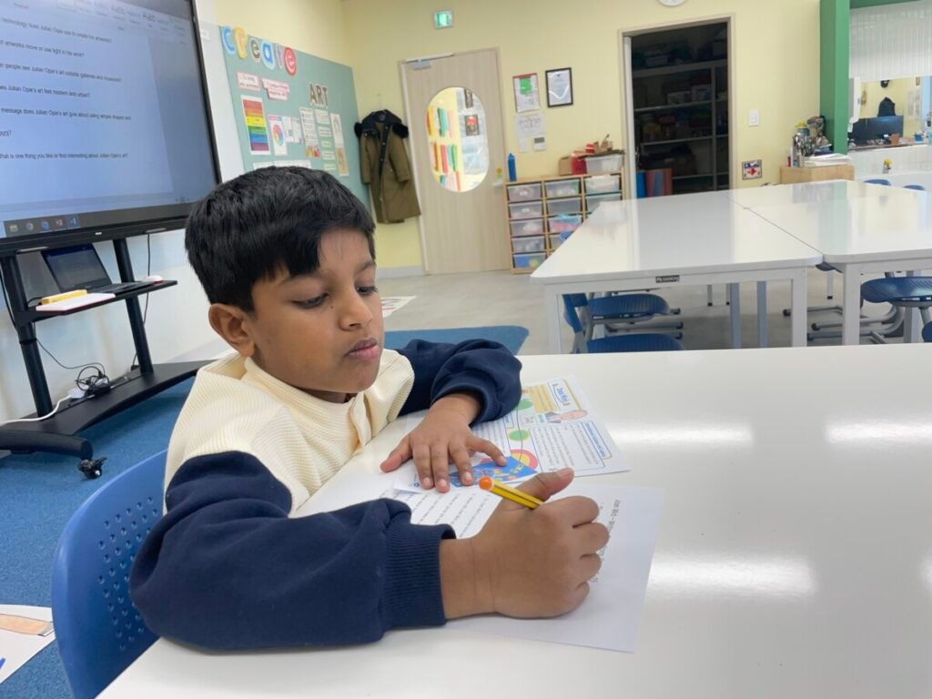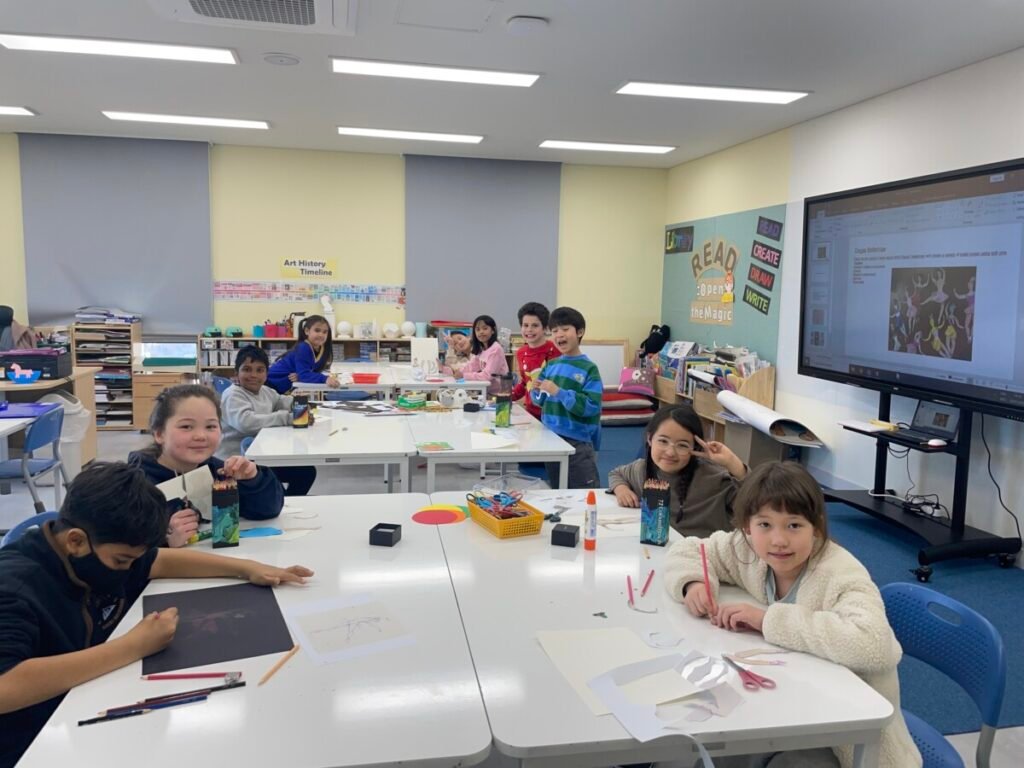 After finishing the collaborative piece, students spent time learning more about Julian Opie by exploring and answering questions about his work and artistic style. This reflection activity helped deepen their understanding of contemporary art and reinforced the ideas of visual communication, observation, and collaboration.