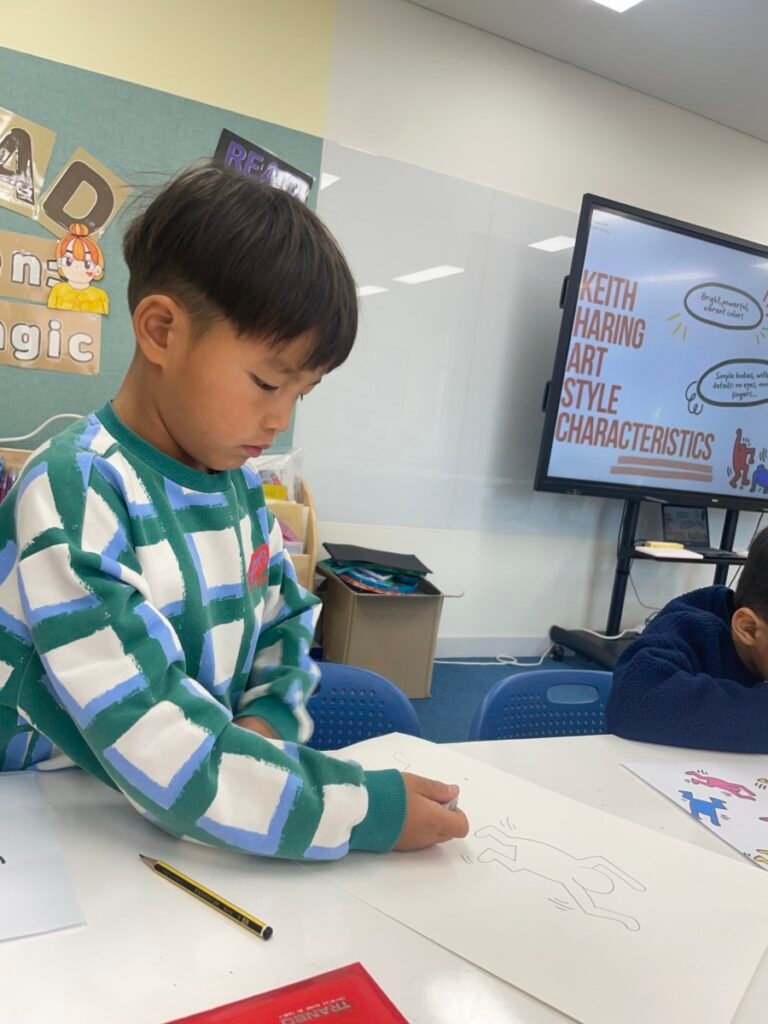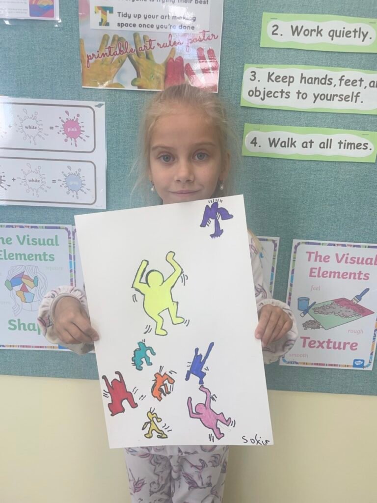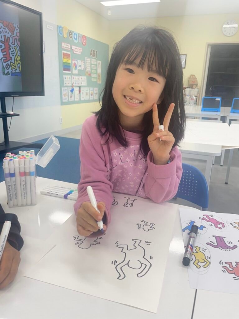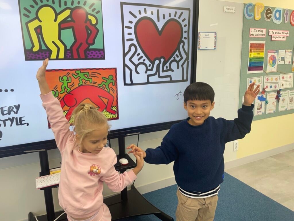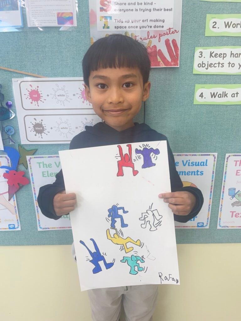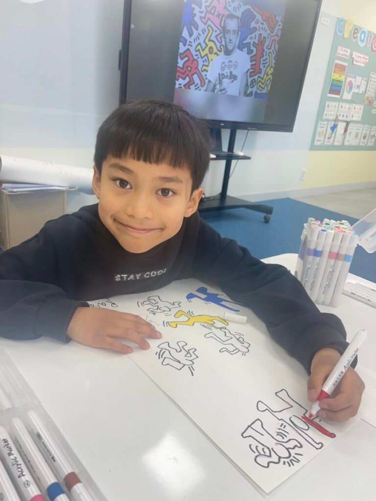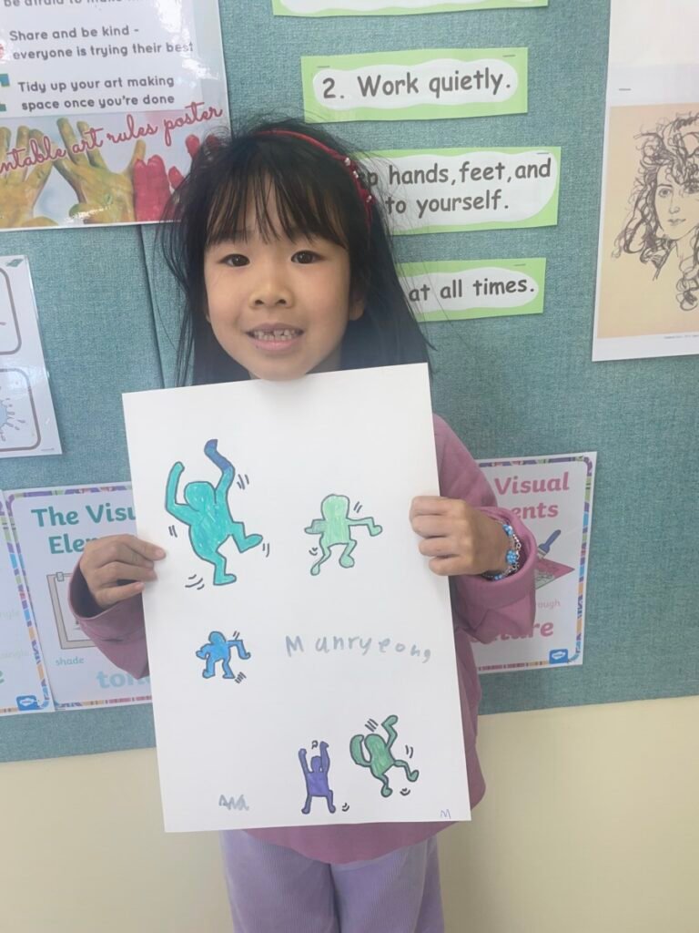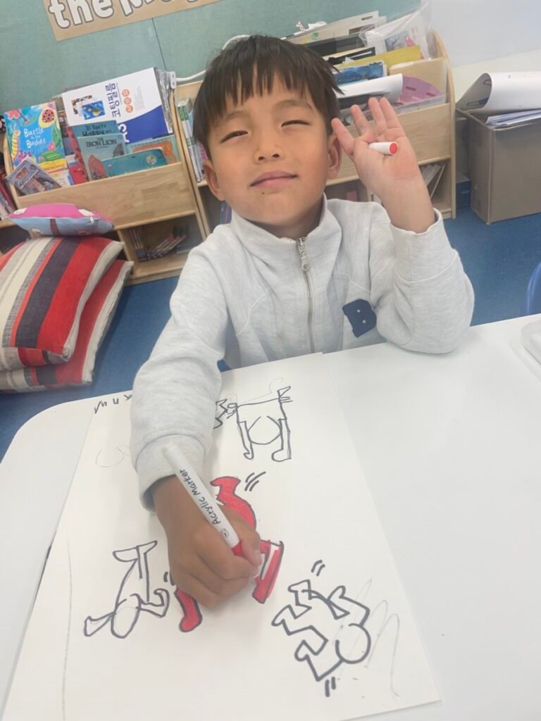 This week, the year1-2 kids explored the artwork of Keith Haring, focusing on how he showed movement using simple figures and bold lines. After looking closely at his artworks, kids used their own bodies to act out different poses and movements, just like the energetic figures in Keith Haring’s work.