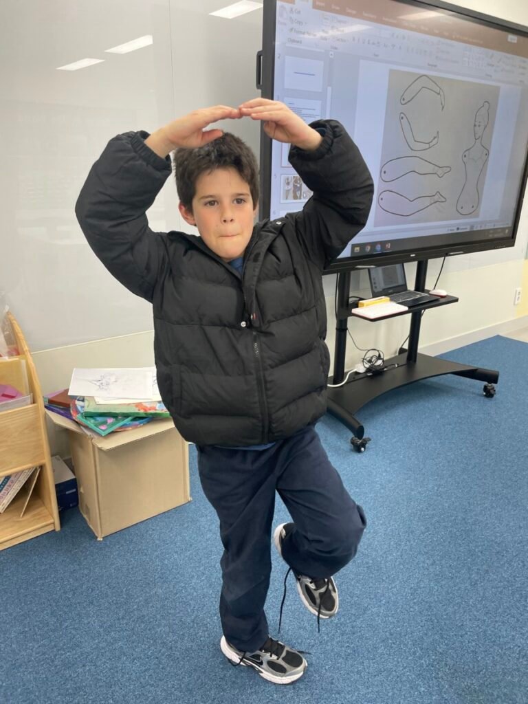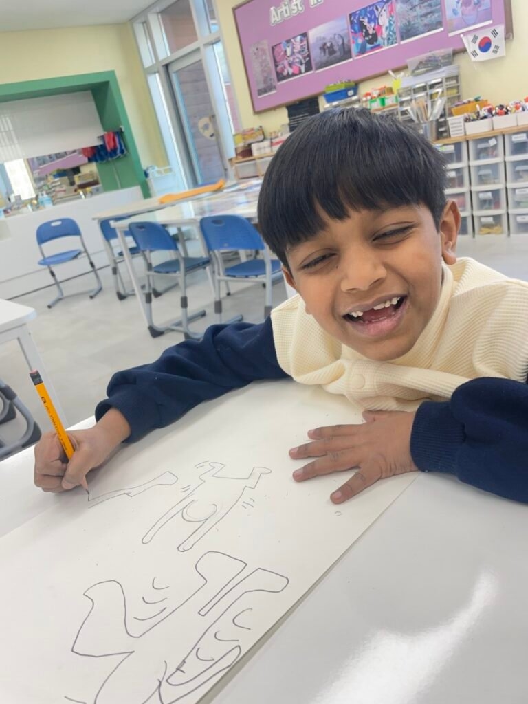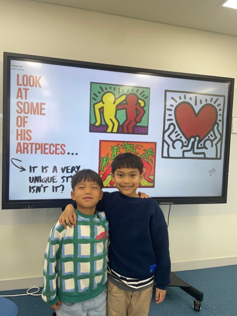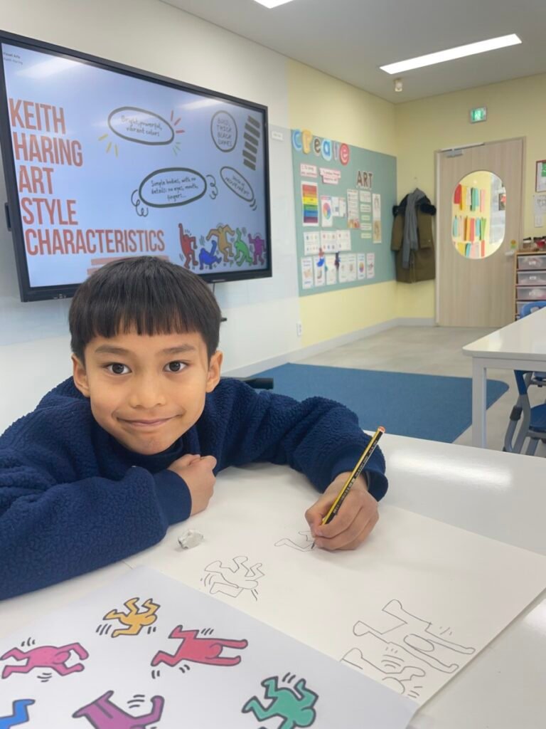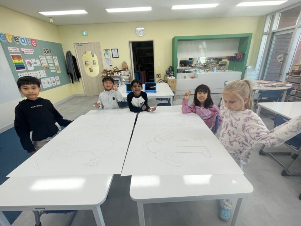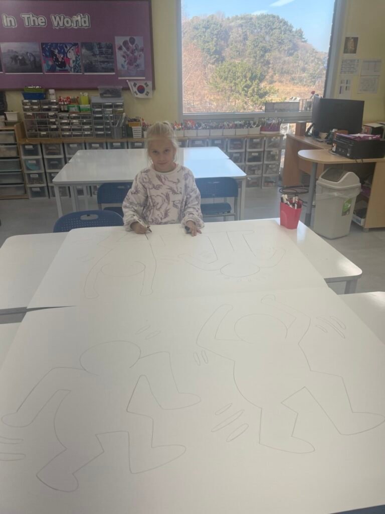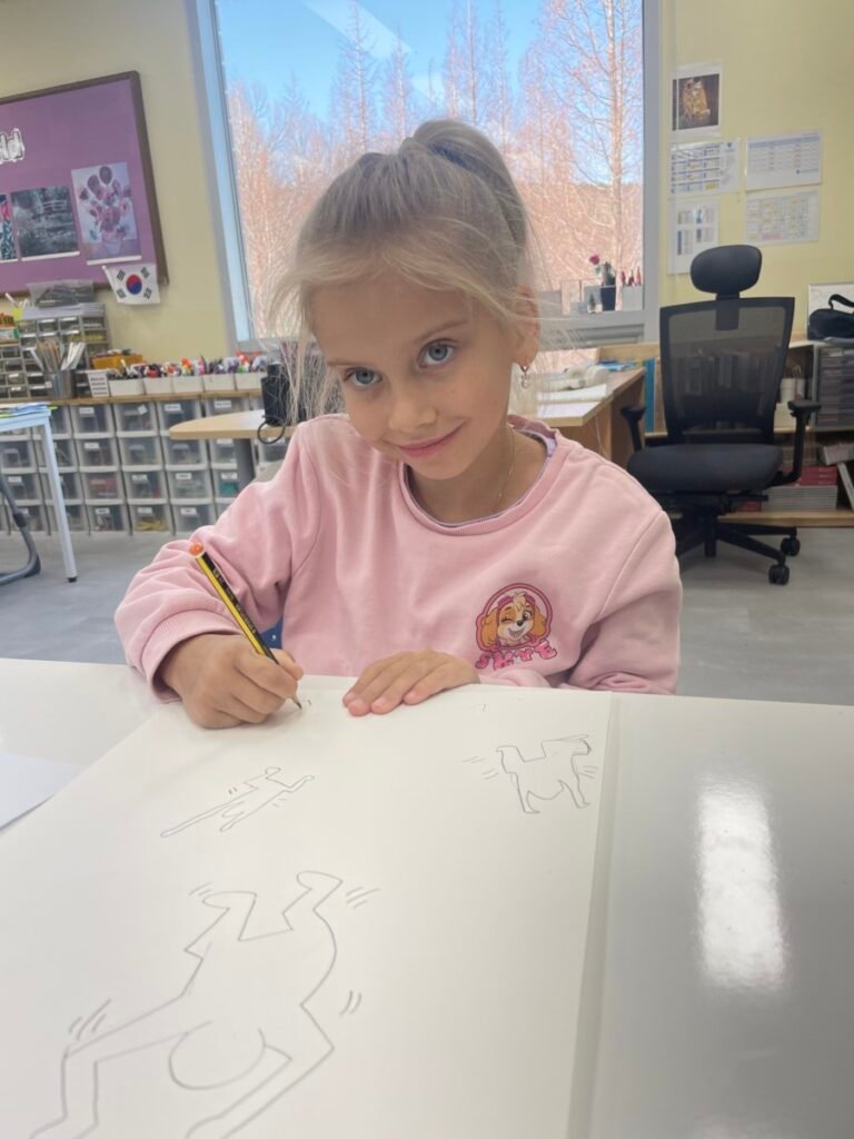 This week, the year1-2 kids explored the artwork of Keith Haring, focusing on how he showed movement using simple figures and bold lines. After looking closely at his artworks, kids used their own bodies to act out different poses and movements, just like the energetic figures in Keith Haring’s work.