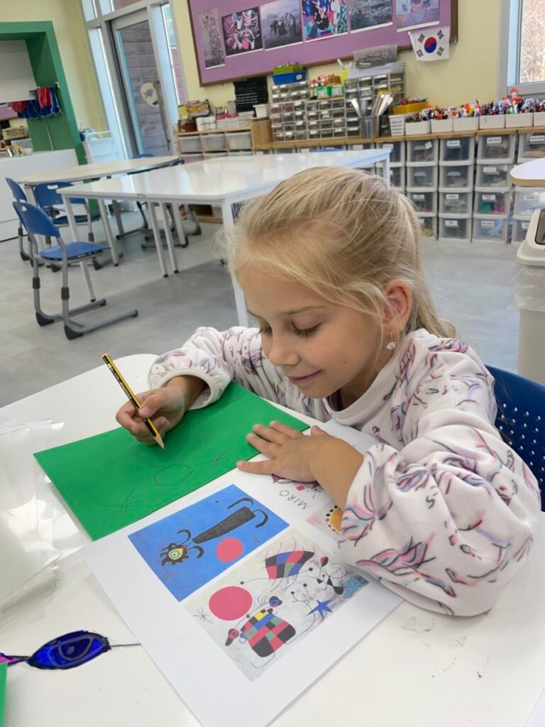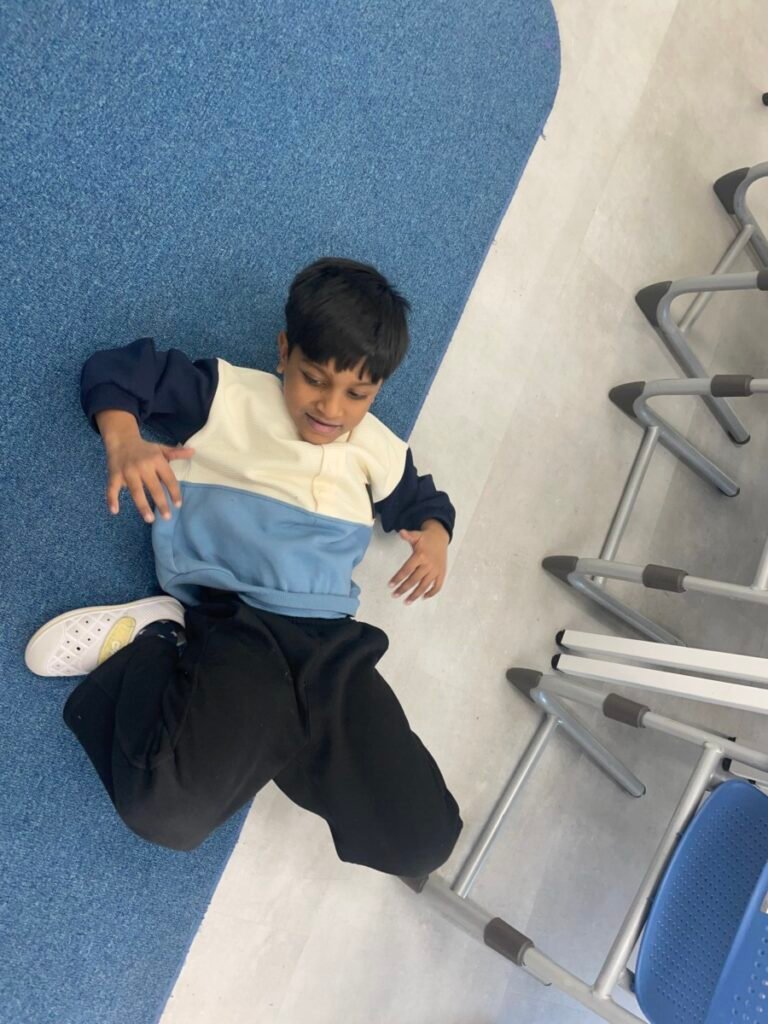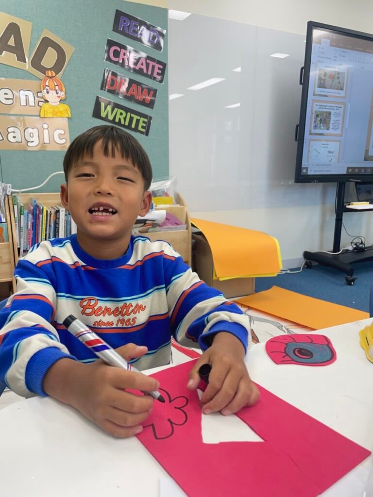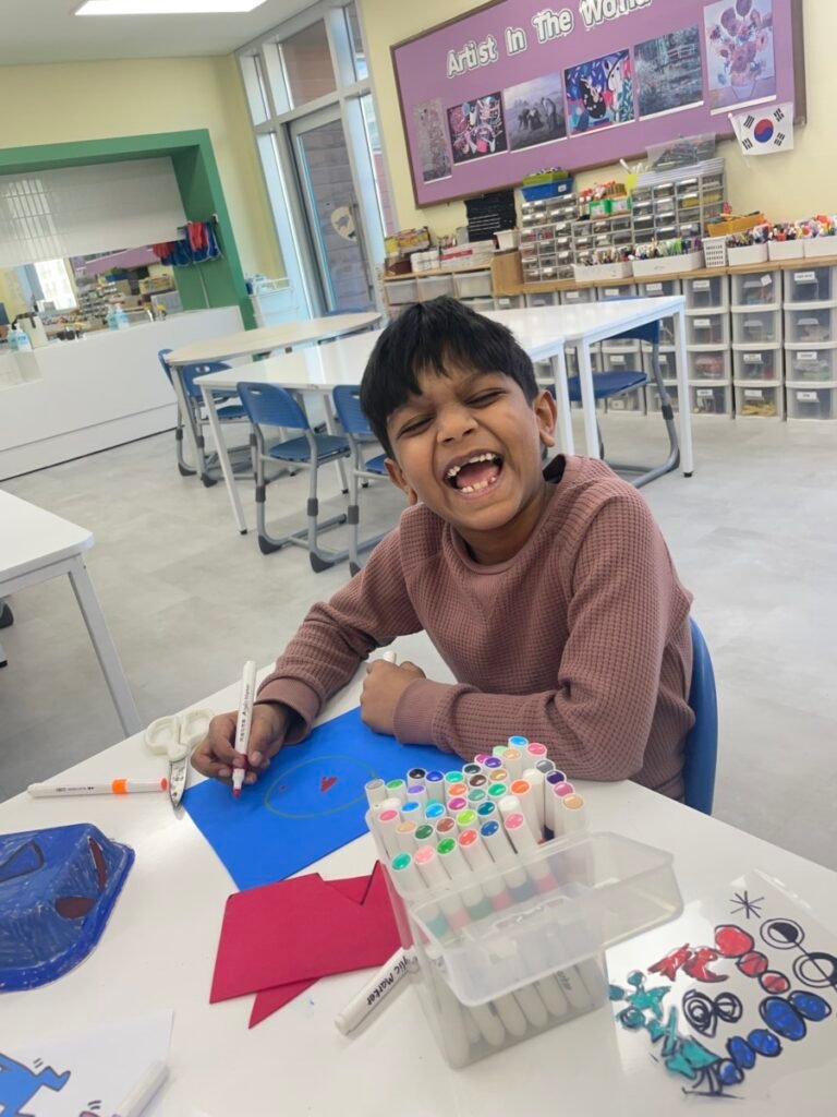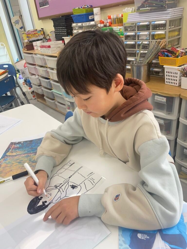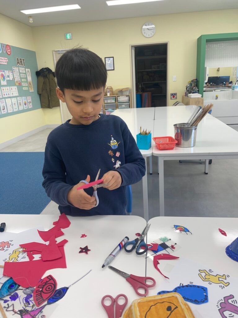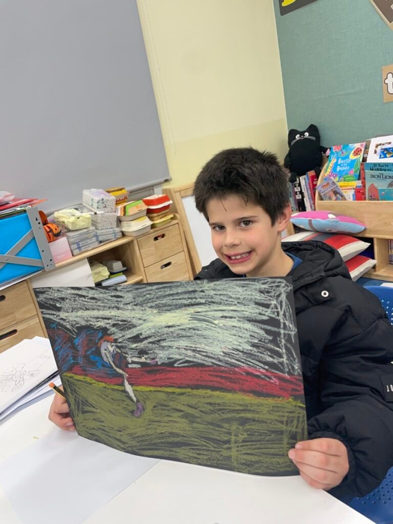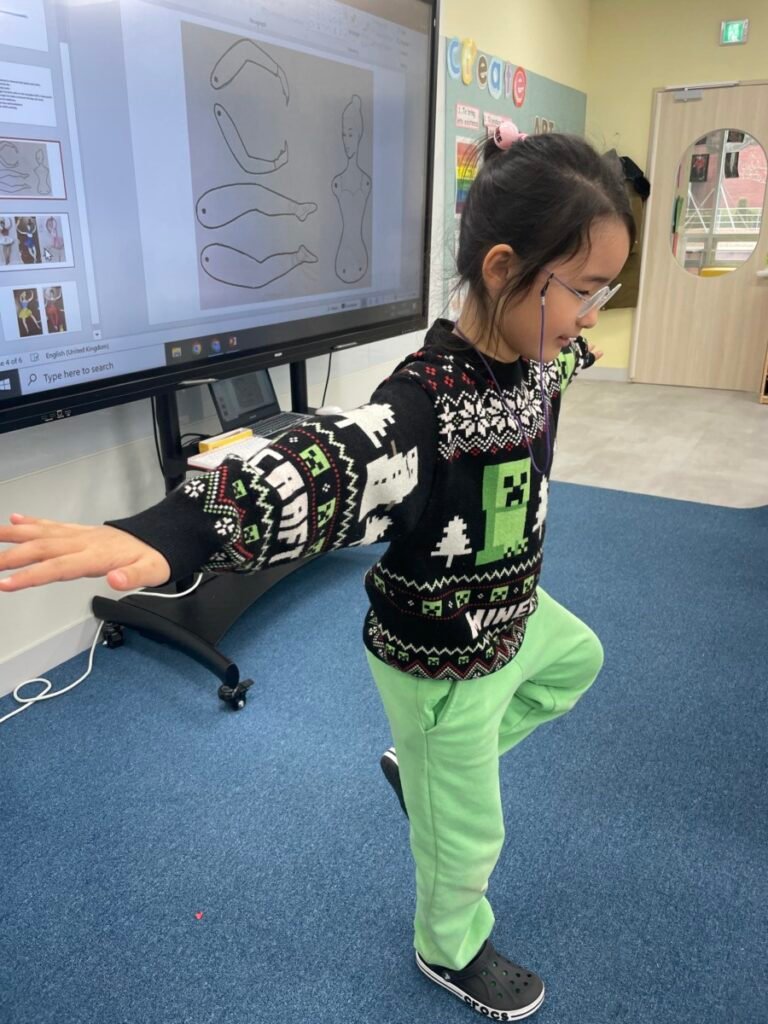 This week, the year1-2 kids explored the artwork of Keith Haring, focusing on how he showed movement using simple figures and bold lines. After looking closely at his artworks, kids used their own bodies to act out different poses and movements, just like the energetic figures in Keith Haring’s work.