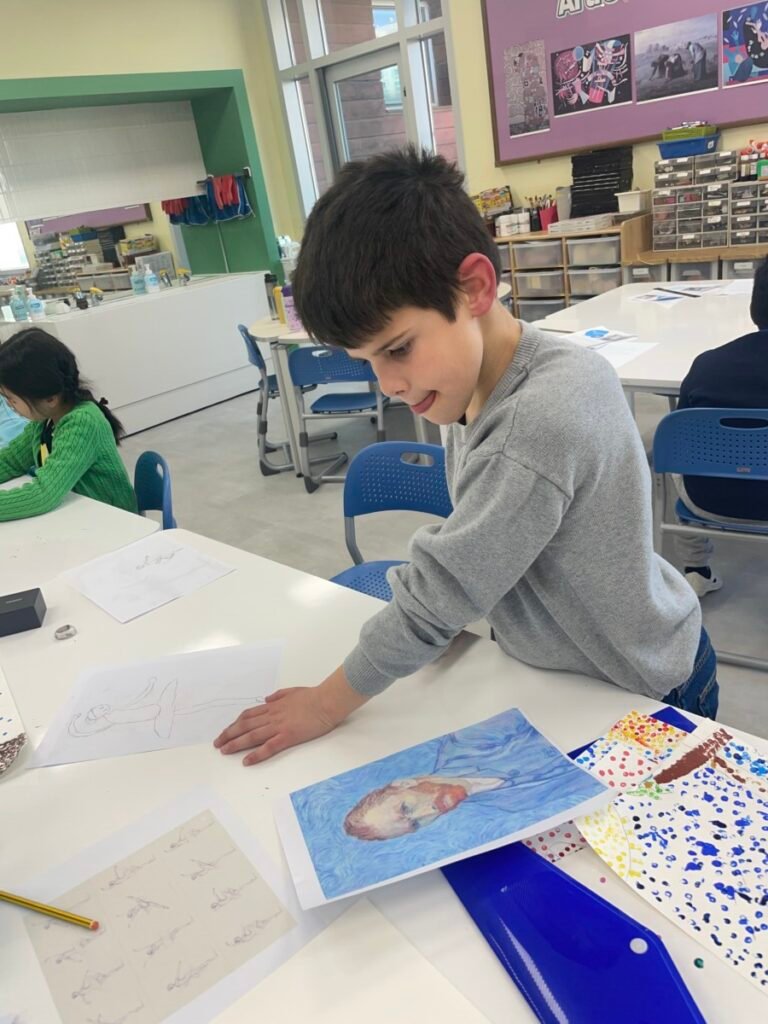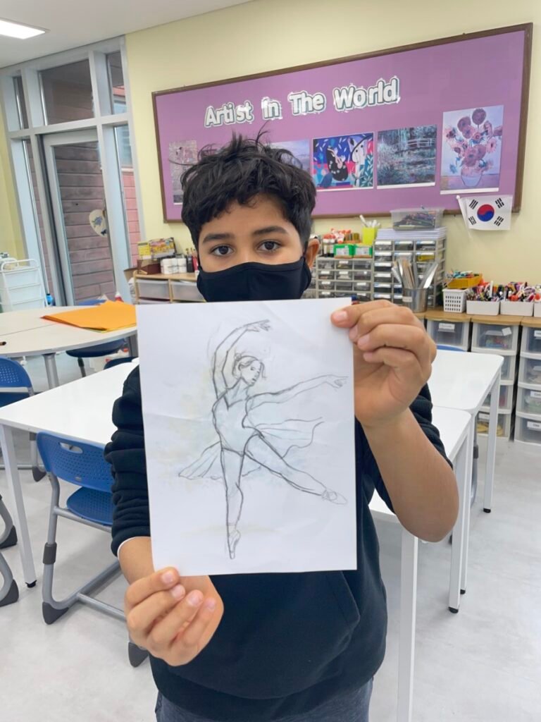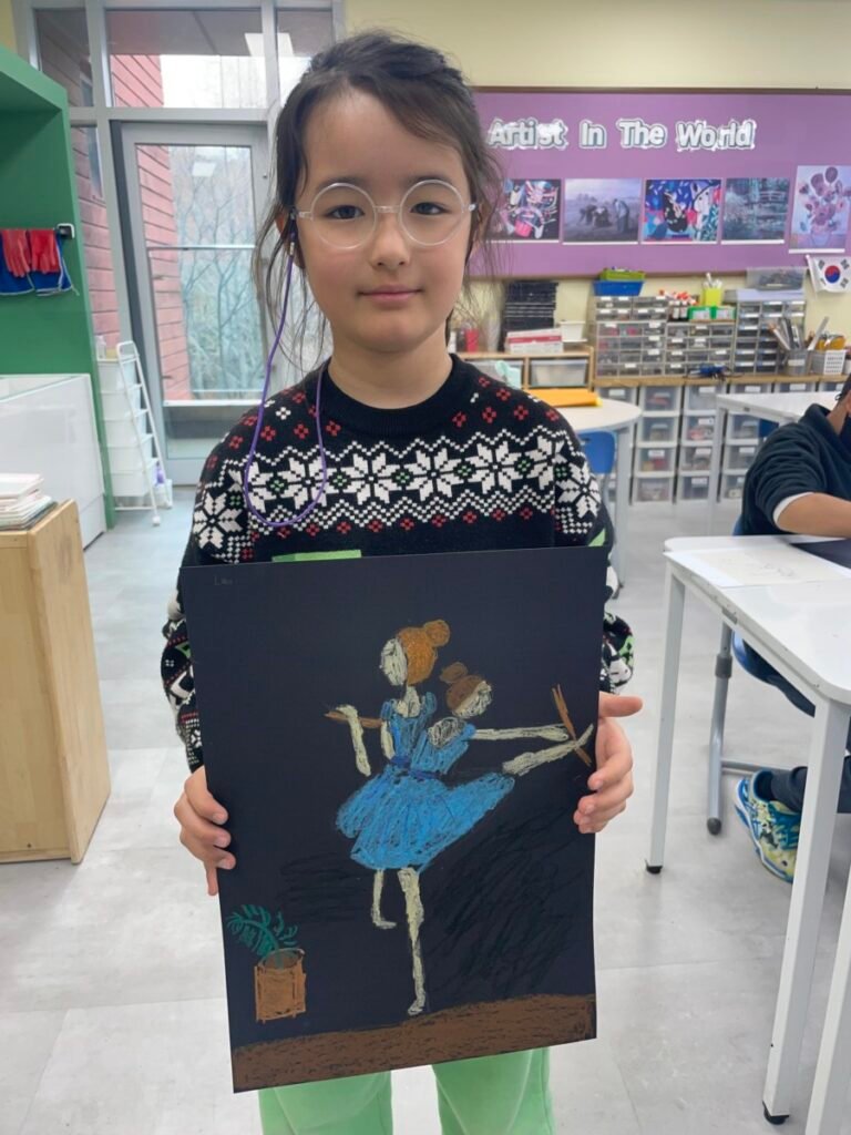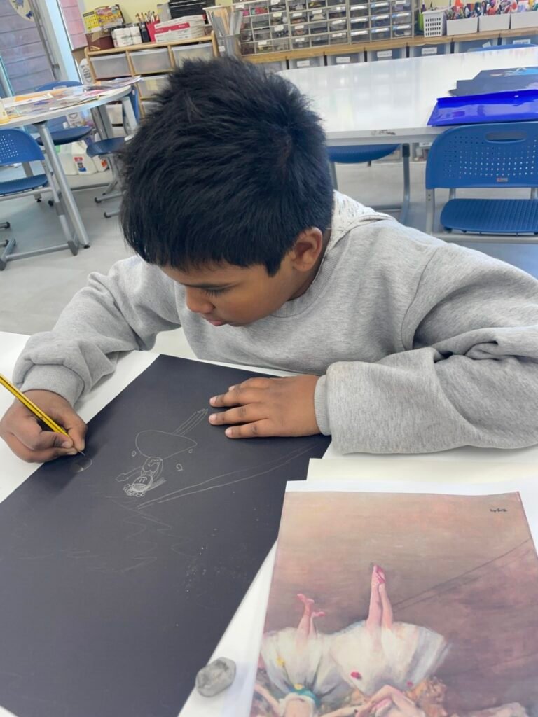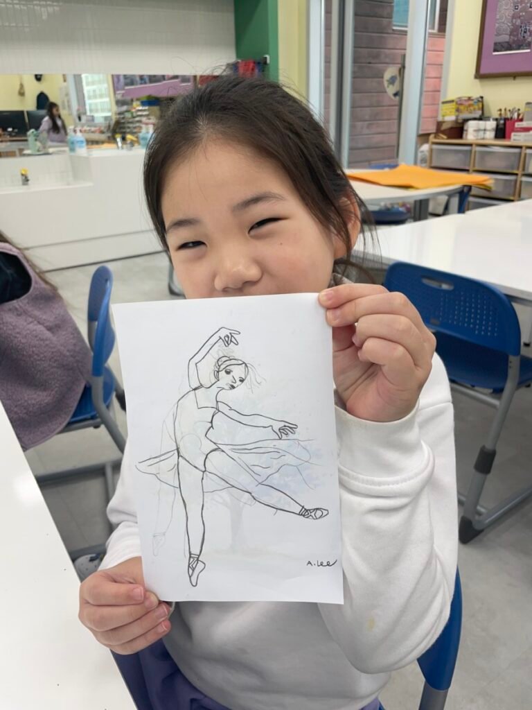 Students who finished their Pointillism pieces explored the ballet paintings of Edgar Degas. They observed how Degas captured movement and gesture, then practiced expressing motion through drawing. Students also shared their thoughts and discussed the artworks they found most interesting.