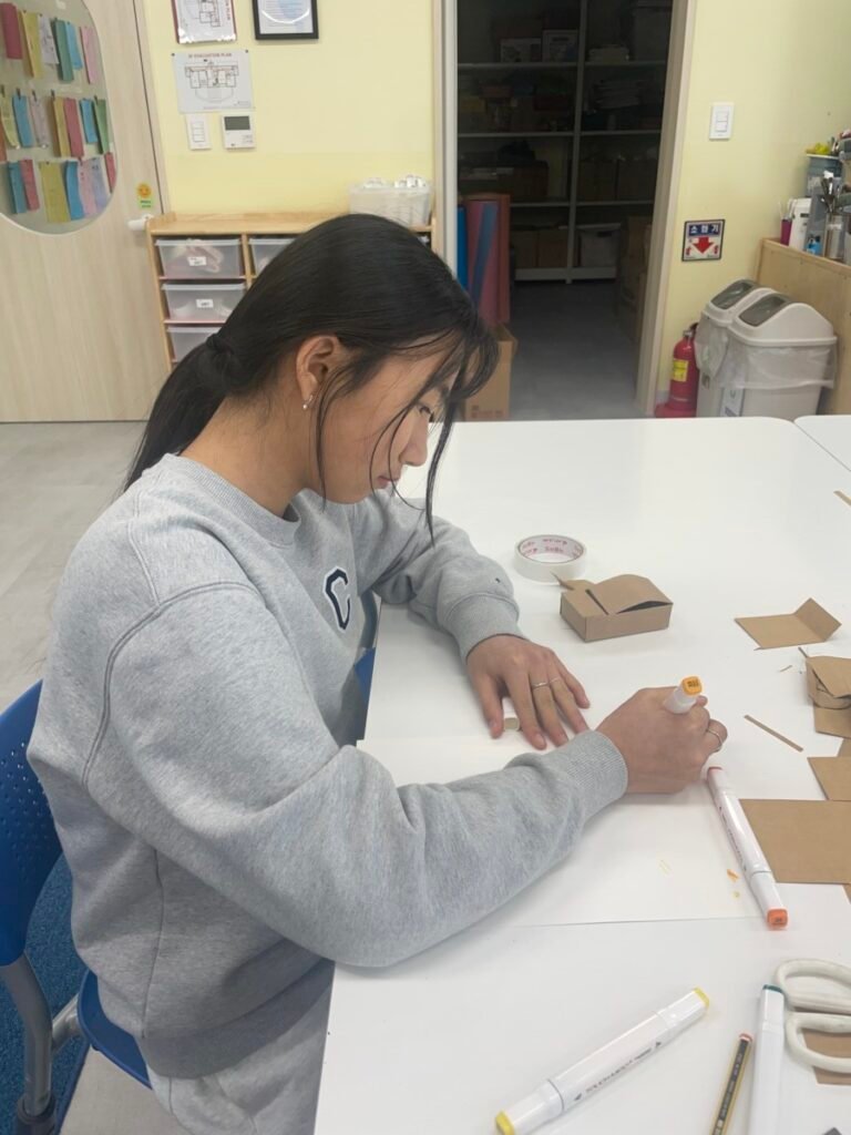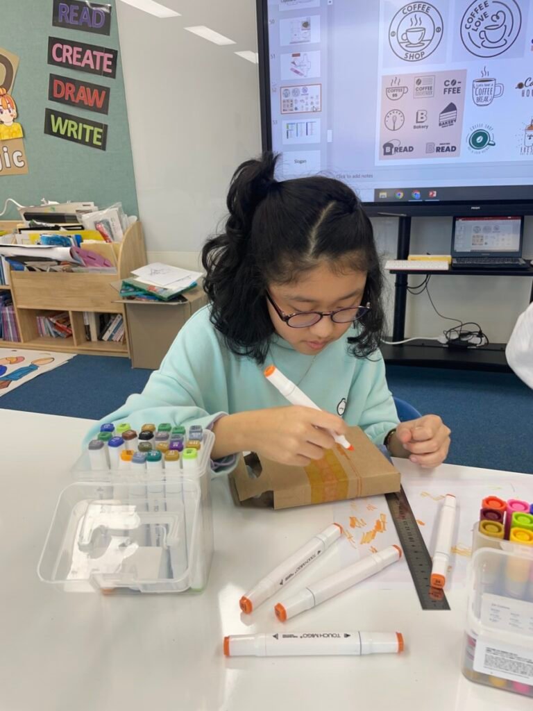 Students who completed their hamburger box designs began a new challenge: designing a cup carrier to accompany their burger packaging. This extension task encouraged them to think about how a consistent visual style can be applied across different packaging items, while also considering function and usability.
