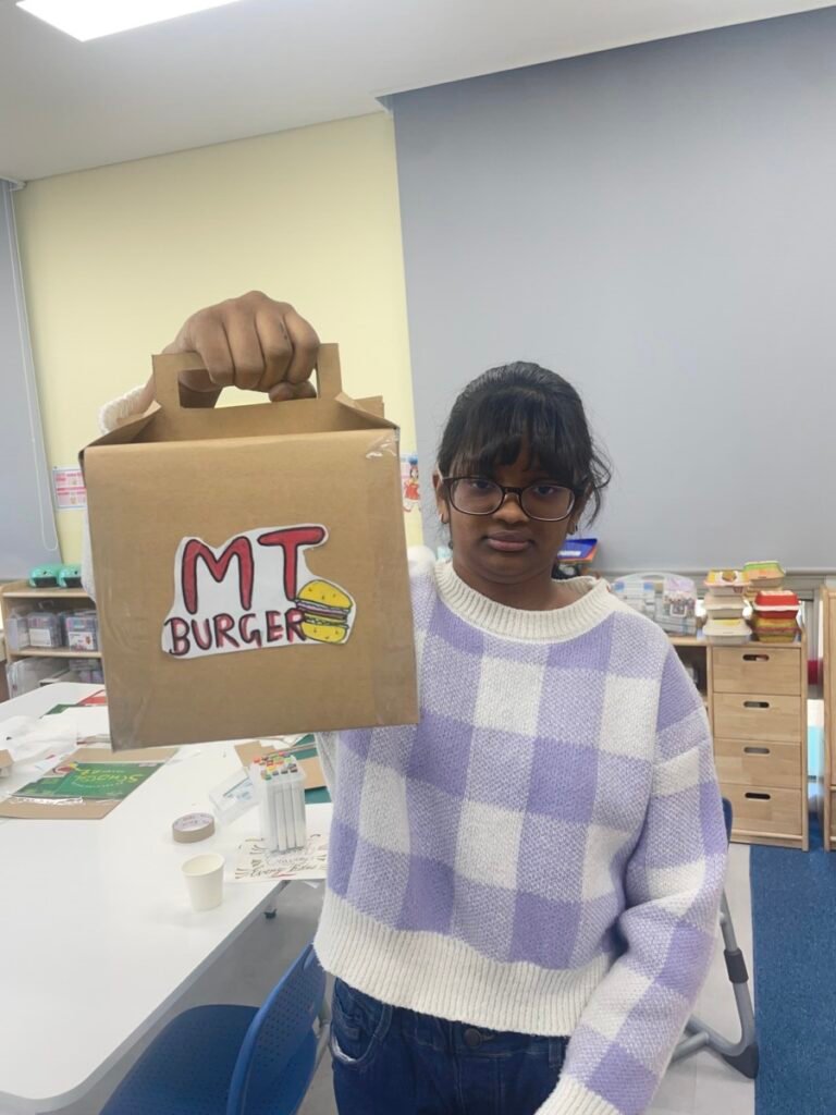 This week, Year 7–9 students continued developing their hamburger packaging projects, building on the brand identities they began last week. They worked further on refining their burger brand names, logos, slogans, and typography, carefully considering how layout, colour, and lettering work together to communicate a clear and engaging brand identity.