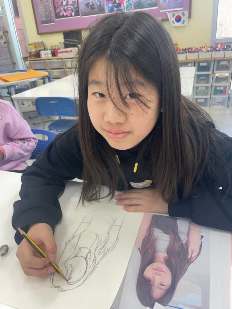 Students used photographs of themselves as reference, carefully observing shapes and outlines. Some students chose to place tracing or film paper over their printed photos to help capture clean lines and proportions, while others drew directly from observation. With extra time, students also experimented with creating pop art–inspired Julian Opie–style faces, further exploring bold lines and simplified forms.