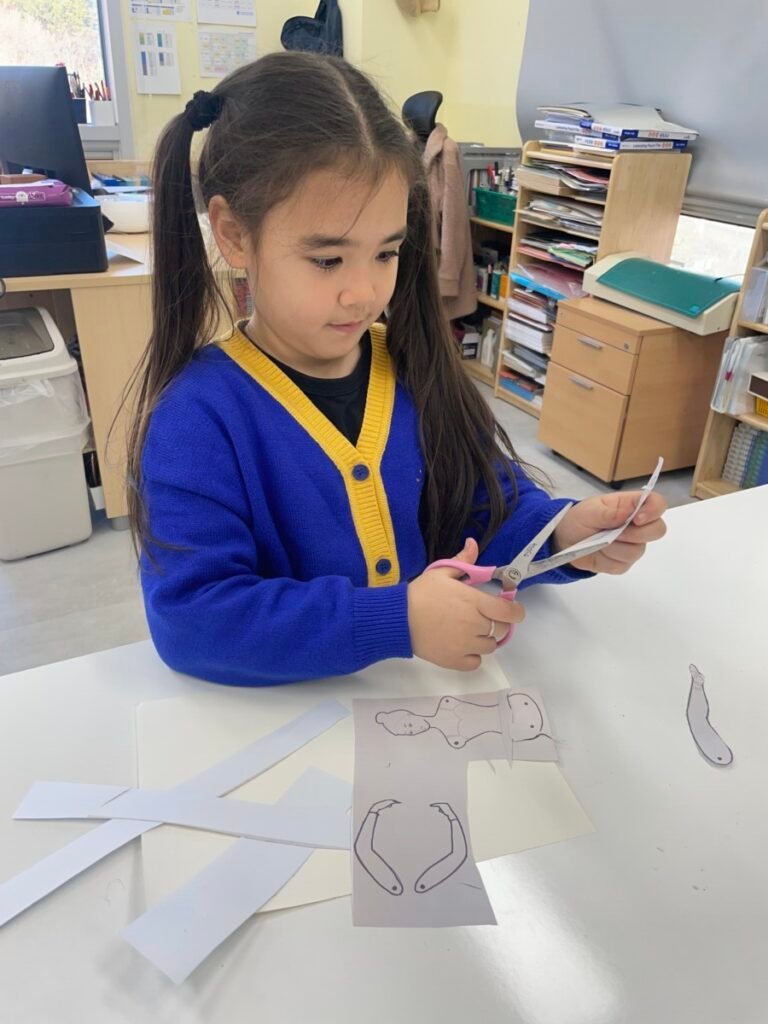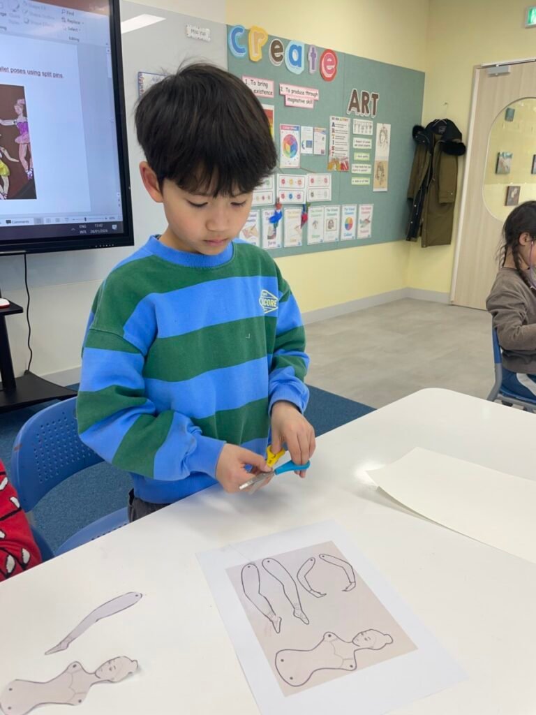 Using a prepared ballerina template, students cut out the arms and legs and connected the joints with split pins, allowing the ballerinas to move like real figures. By adjusting the angles of the arms and legs, students experimented with different ballet poses and gained a natural understanding of balance and movement in the human body.