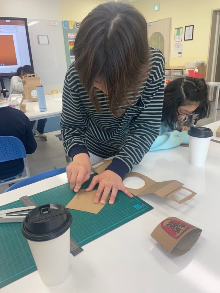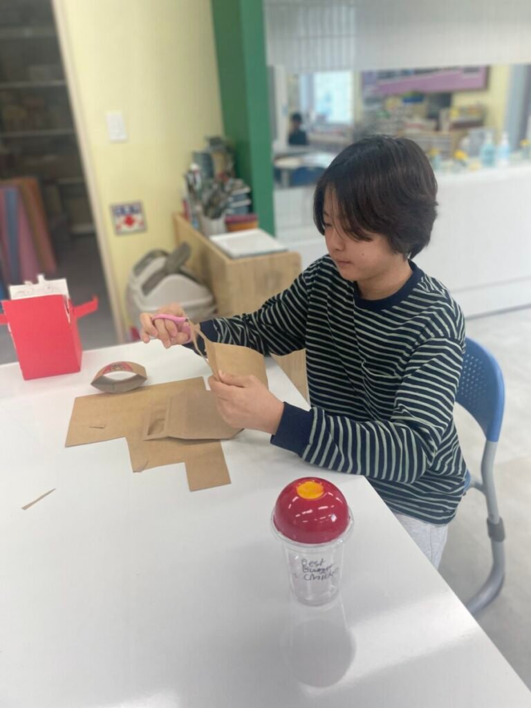 In addition to the hamburger container box, students expanded their designs to include a take-out drink cup and a matching cup carrier. This allowed them to think more deeply about how a consistent visual style can be applied across multiple packaging items, while also considering practical elements such as function and usability.