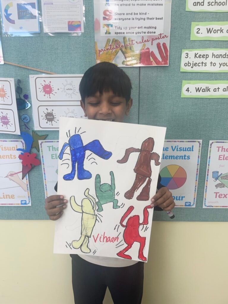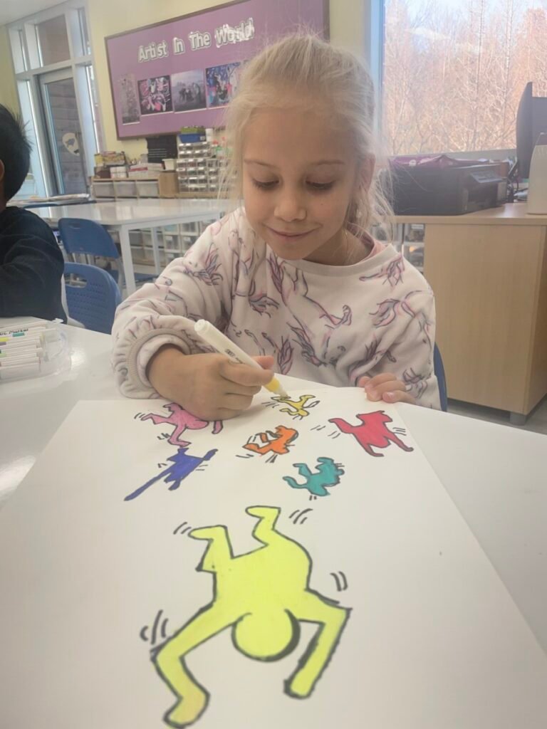 Inspired by Keith Haring’s style, kids drew human figures with bold outlines and filled them with bright, colourful colours. They practiced showing many different movements through simple shapes and playful poses.