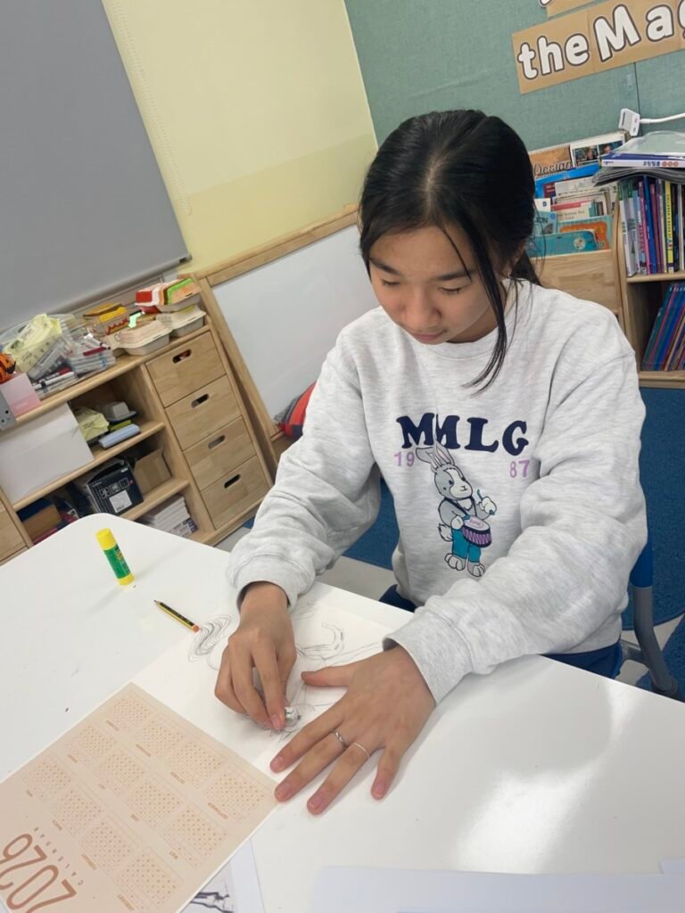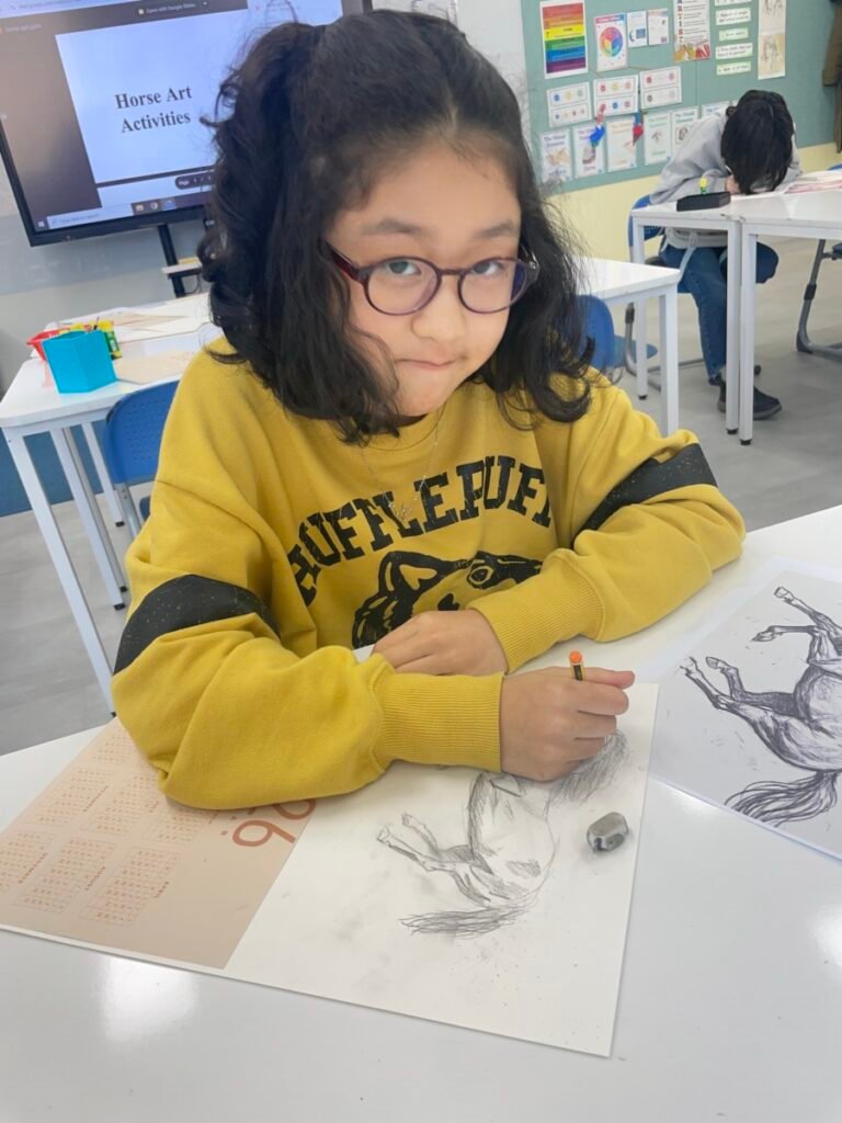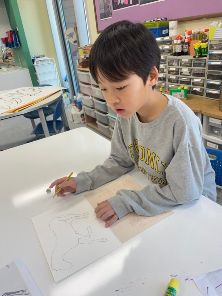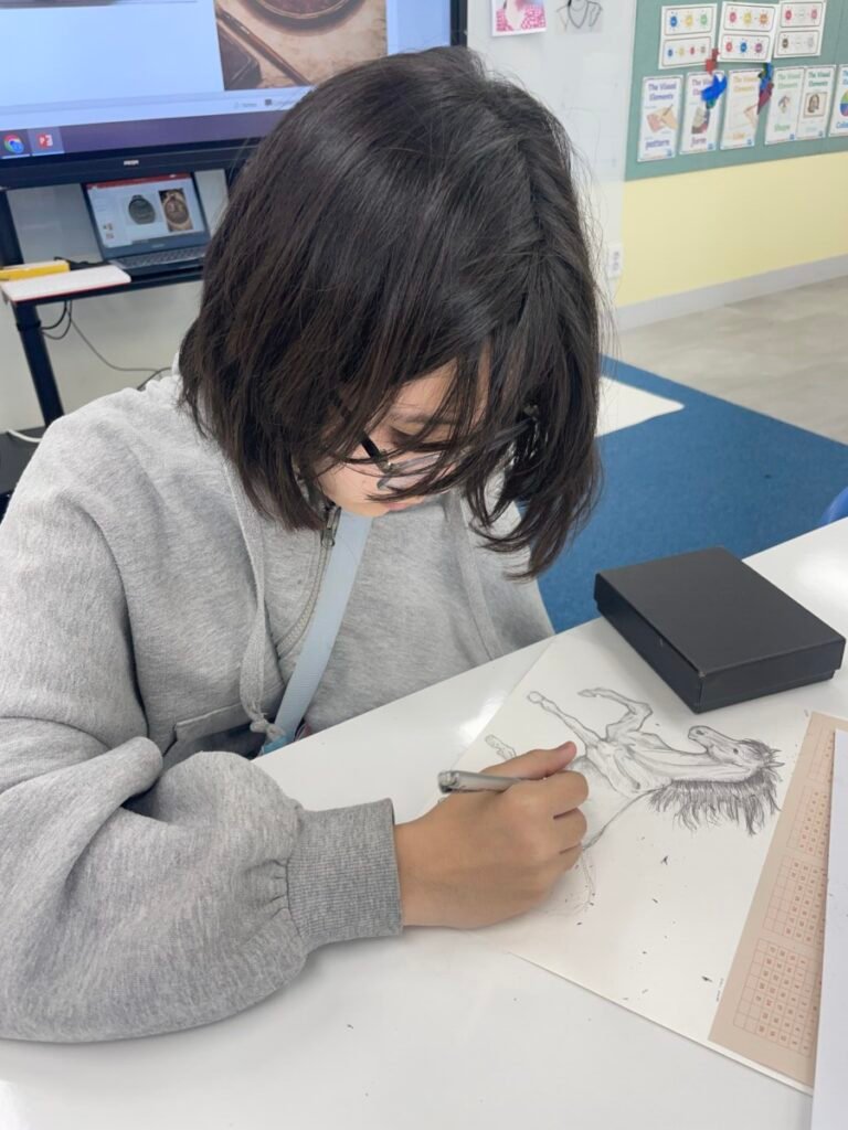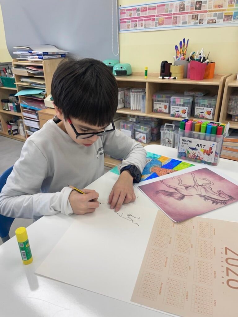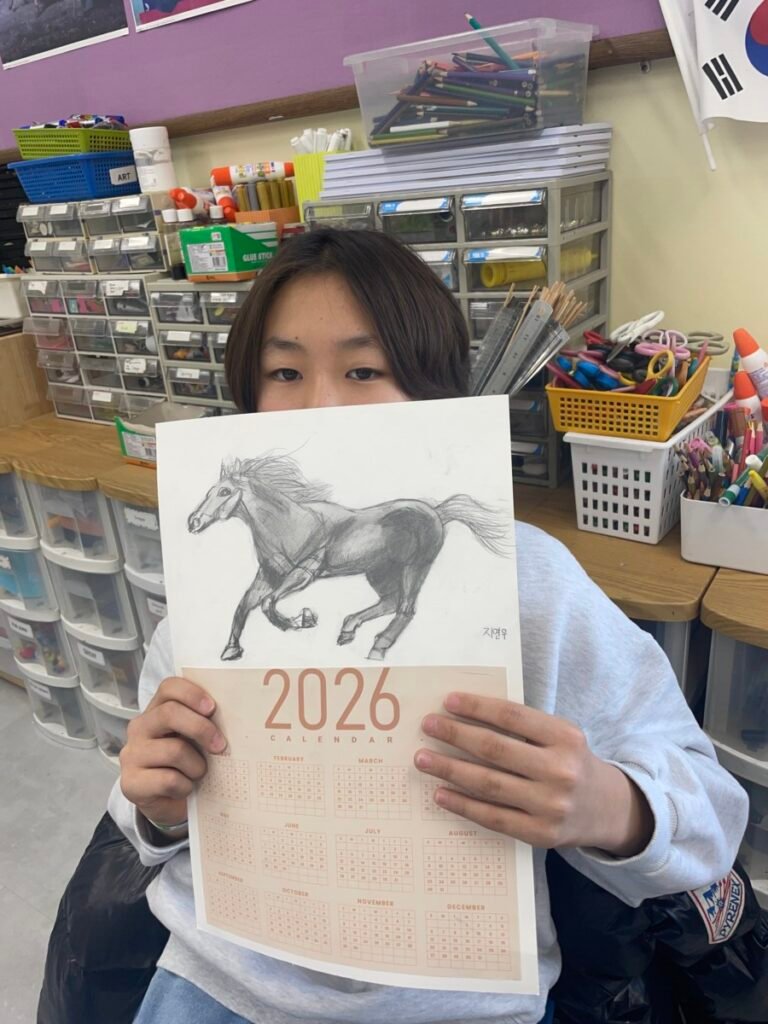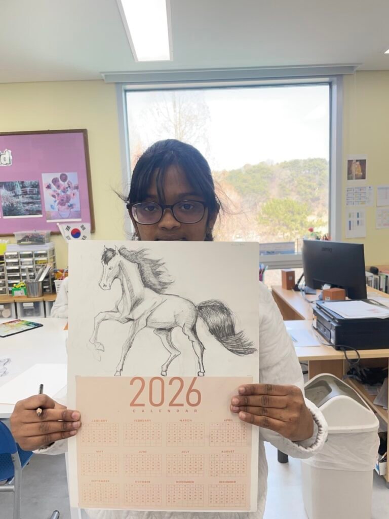 This week, in celebration of the 2026 Lunar New Year, UHIS conducted a variety of art activities under the theme “The Year of the Red Horse.” Students used paper plates to create shaking horse crafts to explore movement, and also expressed horses in many creative ways through horse pencil drawings, horse-themed collage artworks, and painting horses on traditional Korean hanji paper. In addition, they observed the horse images on Mappae and learned about its role and historical meaning. Through this lesson, which incorporated traditional themes and a wide range of materials, students learned how to express the form and movement of horses while also developing a greater interest in Korean culture.