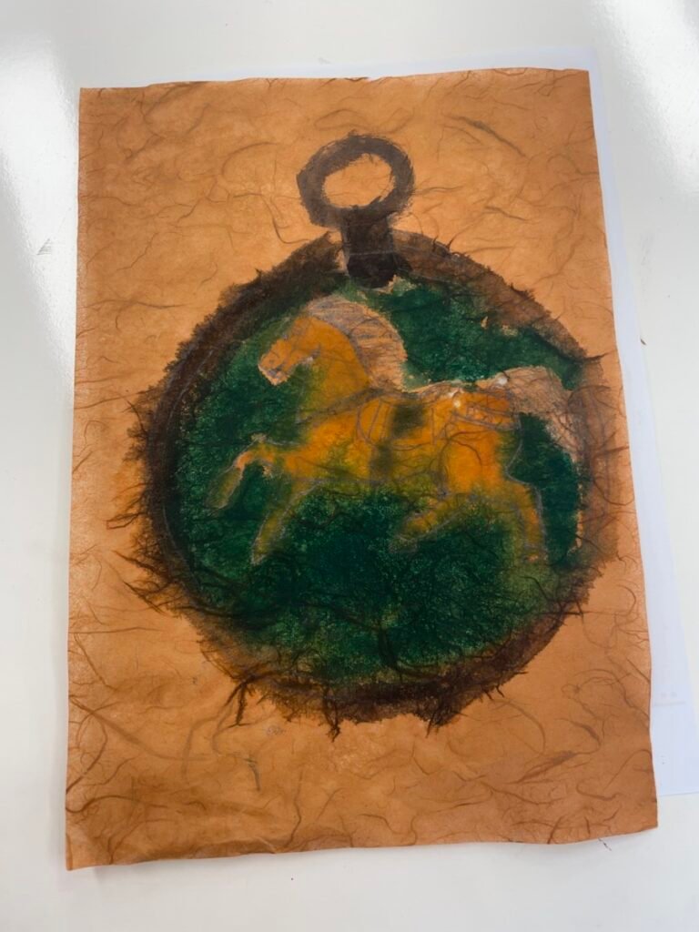 Students used paper plates to create shaking horse crafts to explore movement, and also expressed horses in many creative ways through horse pencil drawings, horse-themed collage artworks, and painting horses on traditional Korean hanji paper. In addition, they observed the horse images on Mappae and learned about its role and historical meaning.