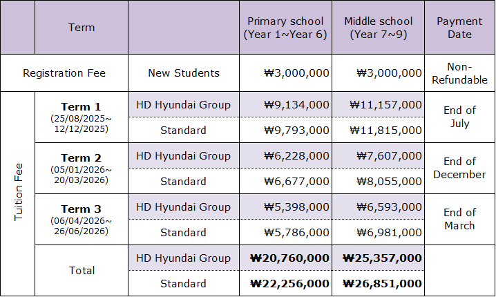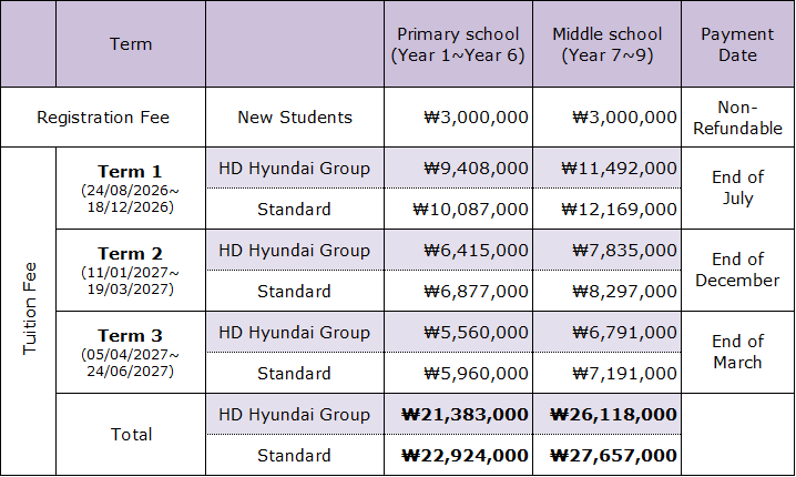 Ulsan Hyundai International School operates on a three-term basis and invoices for school fees will be issued three times each year, approximately one calendar month prior to the payment date. Payment, in Korean won, must be made prior to the commencement of each school term.
