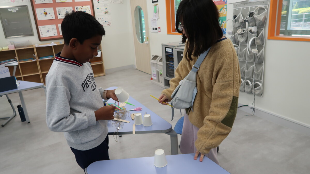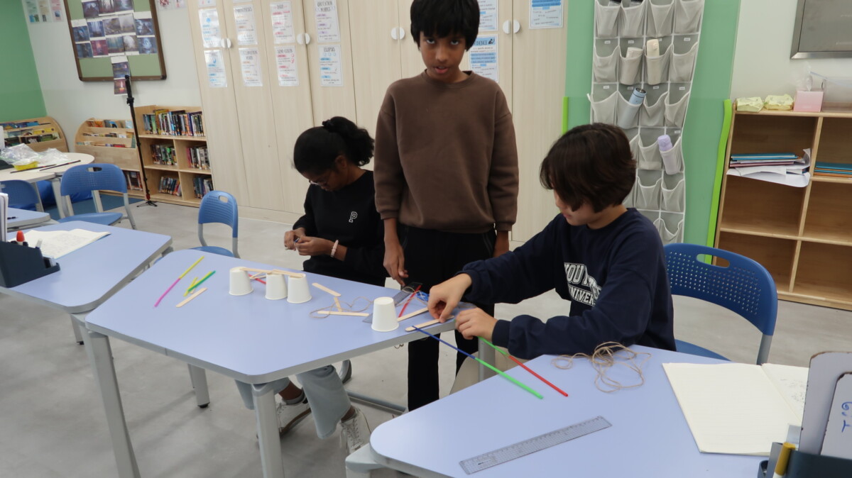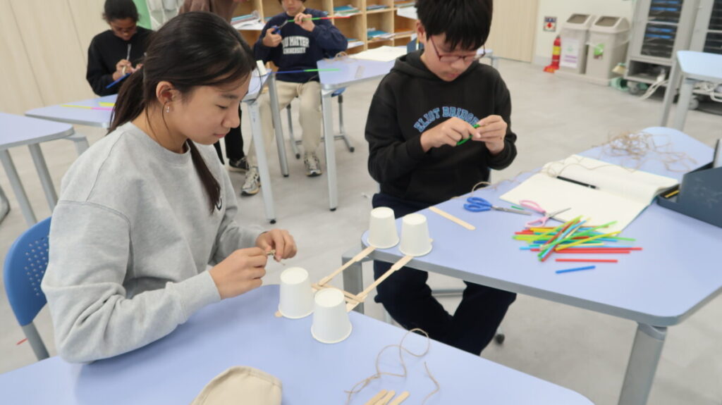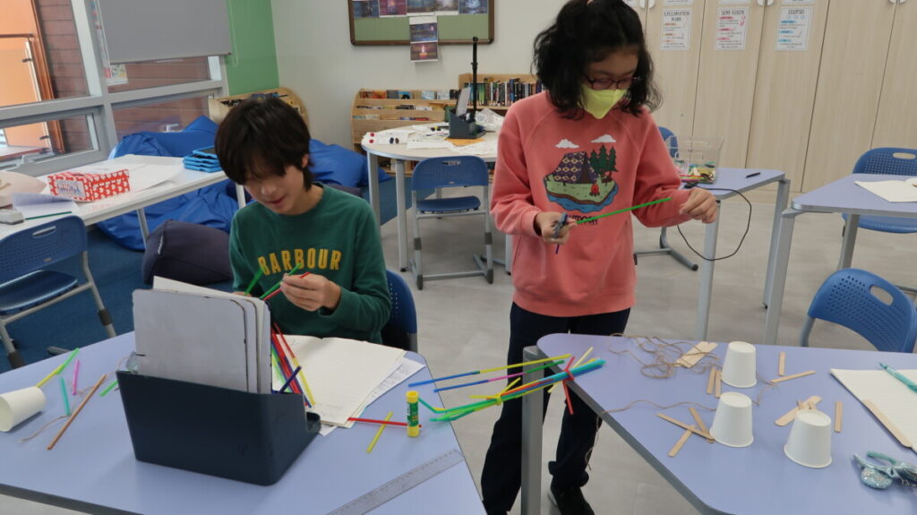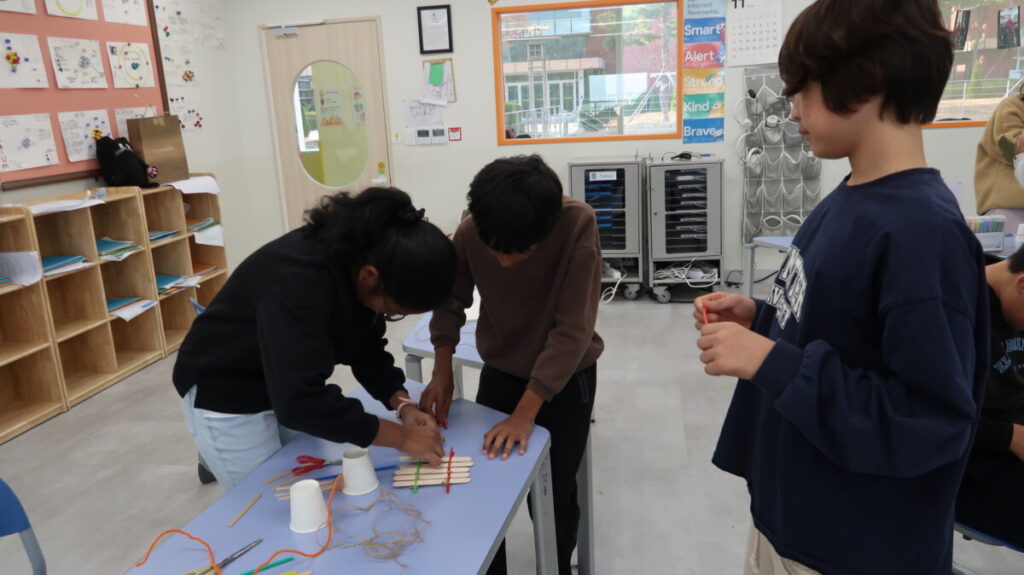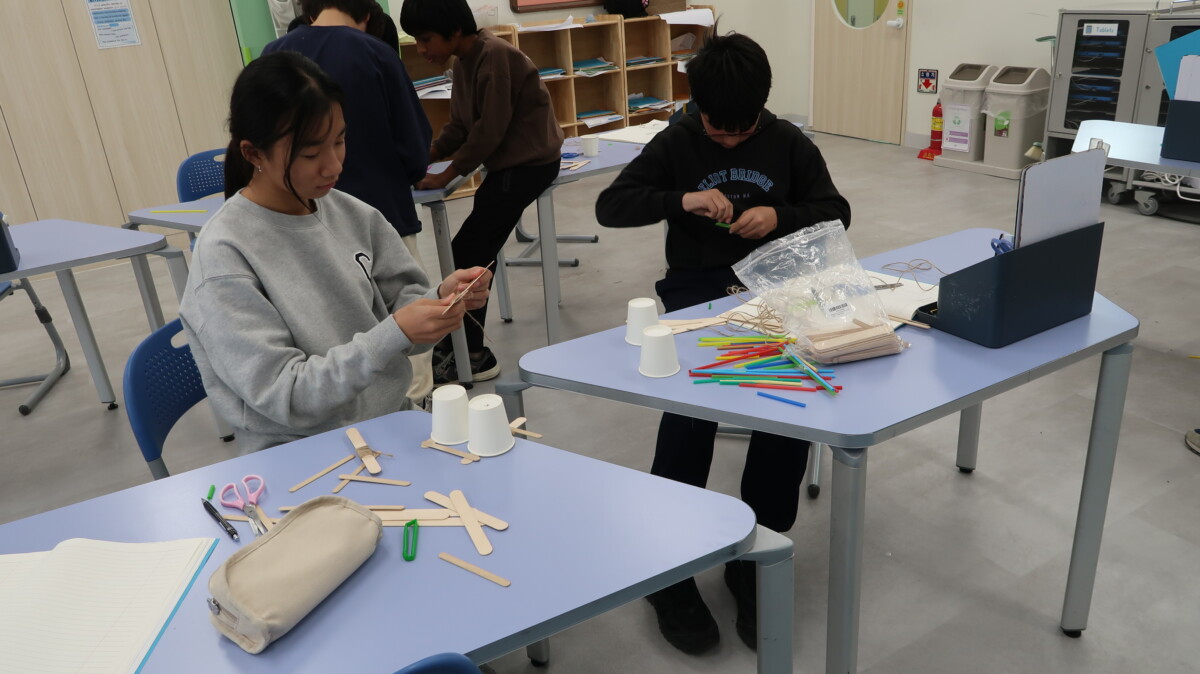 In geography, students learned how the War-Khasi people of Northeast India build “living bridges” by guiding the roots of rubber trees across rivers over many years. After exploring images and discussing why these bridges are needed during heavy monsoon floods, the students worked in groups to design and build their own mini root-bridge models using straws, string, and other materials. Then they created annotated sketches explaining how their designs mimicked the real bridges. The activity helped students understand how people use their environment creatively and sustainably to solve everyday challenges.
