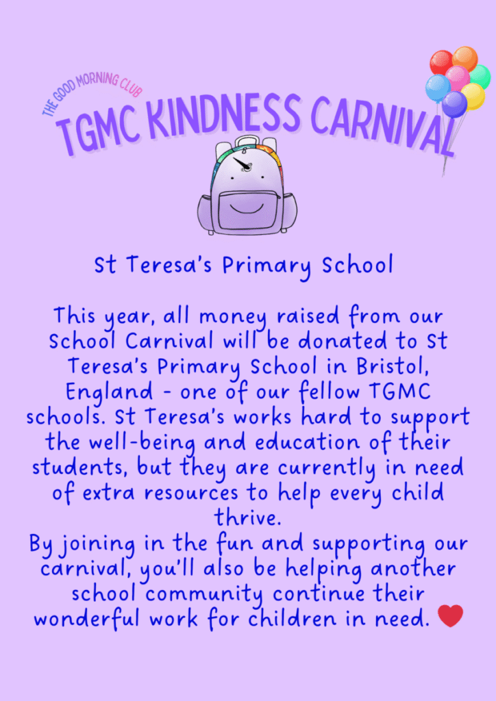 We are thrilled to announce our upcoming TGMC Kindness Carnival. This event will raise money for St Teresa’s Primary School in Bristol, UK, a fellow TGMC school working hard to support the well-being of their students.