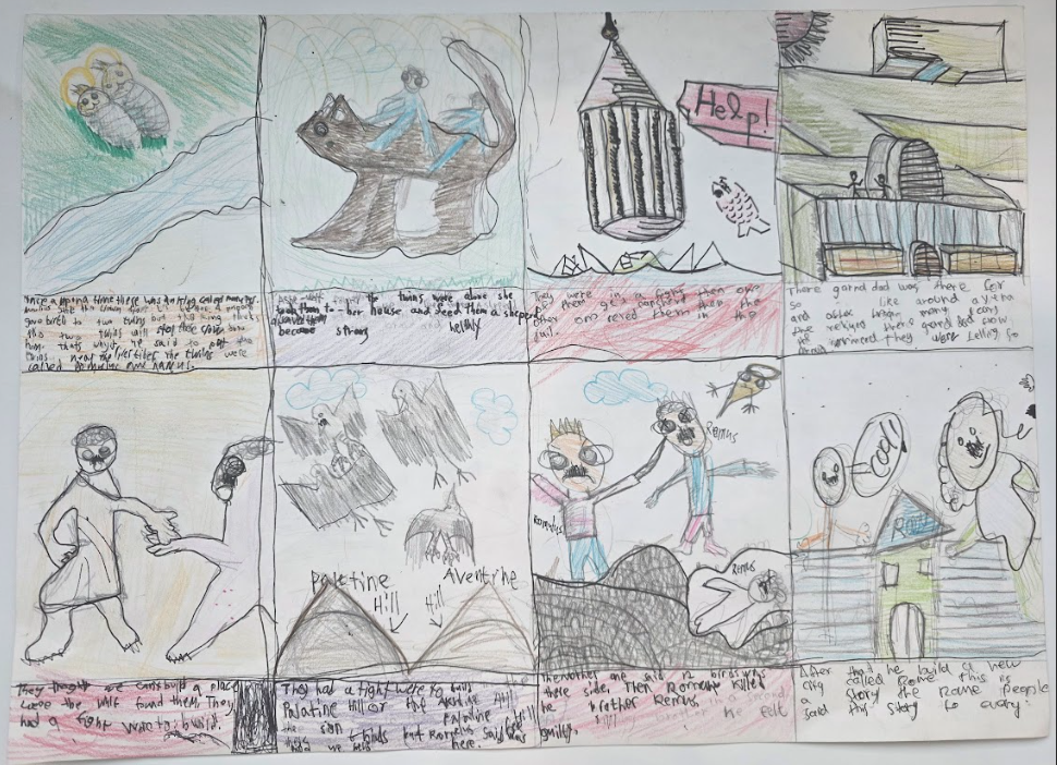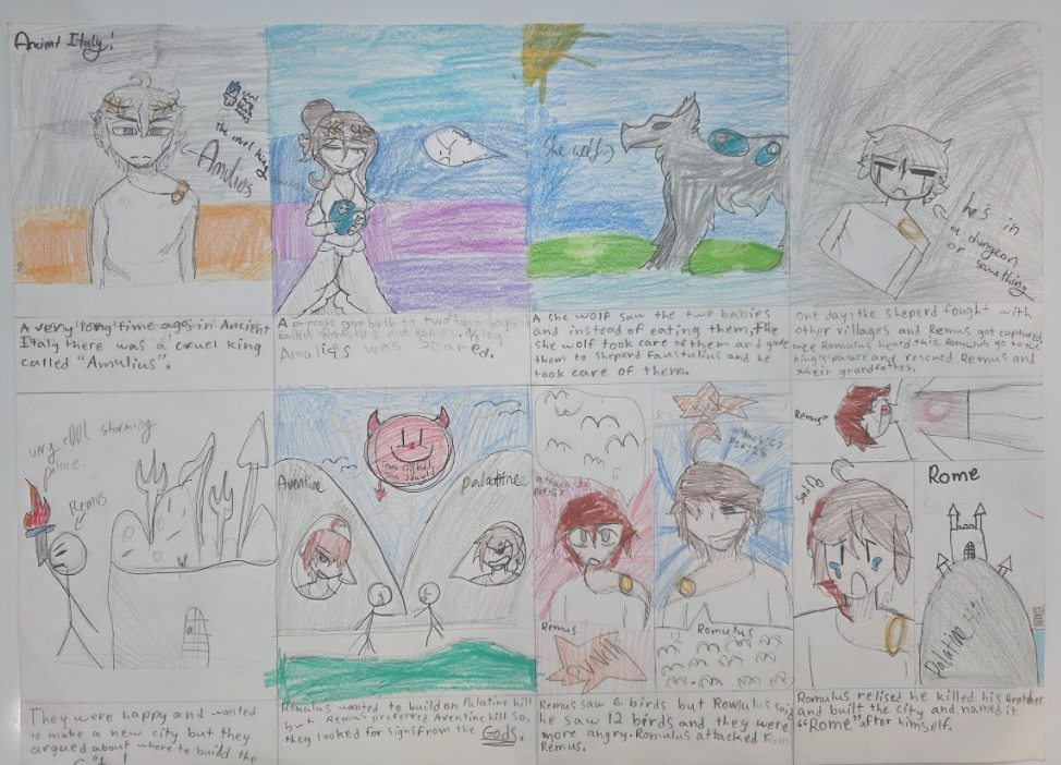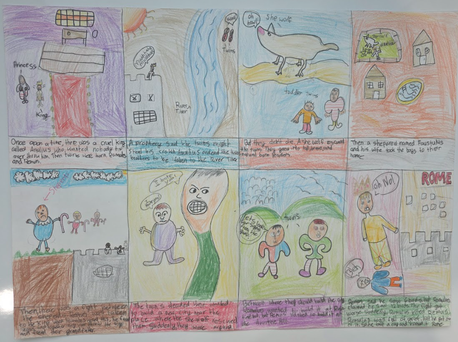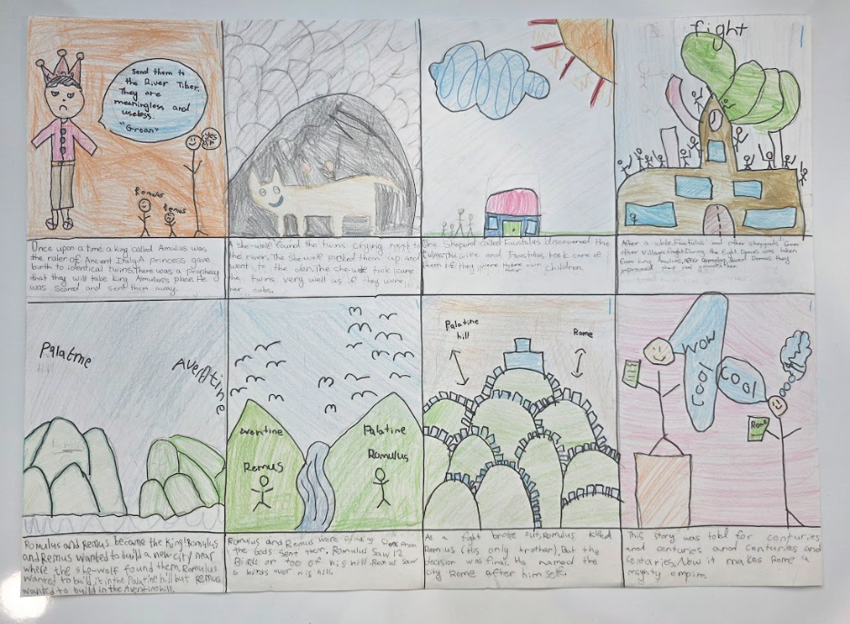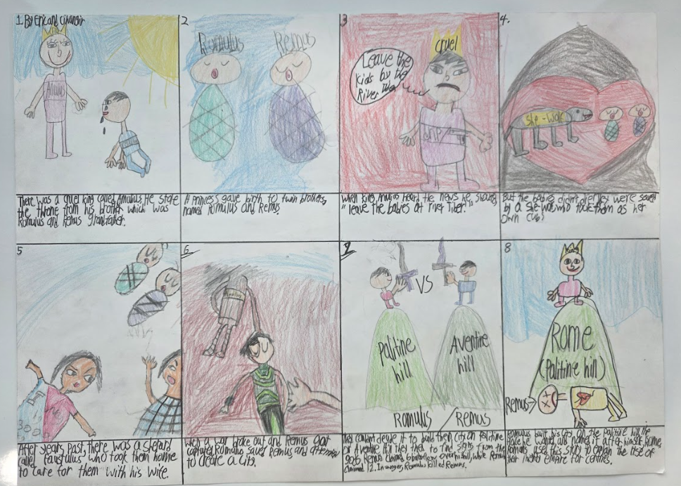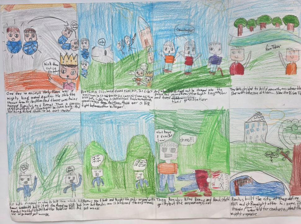 This week the students completed their comic book retellings of Romulus and Remus, and the results are absolutely fantastic. Each comic shows real creativity, a strong grasp of the story, and a growing confidence in presenting information visually.