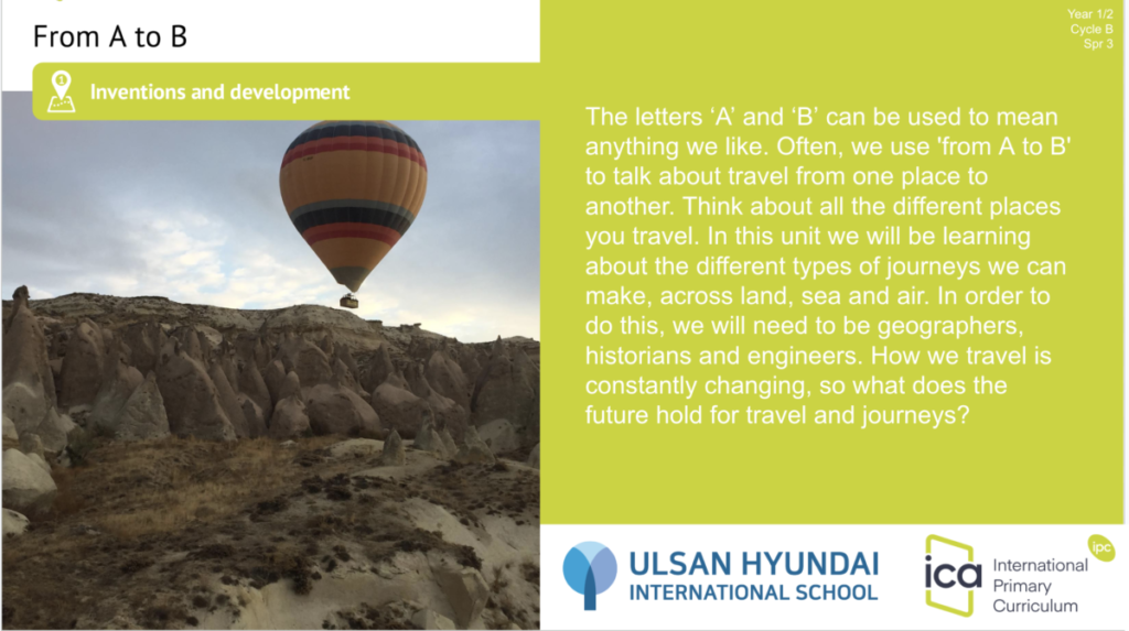 In Year 1/2, students are exploring From A to B, investigating different types of journeys across land, sea and air. They will think like geographers, historians and engineers as they discover how travel has changed over time and imagine what the future of transport might look like.