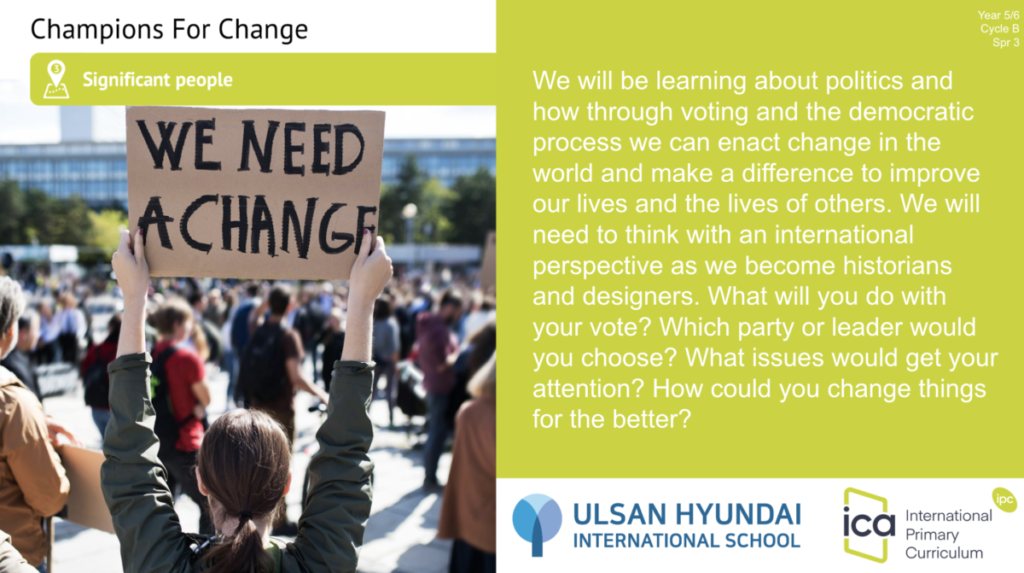 In Year 5/6, students are taking on the unit Champions for Change, examining how people and democratic processes can shape society. They will think critically about leadership, responsibility and how individuals can make a positive difference in the world around them.